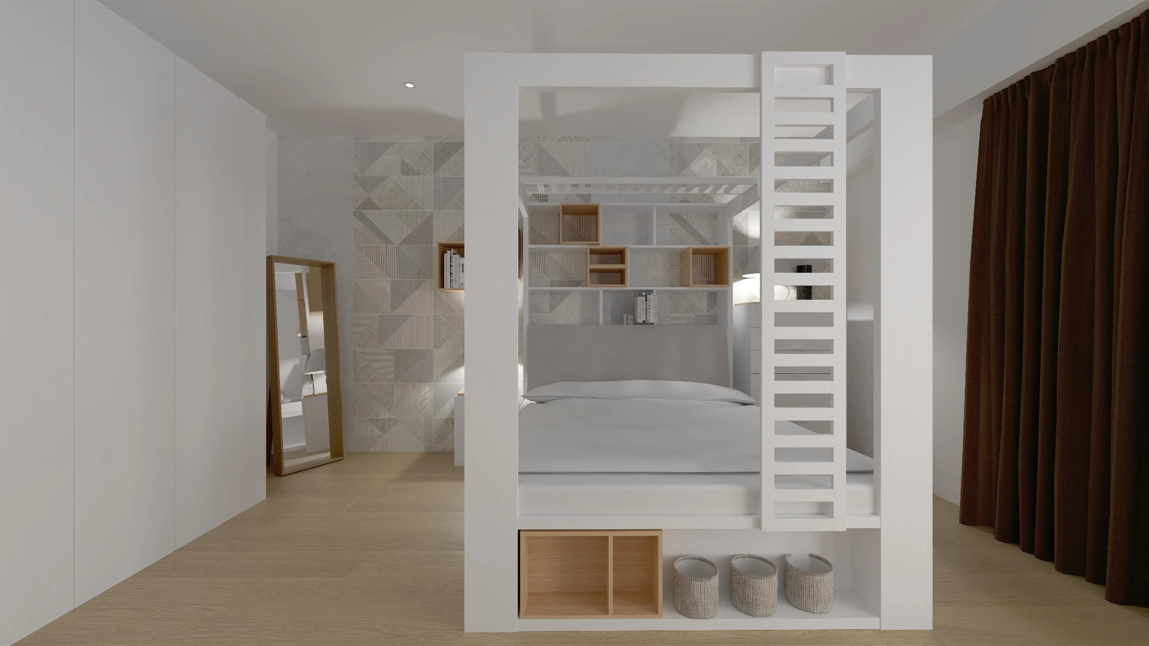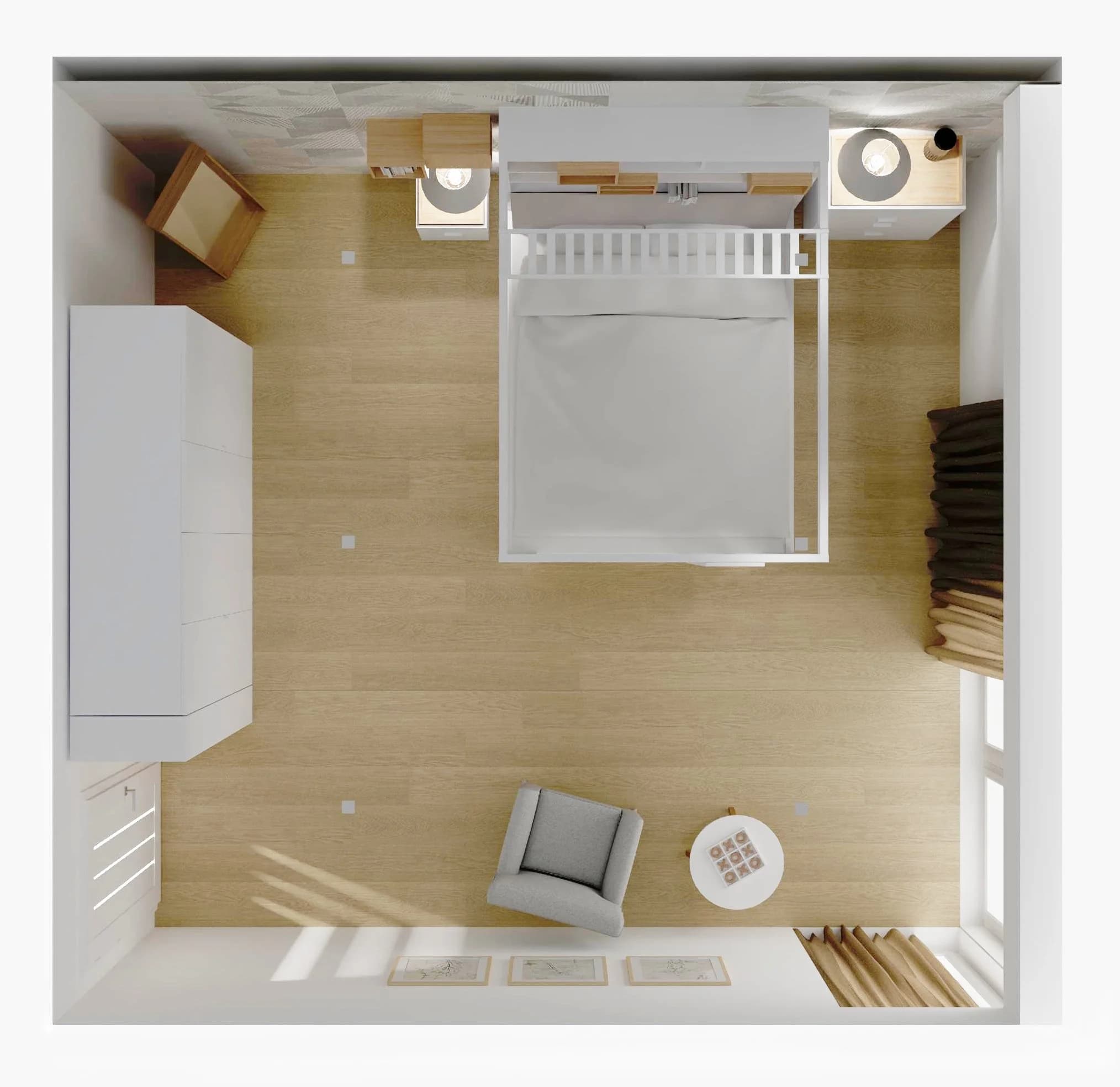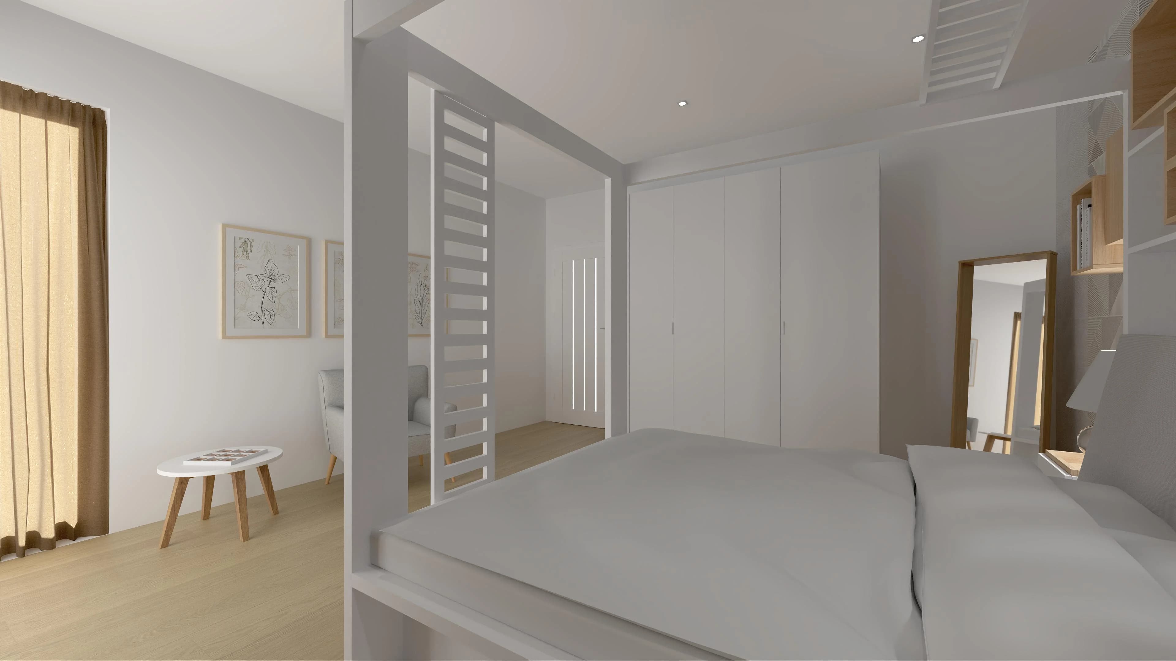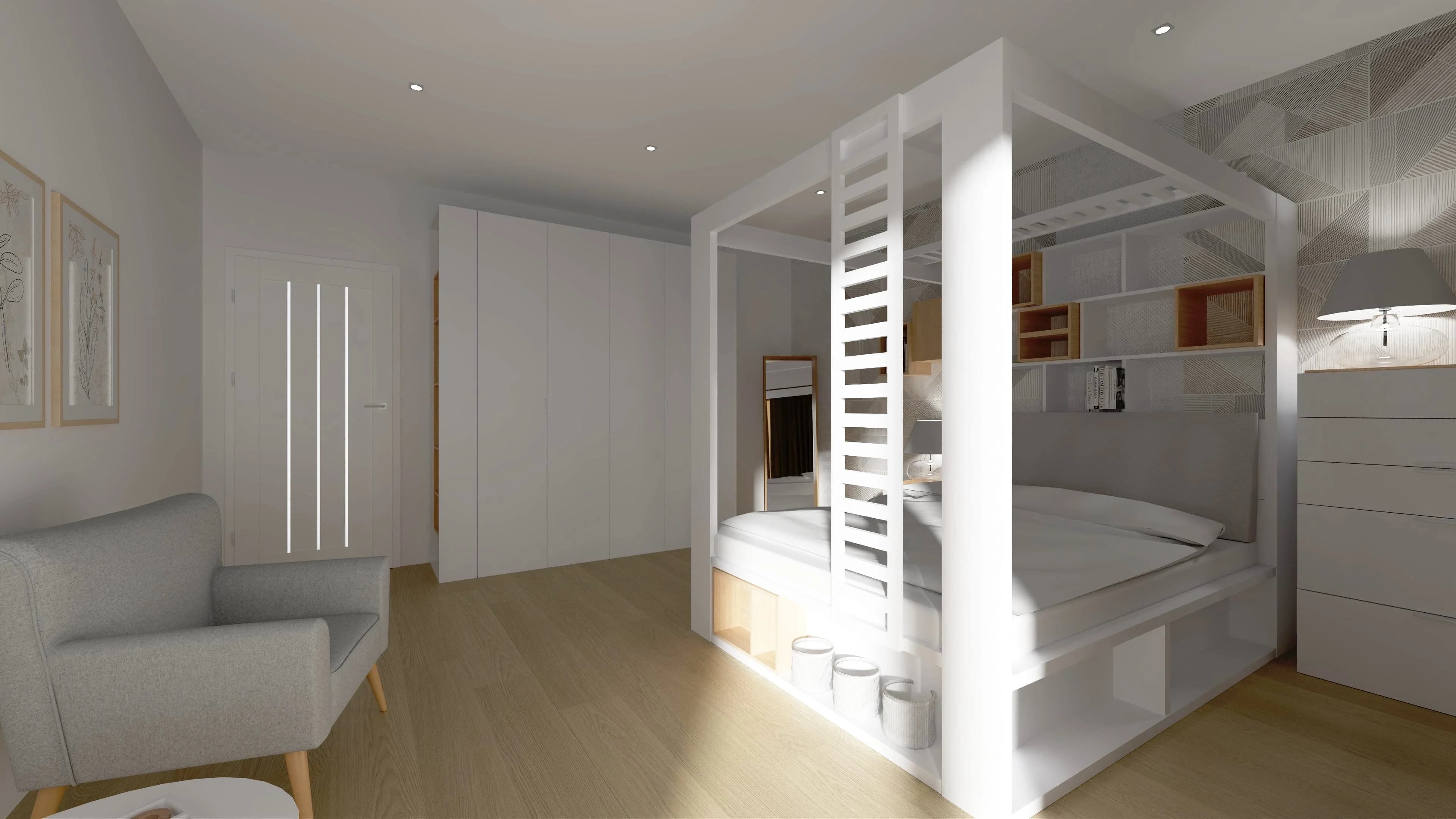 Ta sypialnia emanuje spokojem i zachęca do relaksu. Oazę odpoczynku stanowi funkcjonalne łóżko z baldachimem. Znalazło się miejsce także na kącik czytelniczy. Wysoka czterodrzwiowa szafa to spełnienie marzeń o garderobie. Jasną kolorystykę podkreślają panele z geometrycznym printem na ścianie, a ciepły akcent wprowadza podłoga z wzorem drewna.