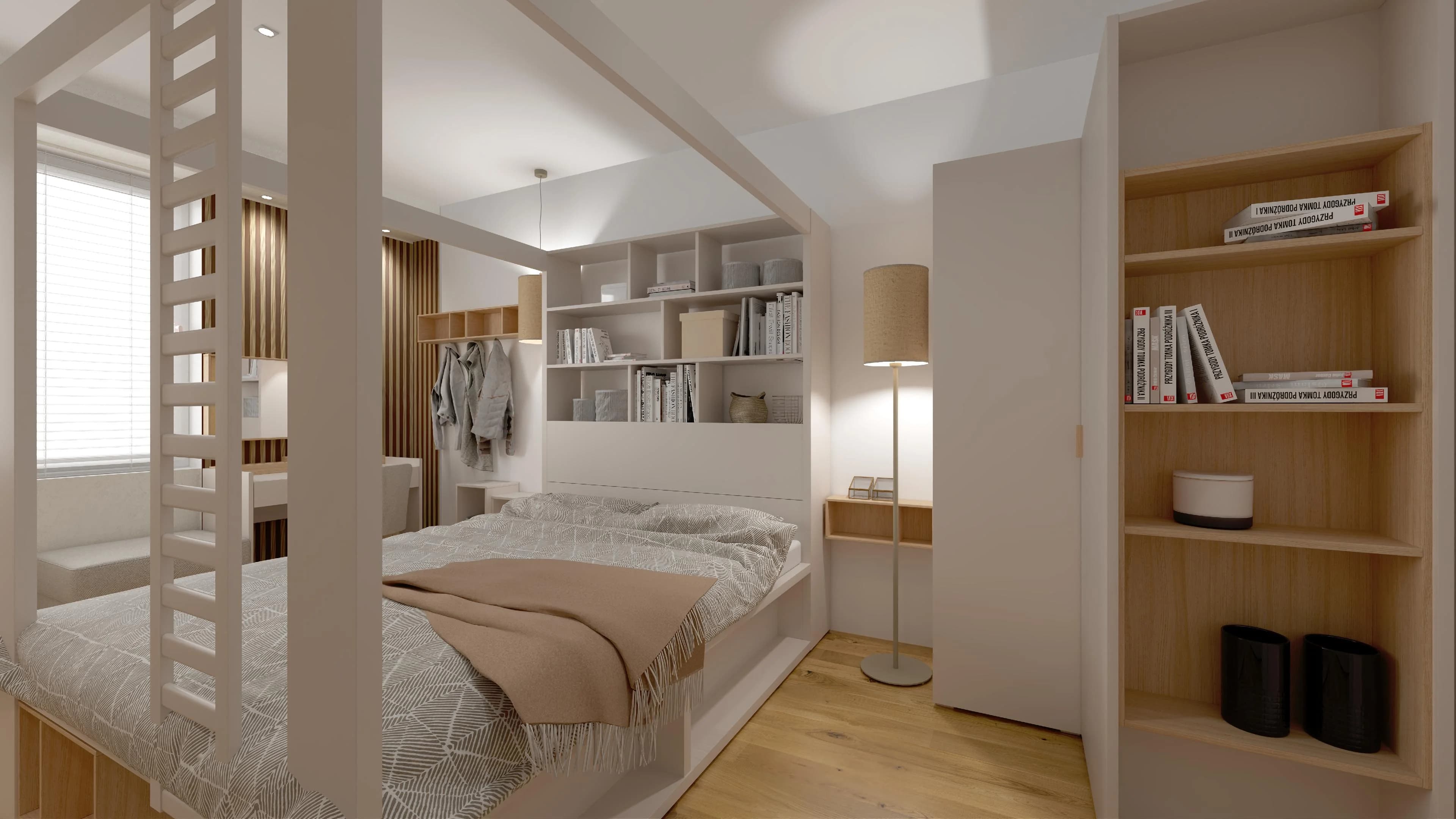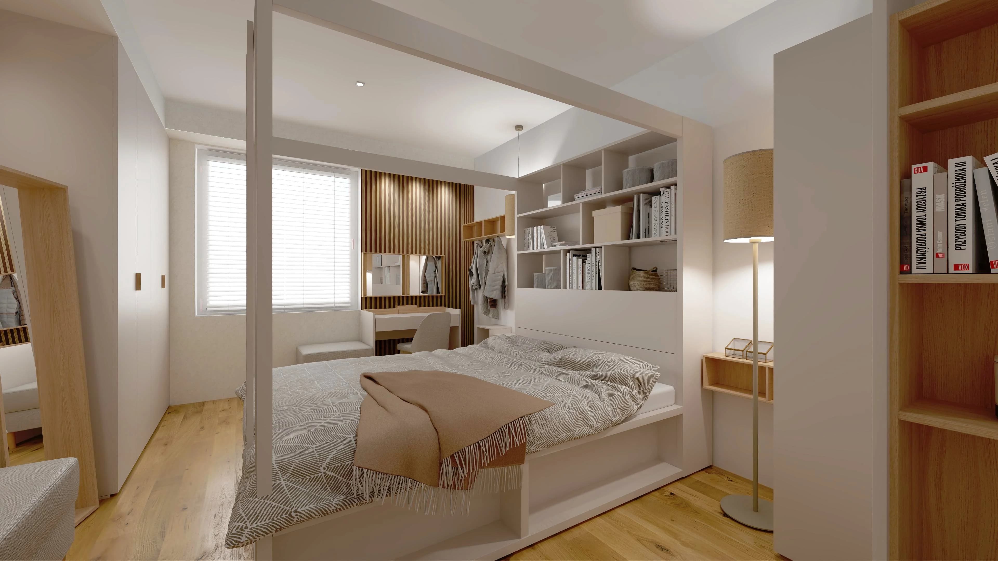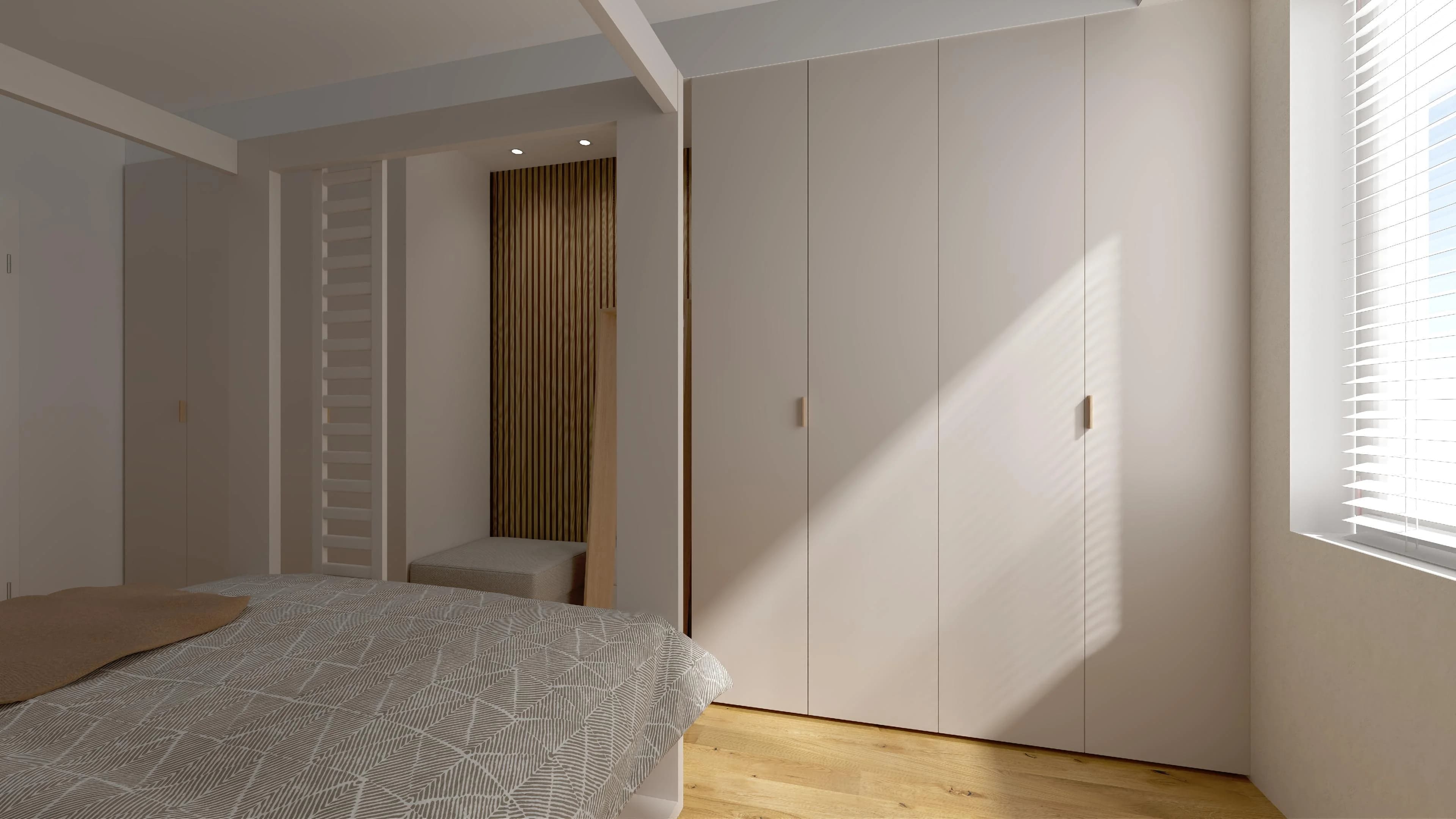 The cosy bedroom in shades of beige and wood charms with its calmness. The light-coloured furniture illuminates the space, making it seem larger. The canopy bed is not only a piece of furniture for sleeping, but also an element of easy storage. Large wardrobes promote wardrobe organisation, and you can sit at the dressing table while grooming or working for a while.
