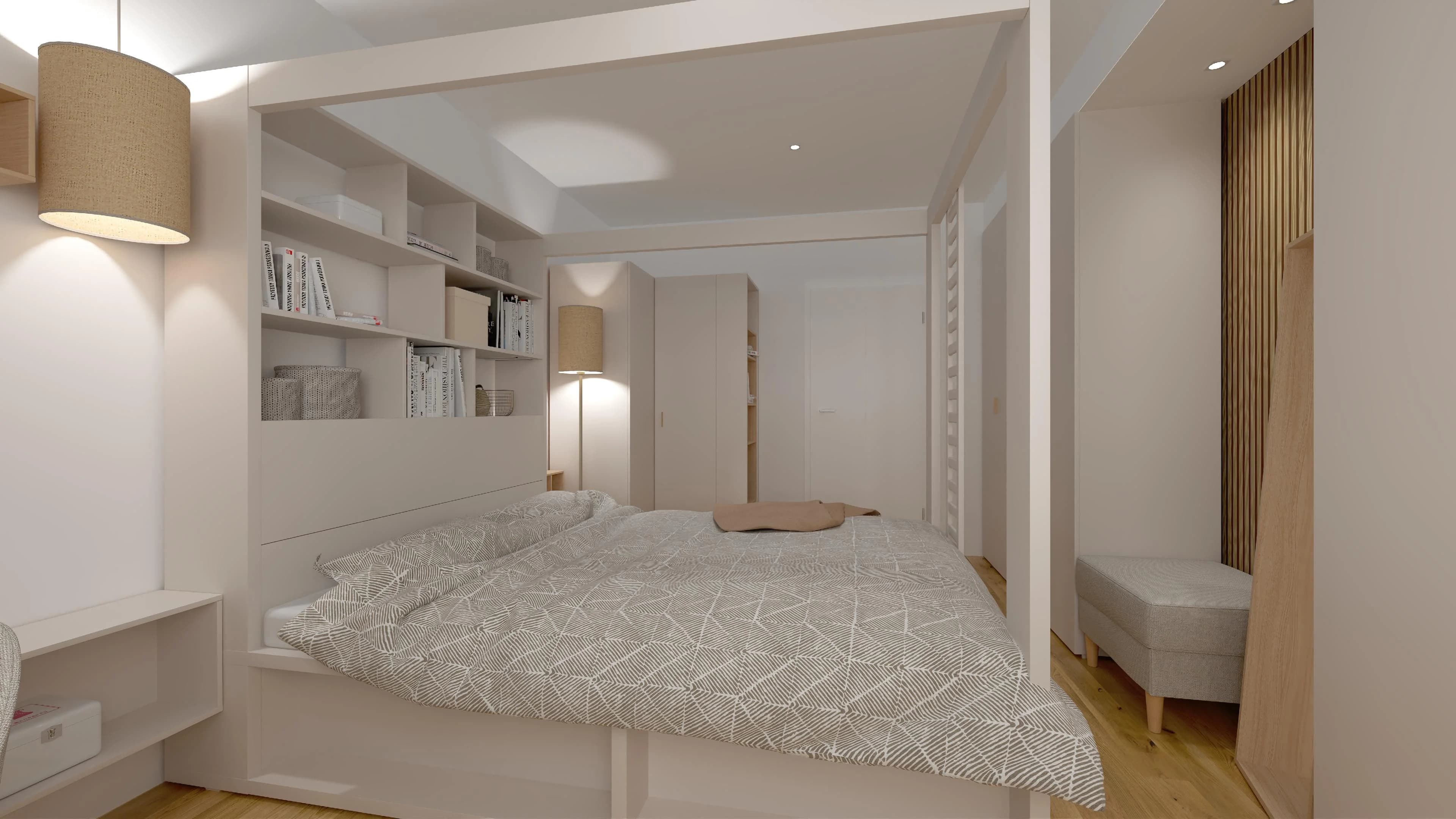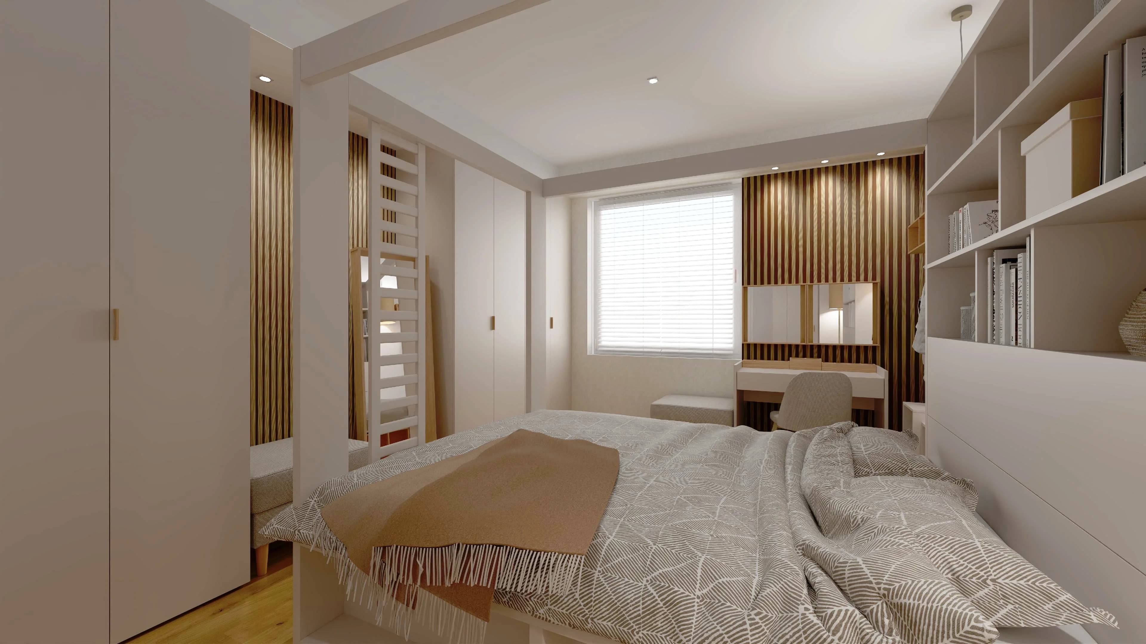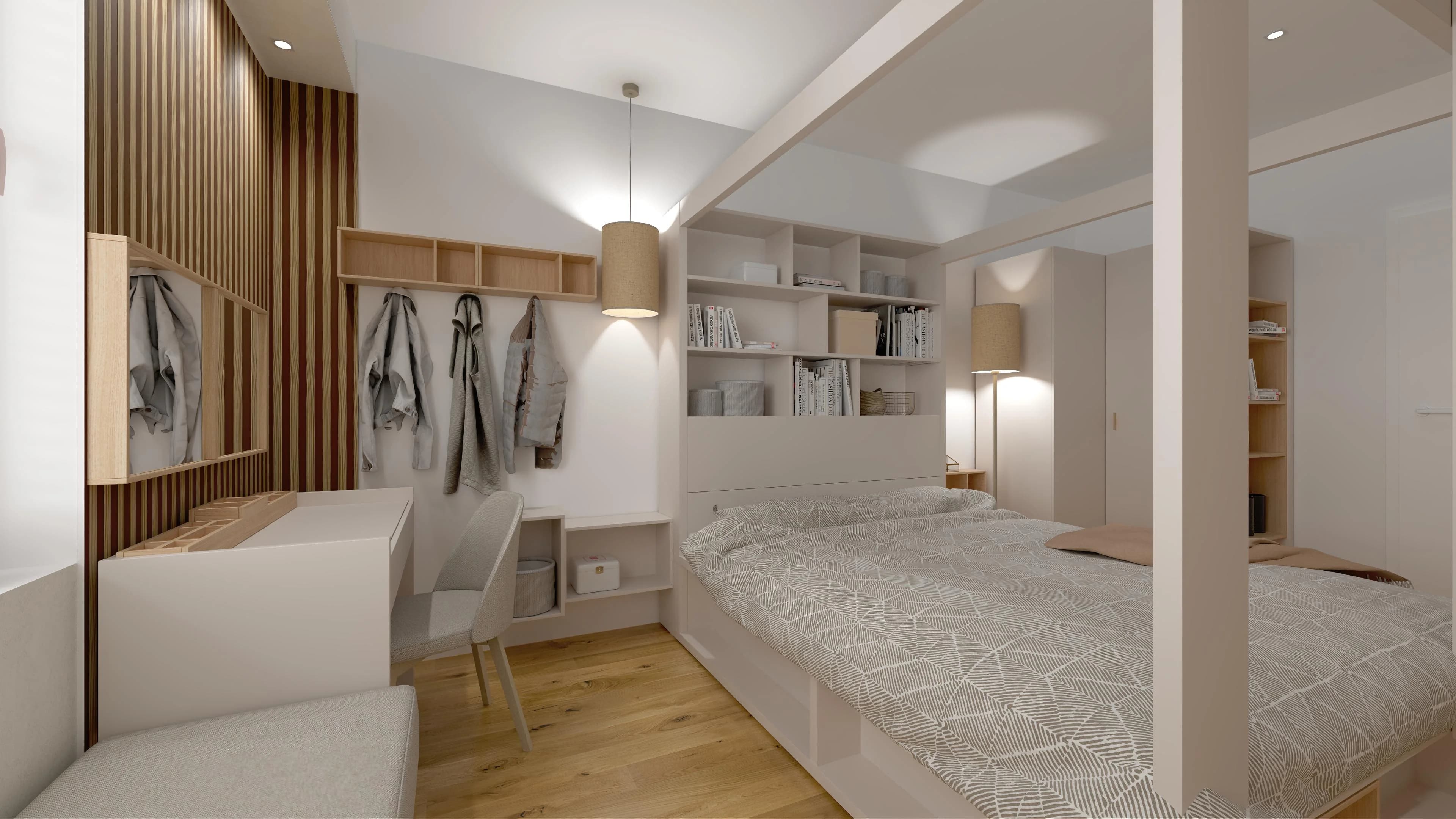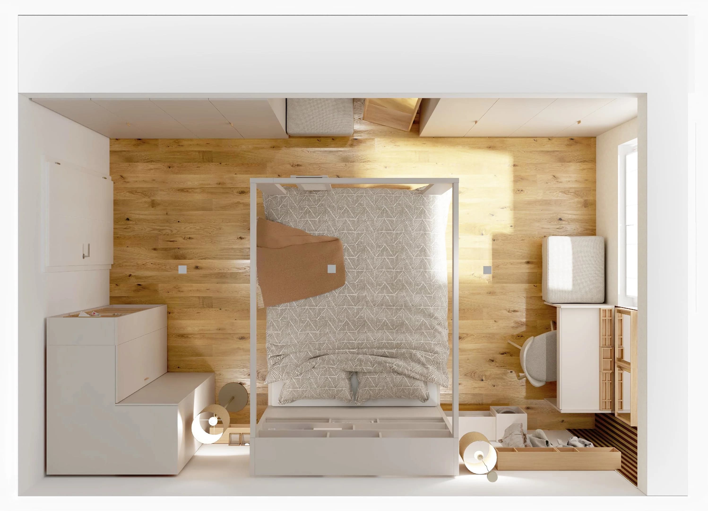 The cosy bedroom in shades of beige and wood charms with its calmness. The light-coloured furniture illuminates the space, making it seem larger. The canopy bed is not only a piece of furniture for sleeping, but also an element of easy storage. Large wardrobes promote wardrobe organisation, and you can sit at the dressing table while grooming or working for a while.