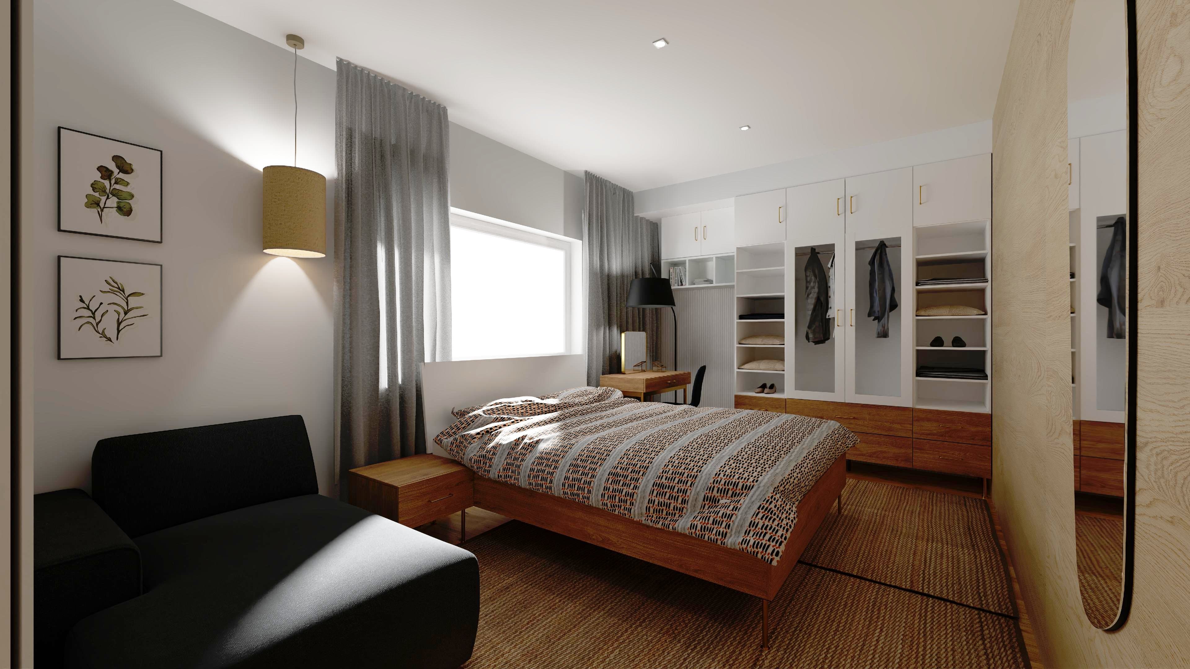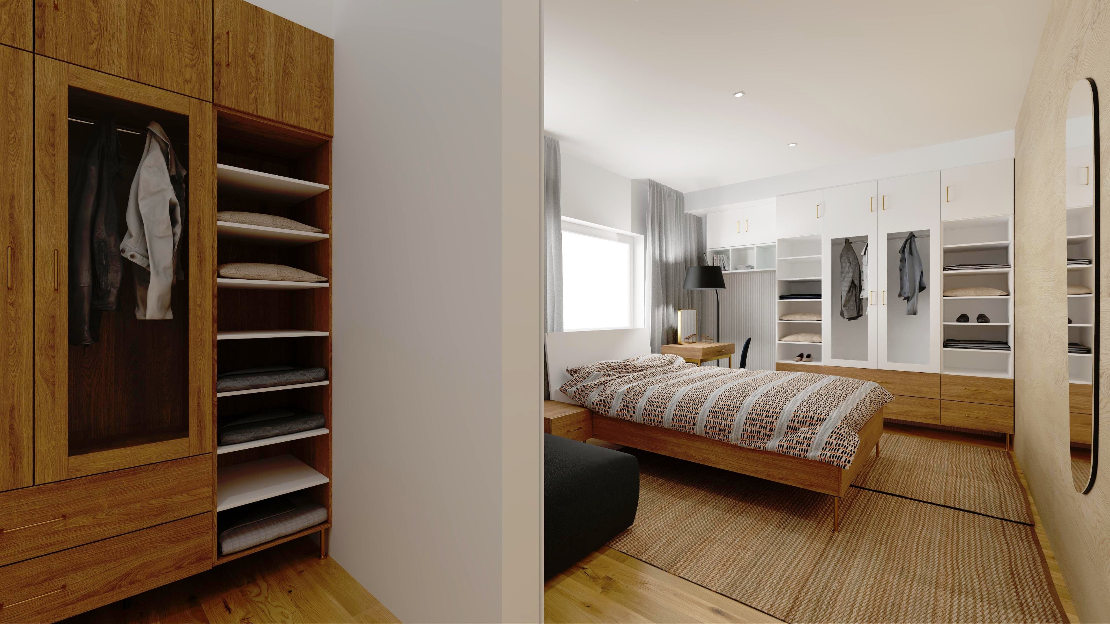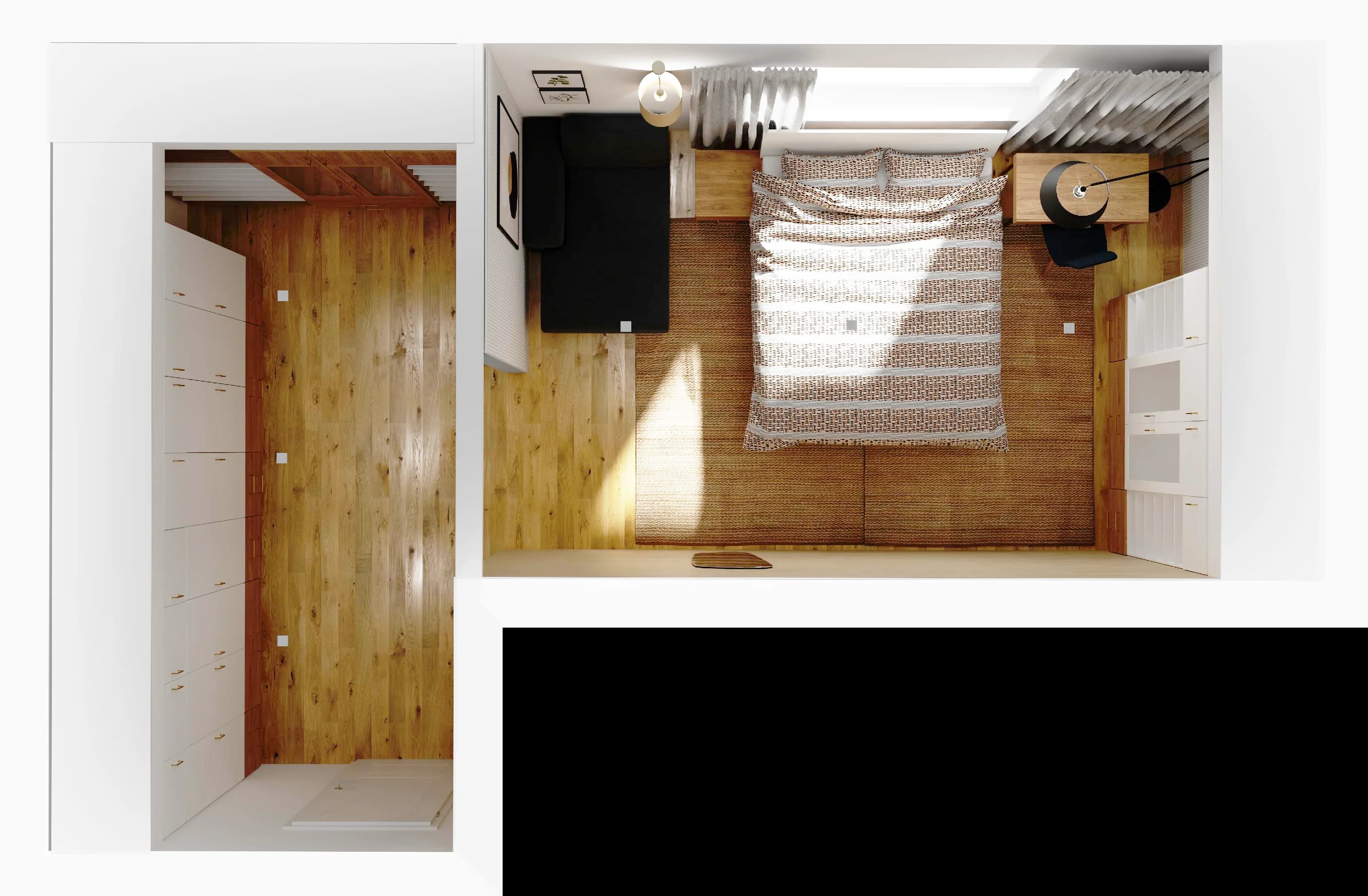 In this atmospheric bedroom, relaxation comes on its own. It is fostered by a double bed with a headboard, a comfortable daybed and a large bookcase for books and plants. Just behind the slatted partition wall is a functional wardrobe with a range of wardrobes and shelves, making it easy to organise clothes and shoes. A pleasant ambience after dark is taken care of by spot lighting.