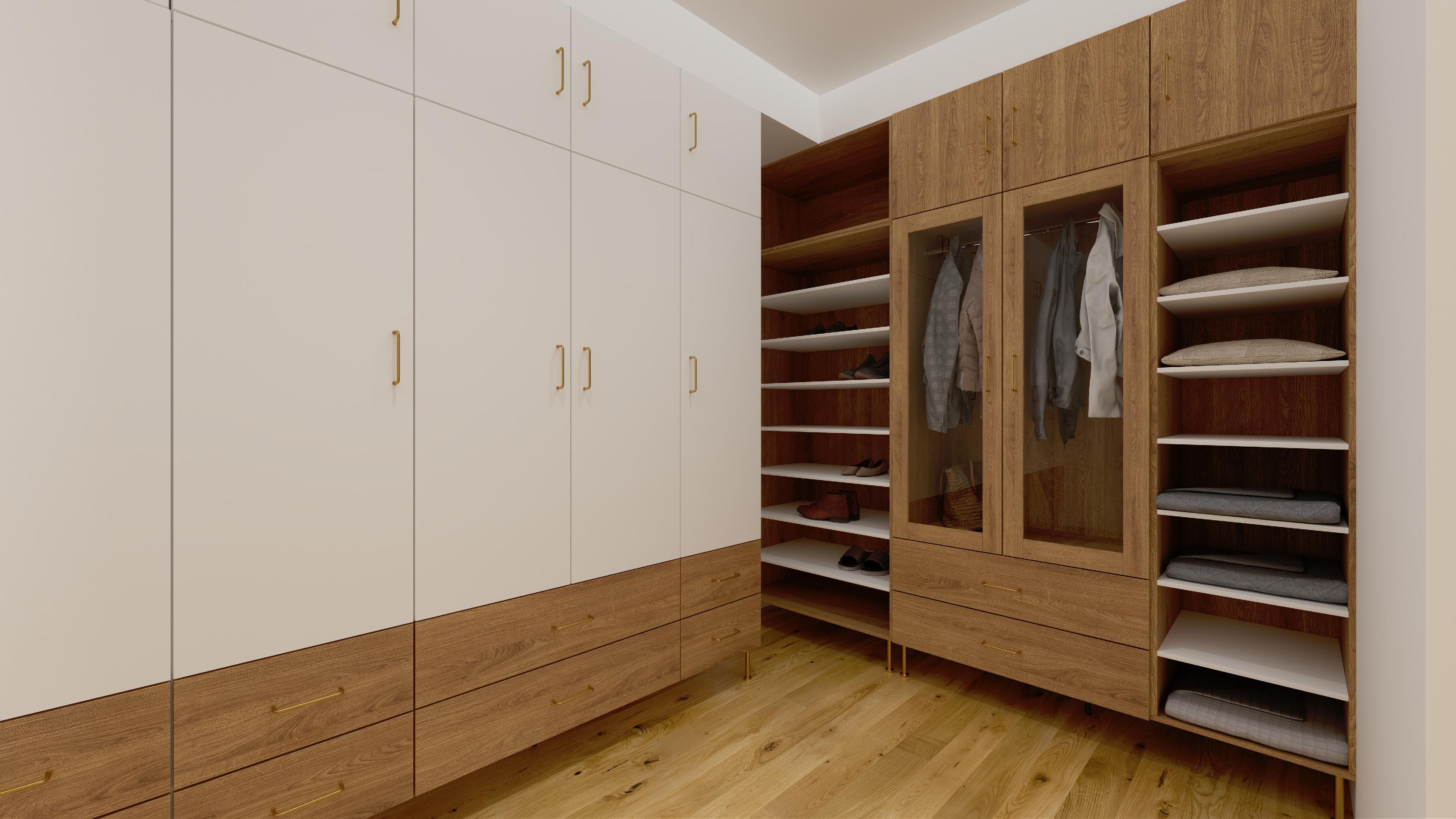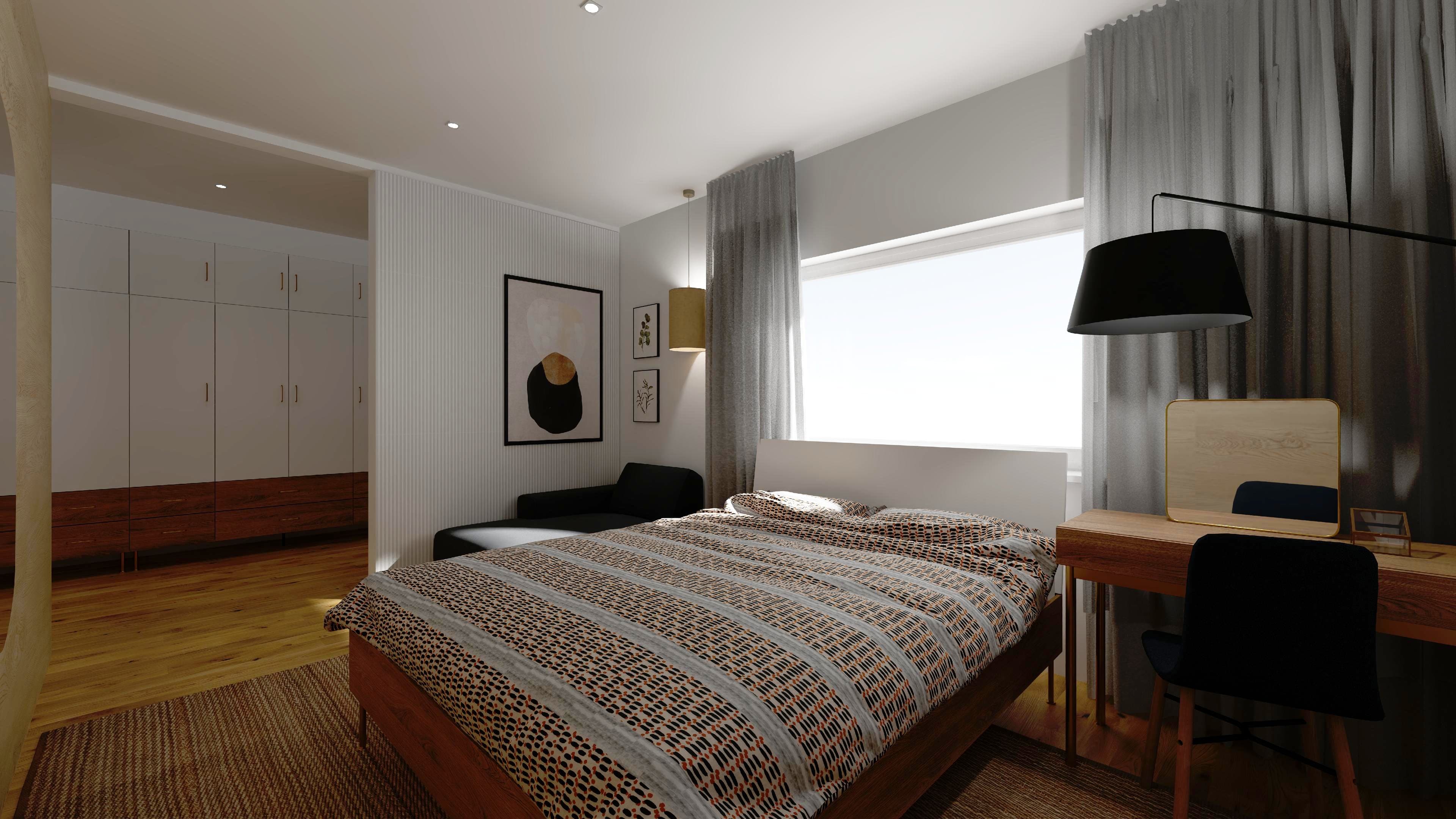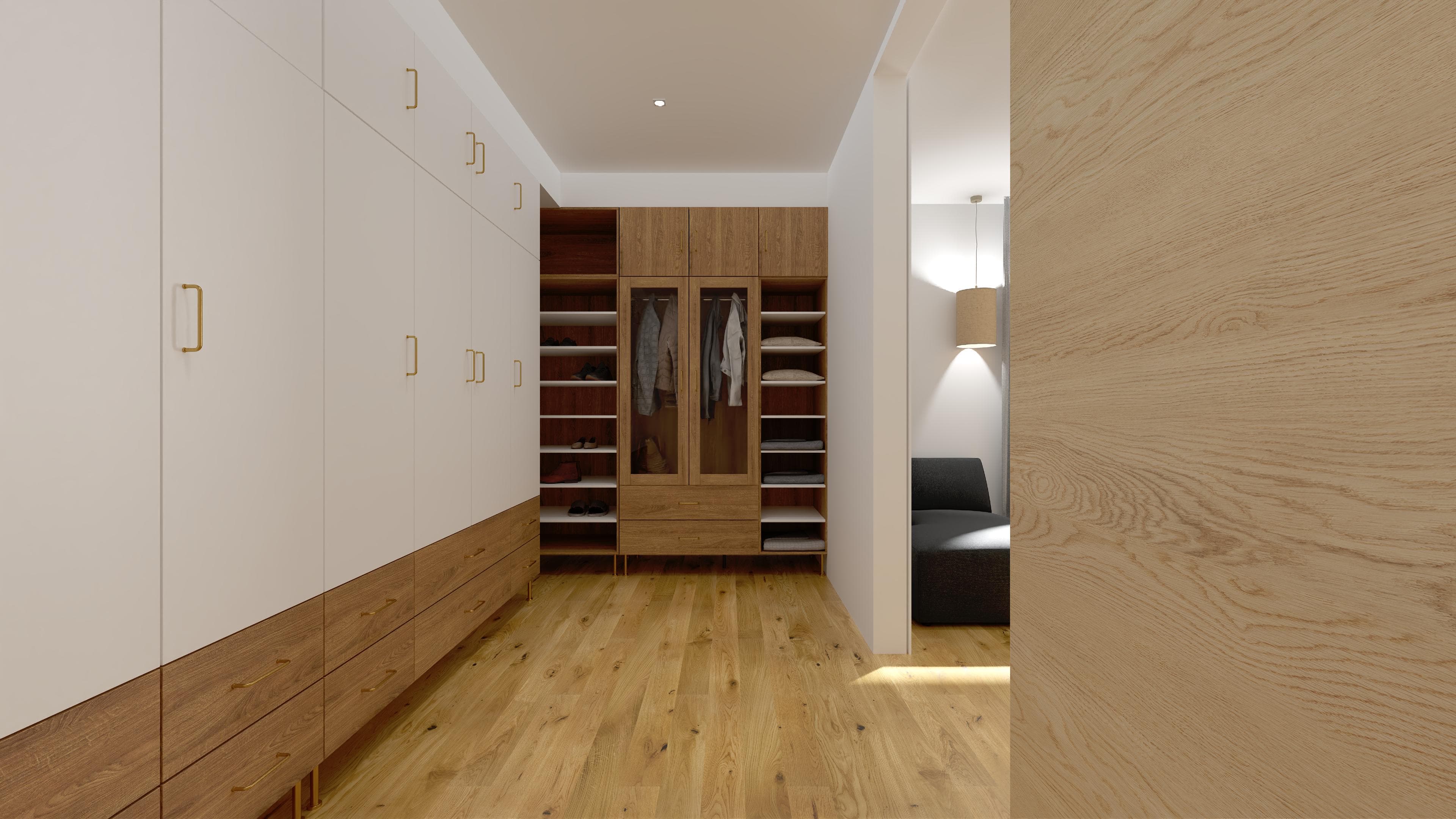 In this atmospheric bedroom, relaxation comes on its own. It is fostered by a double bed with a headboard, a comfortable daybed and a large bookcase for books and plants. Just behind the slatted partition wall is a functional wardrobe with a range of wardrobes and shelves, making it easy to organise clothes and shoes. A pleasant ambience after dark is taken care of by spot lighting.