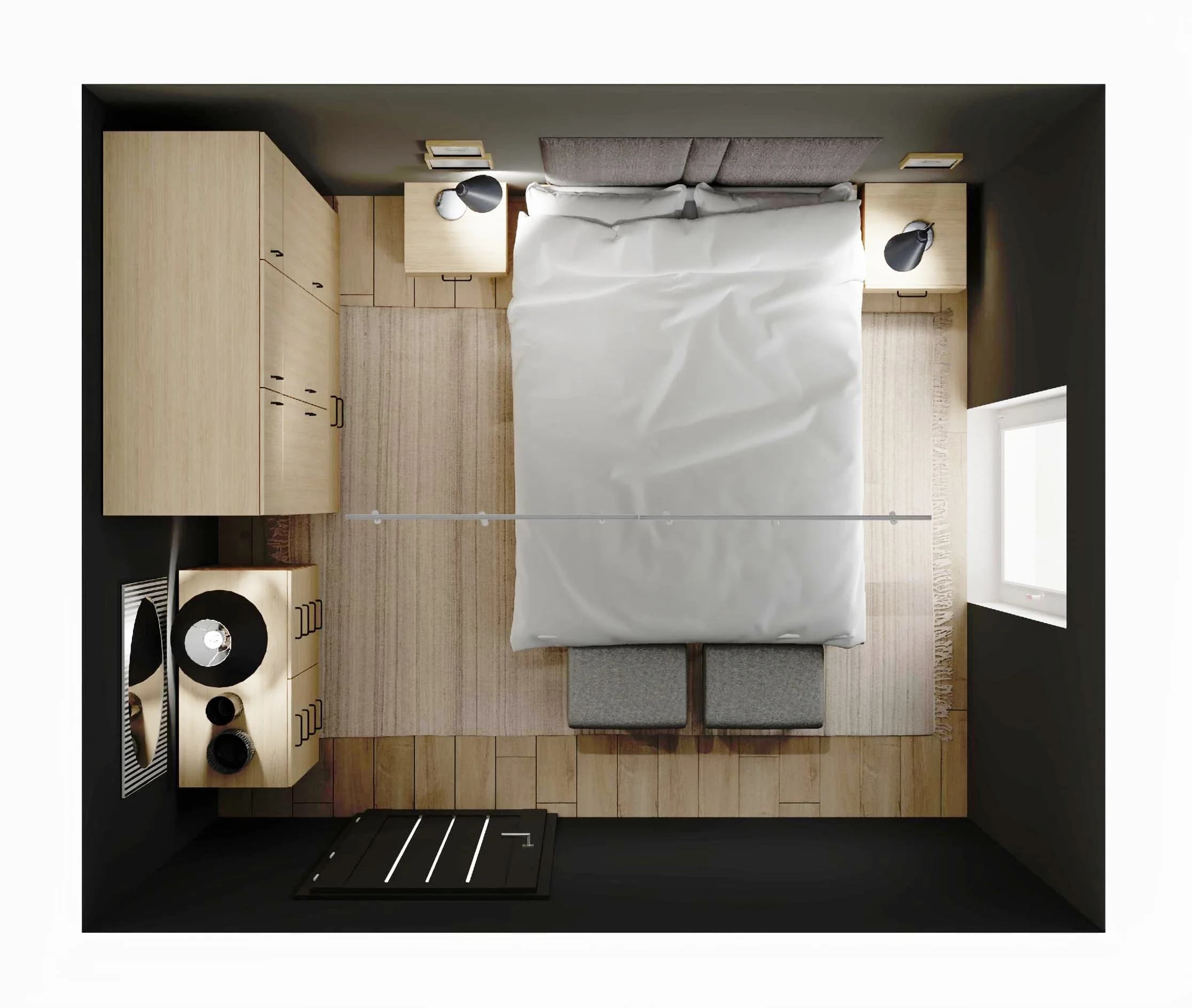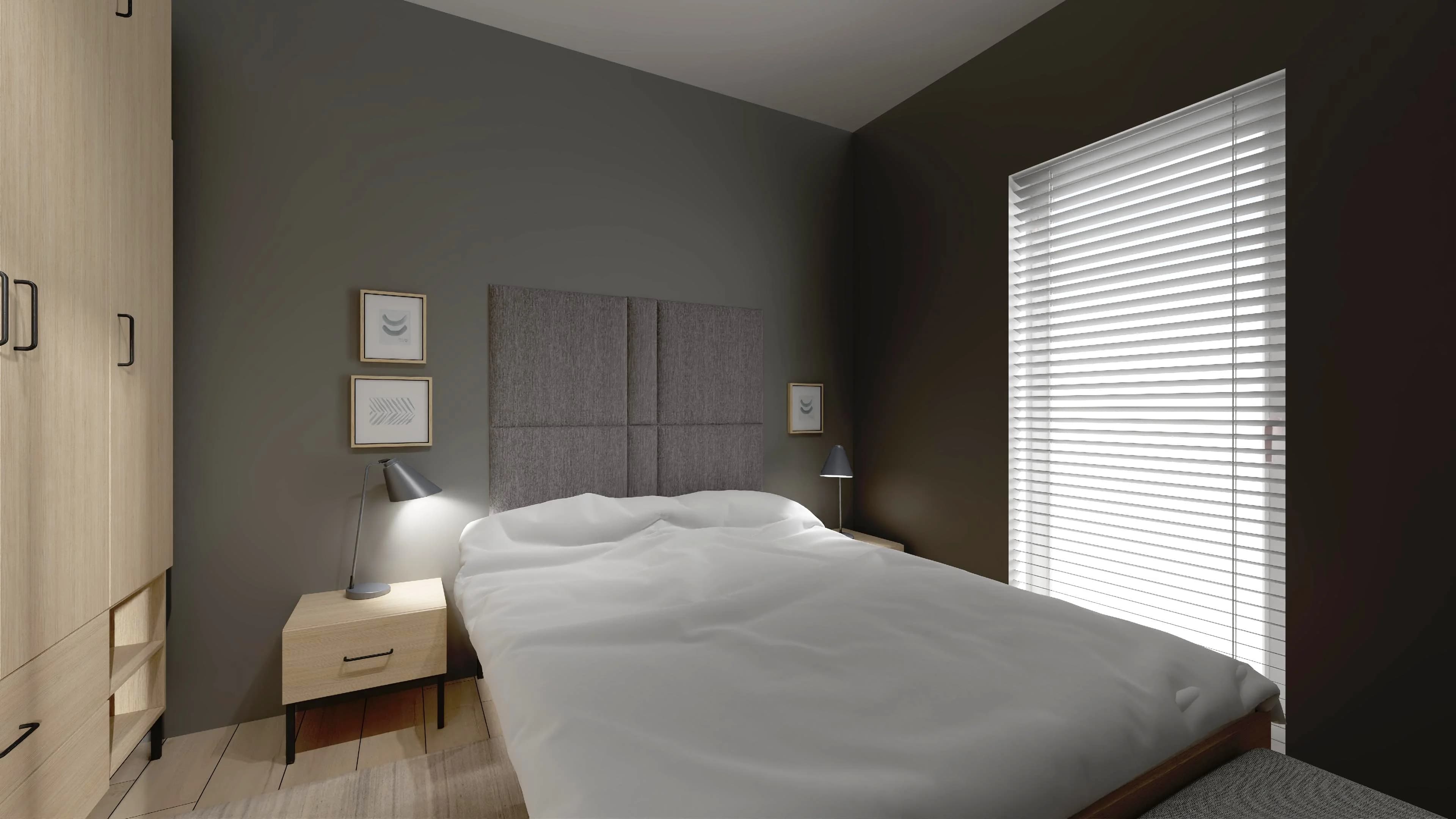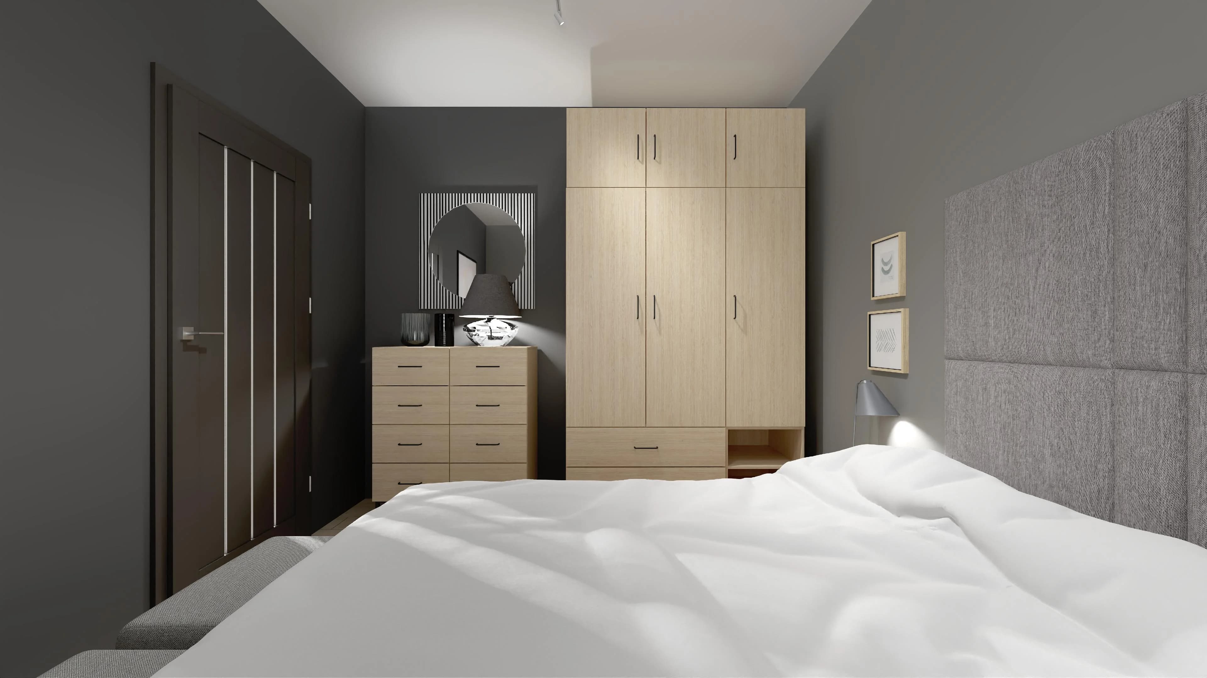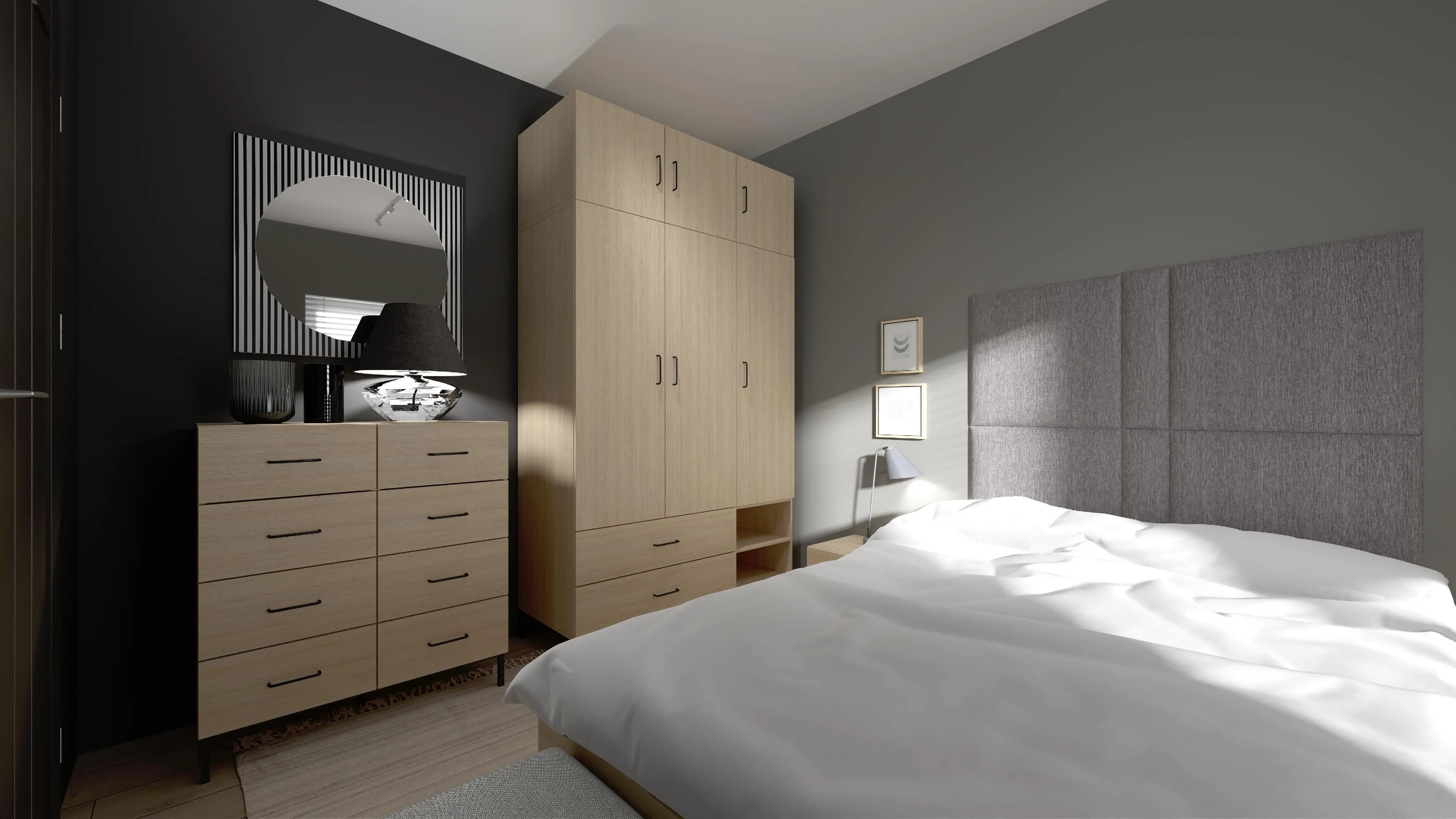 Wnętrze już od progu koi wszystkie zmysły. Stonowane barwy szarości i drewna tworzą udane trio z głębokim kolorem czerni na ścianie. Komfortowy sen jest zasługą łóżka z tapicerowanym wezgłowiem i szafek nocnych, dzięki którym potrzebne drobiazgi są na wyciągnięcie ręki. Porządkowi sprzyjają pojemne meble, a duży dywan zapewnia ciszę i ciepło pod stopami.