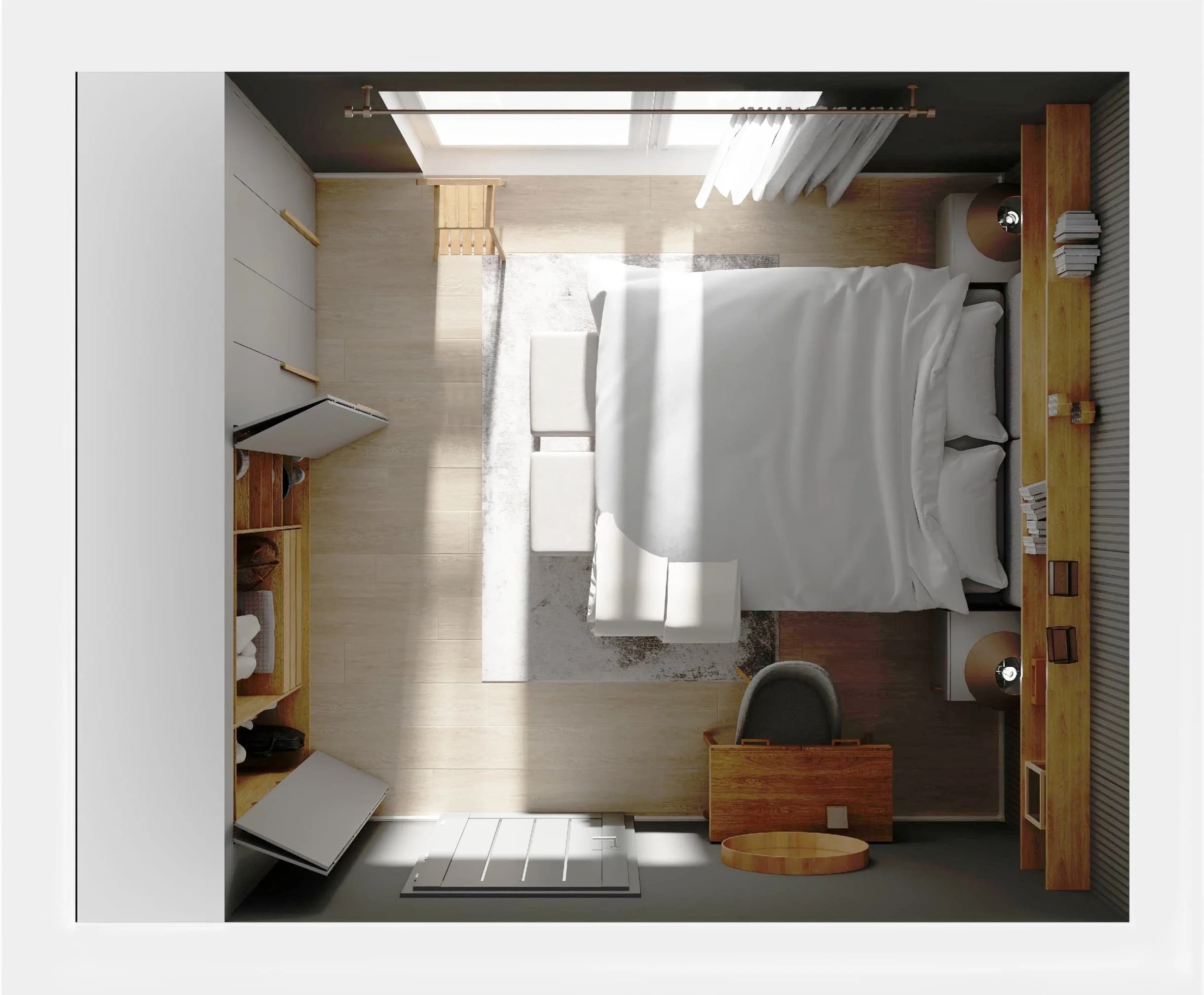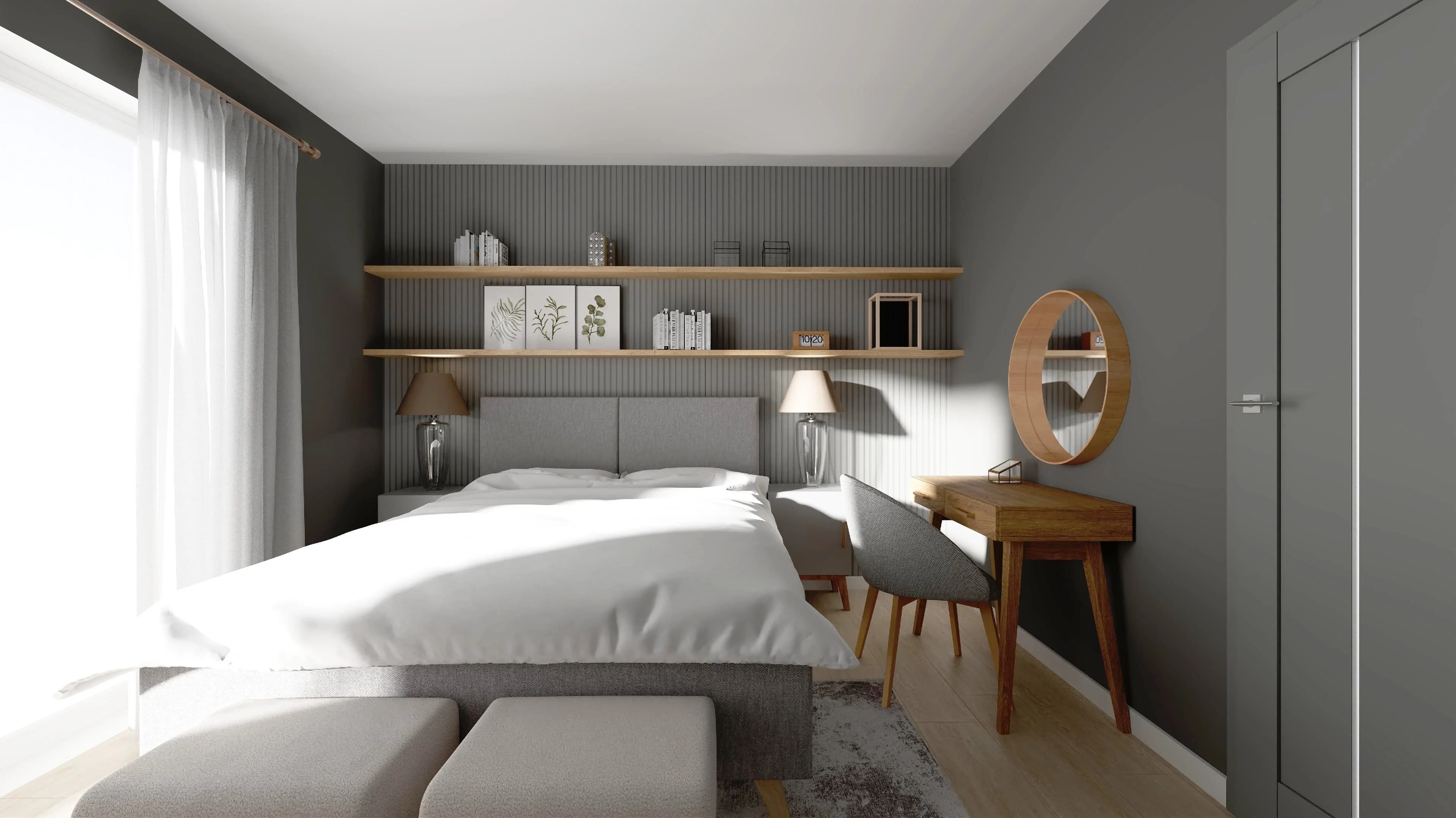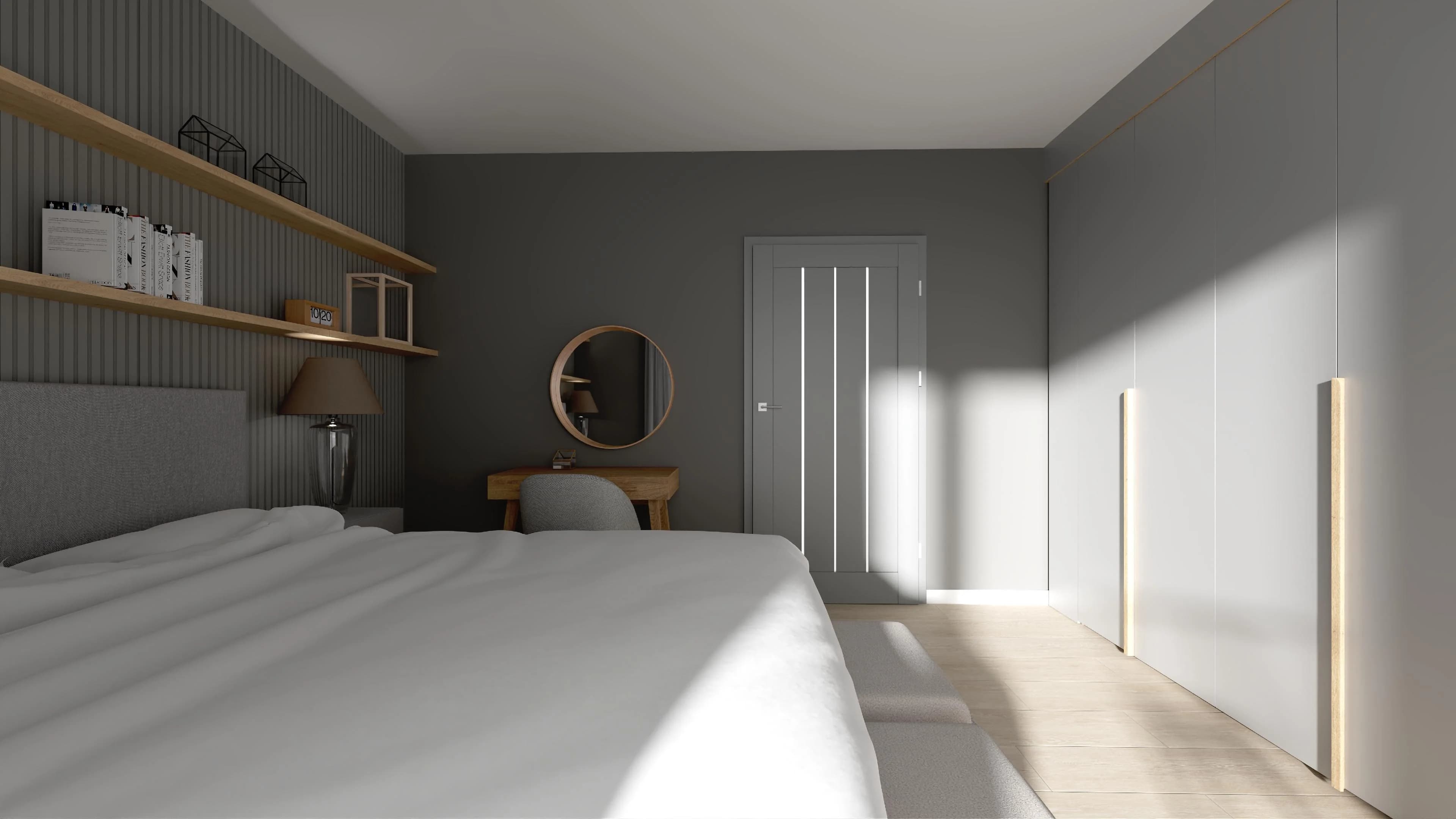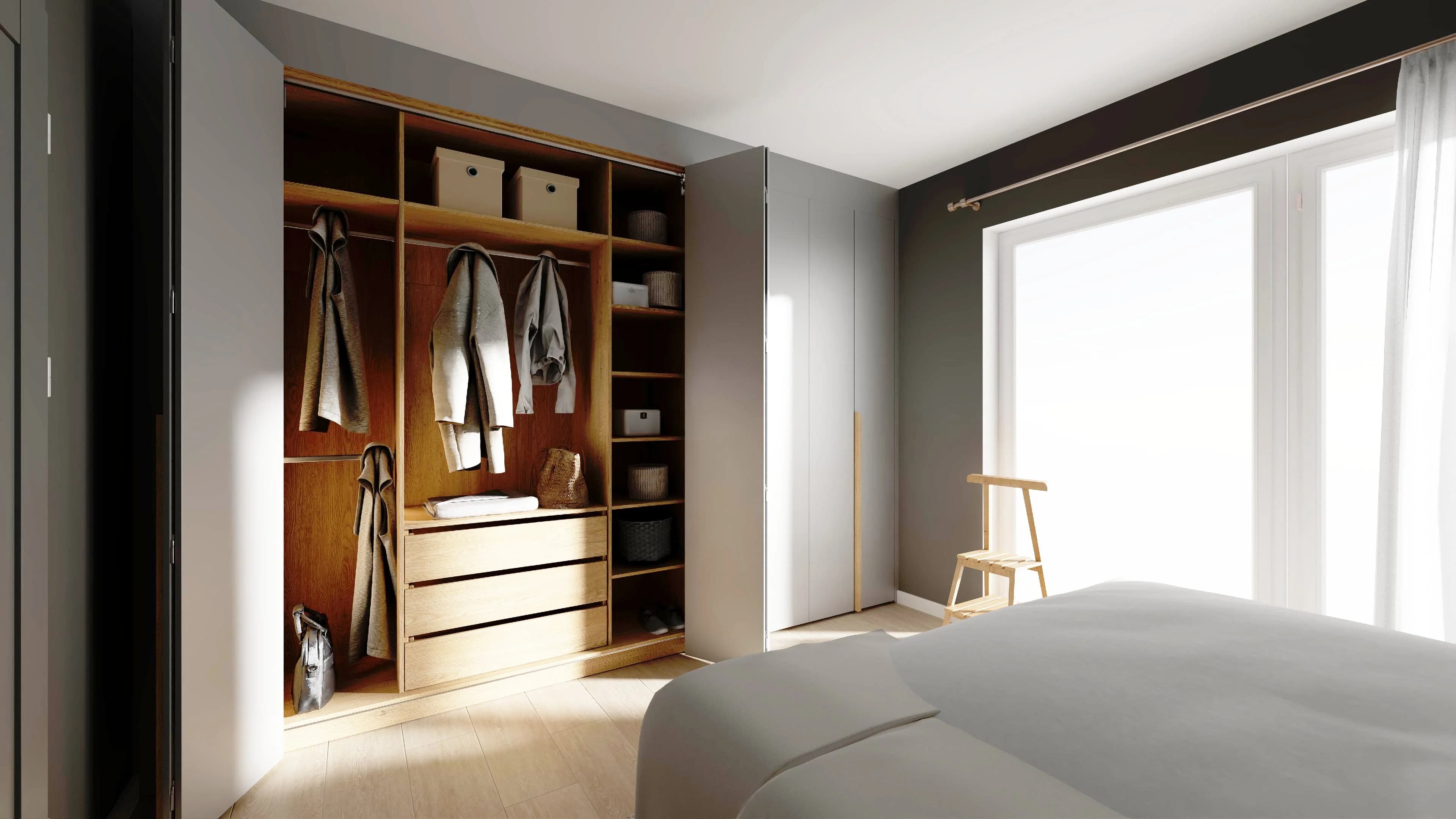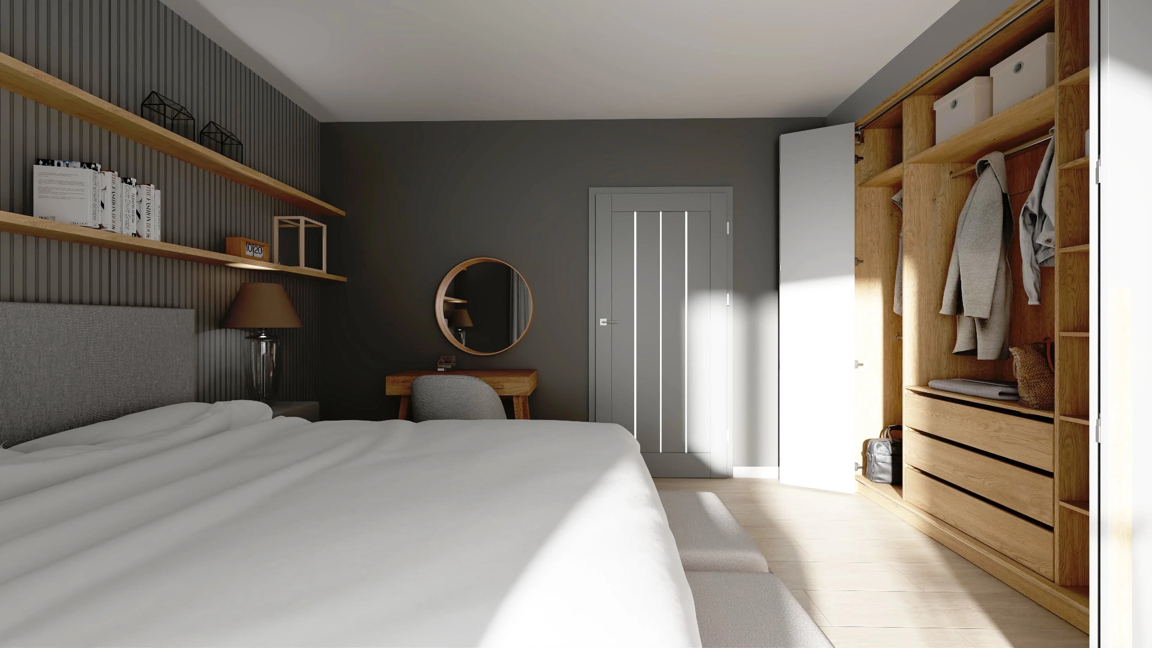 Szara sypialnia z szafami na całą ścianę