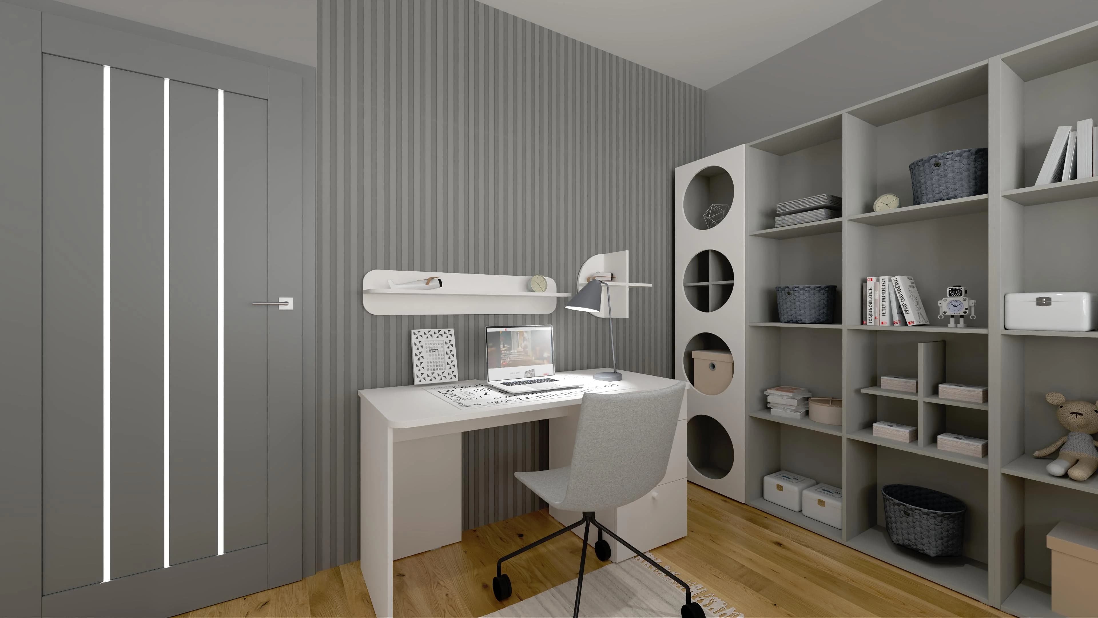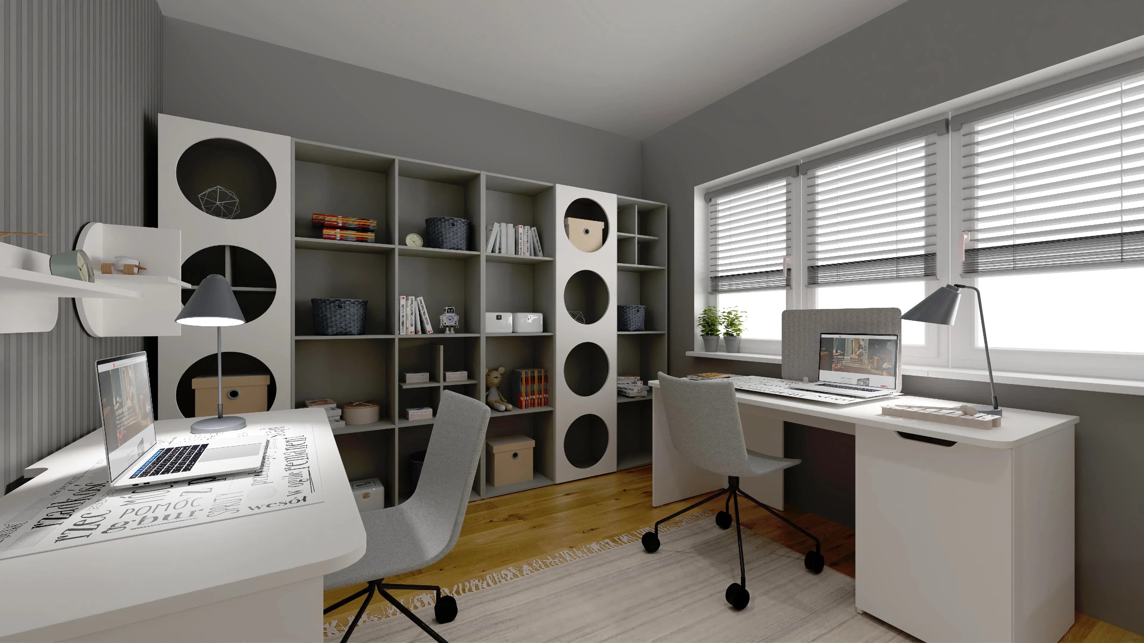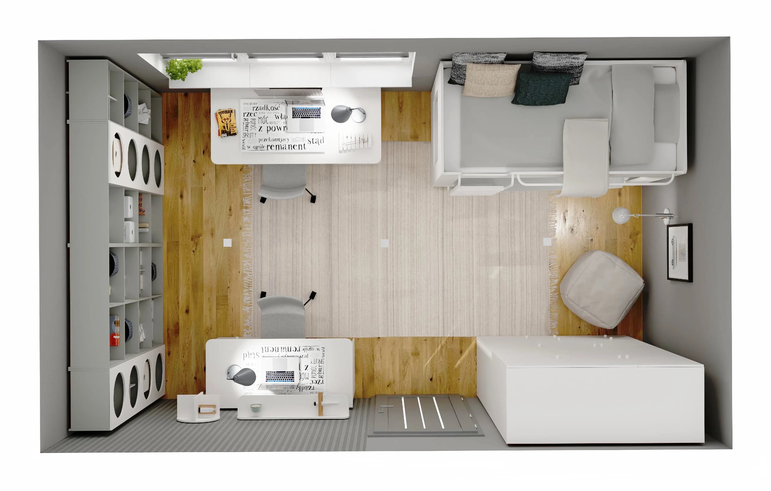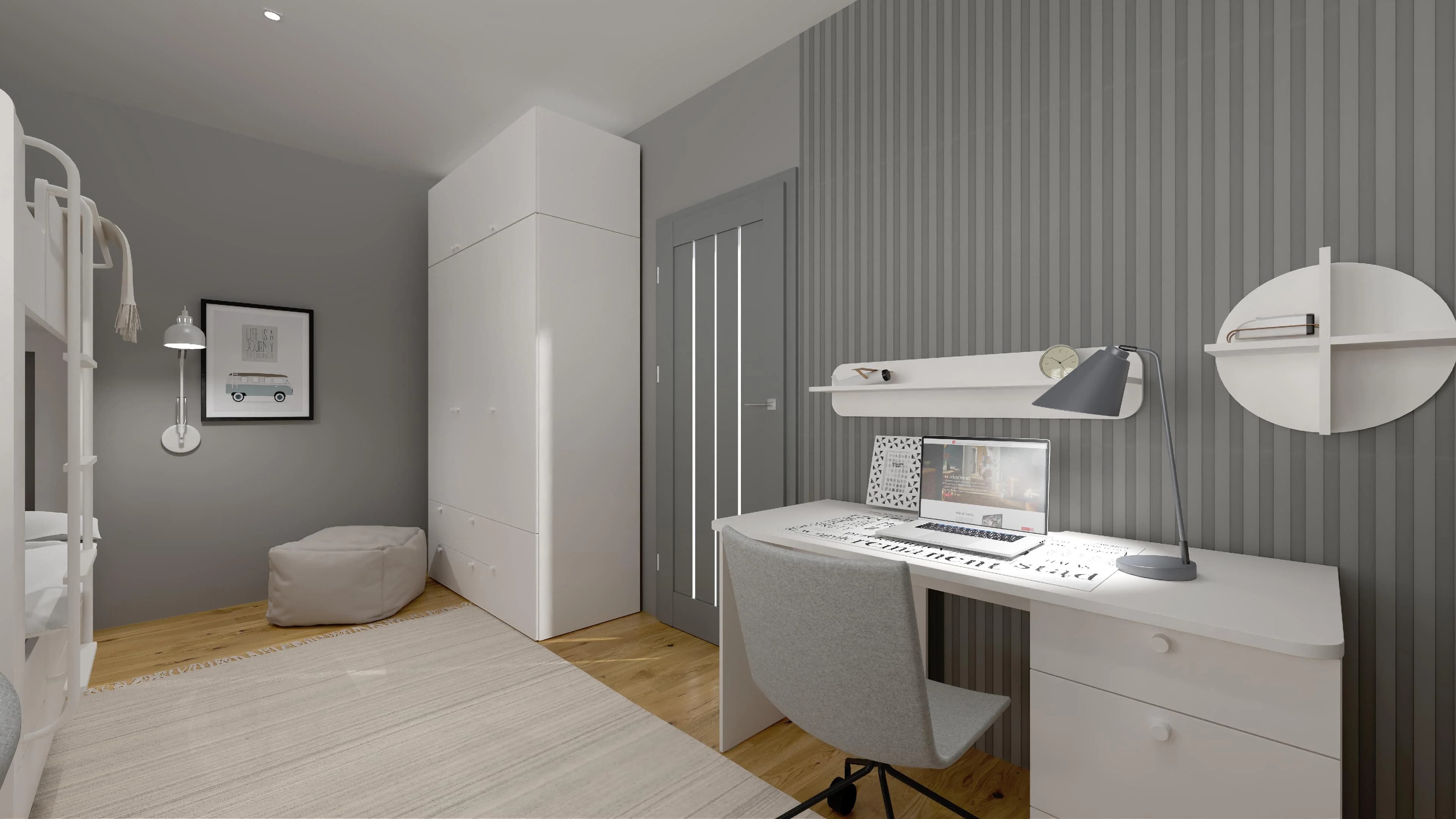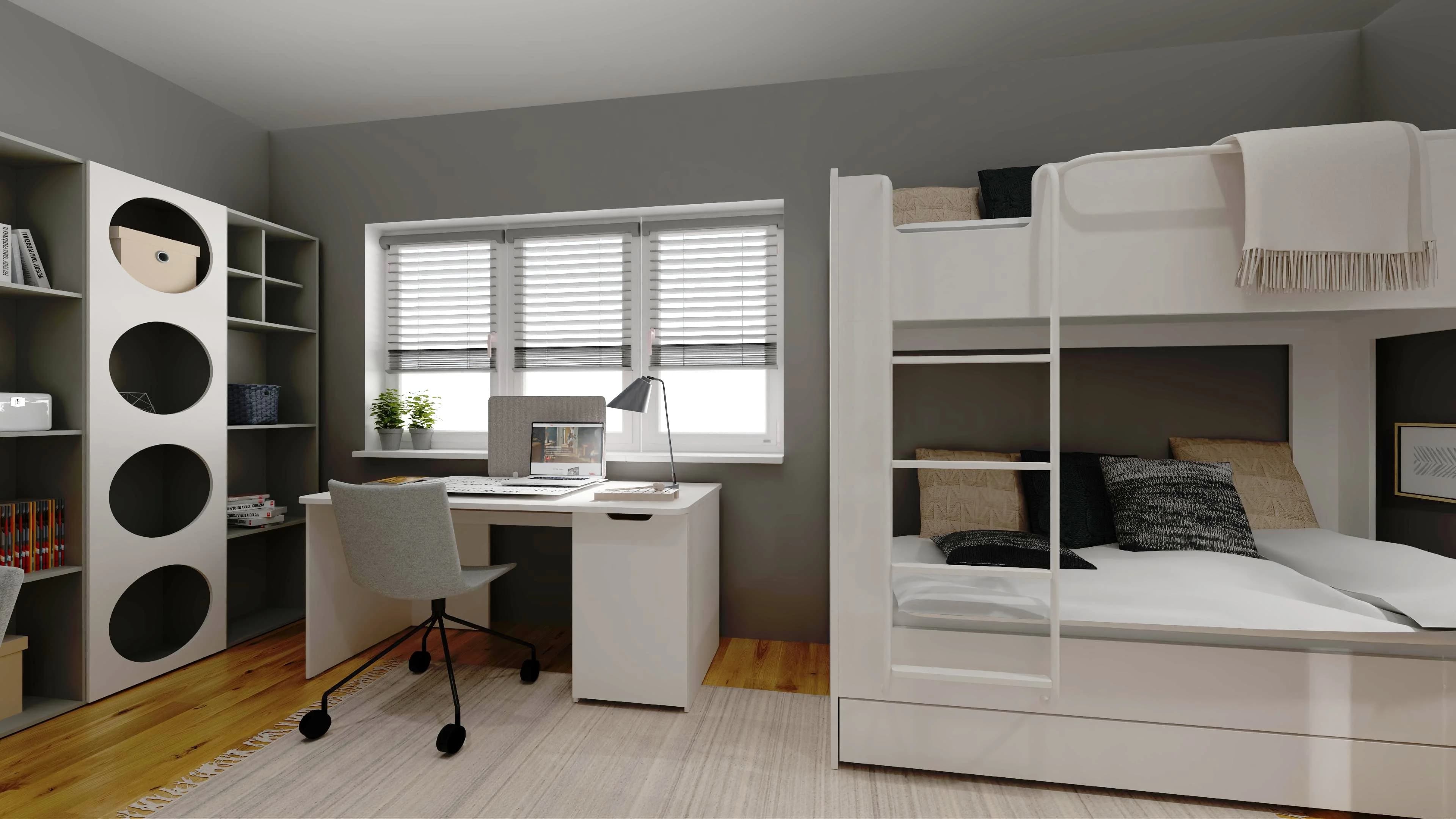 Dzięki praktycznym meblom pokój rodzeństwa odpowiada na wszystkie potrzeby młodych lokatorów. Porządek pozwala utrzymać pakowna szafa, a dwa biurka z obrotowymi krzesłami i obszerny regał tworzą komfortową przestrzeń do nauki i rozwoju pasji. Gdy dzieci zapragną odpocząć, wystarczy, że przeniosą się na piętrowe łóżko z drabinką i miękkimi poduchami.