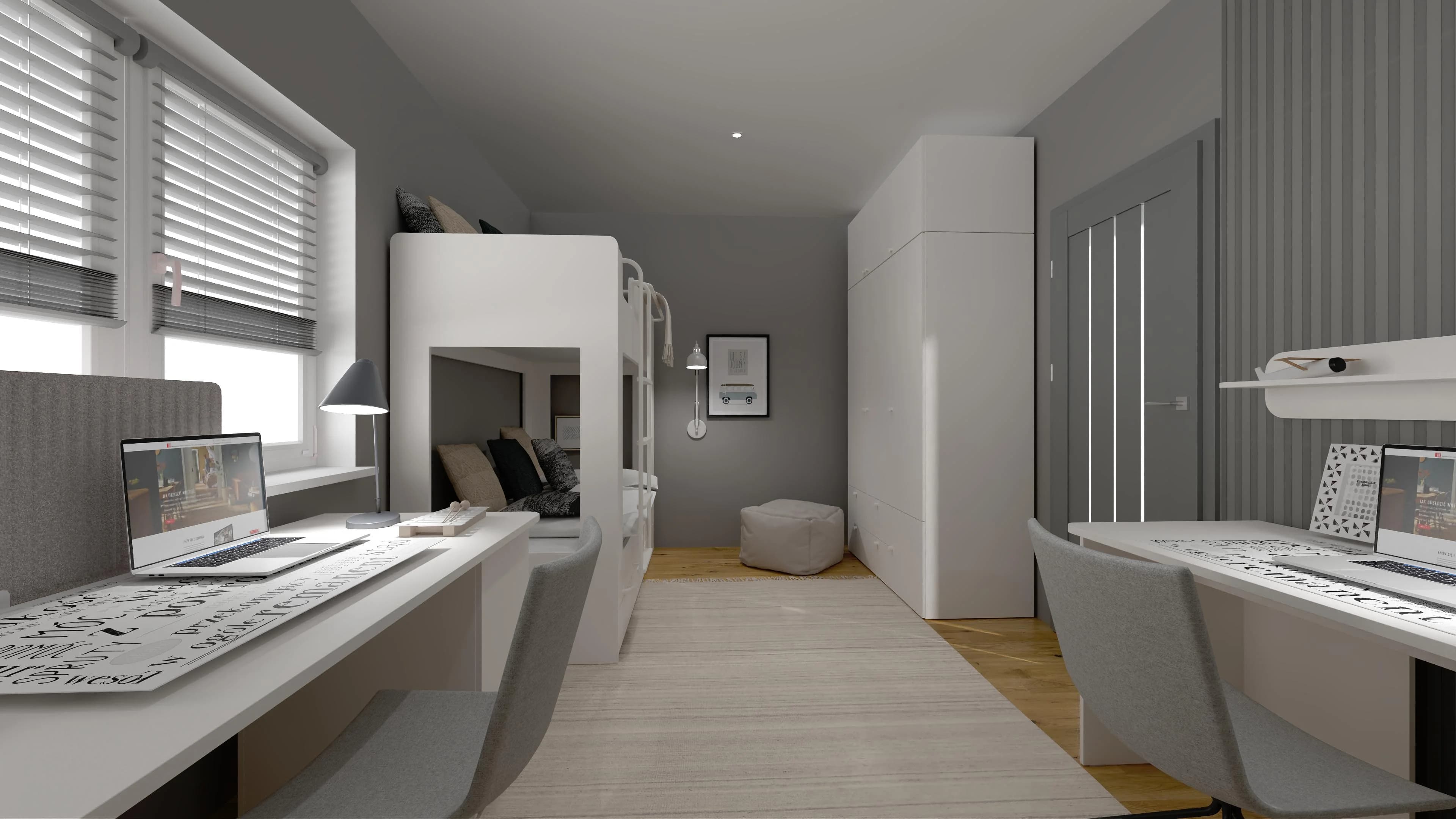 Szary pokój dwójki rodzeństwa z piętrowym łóżkiem
