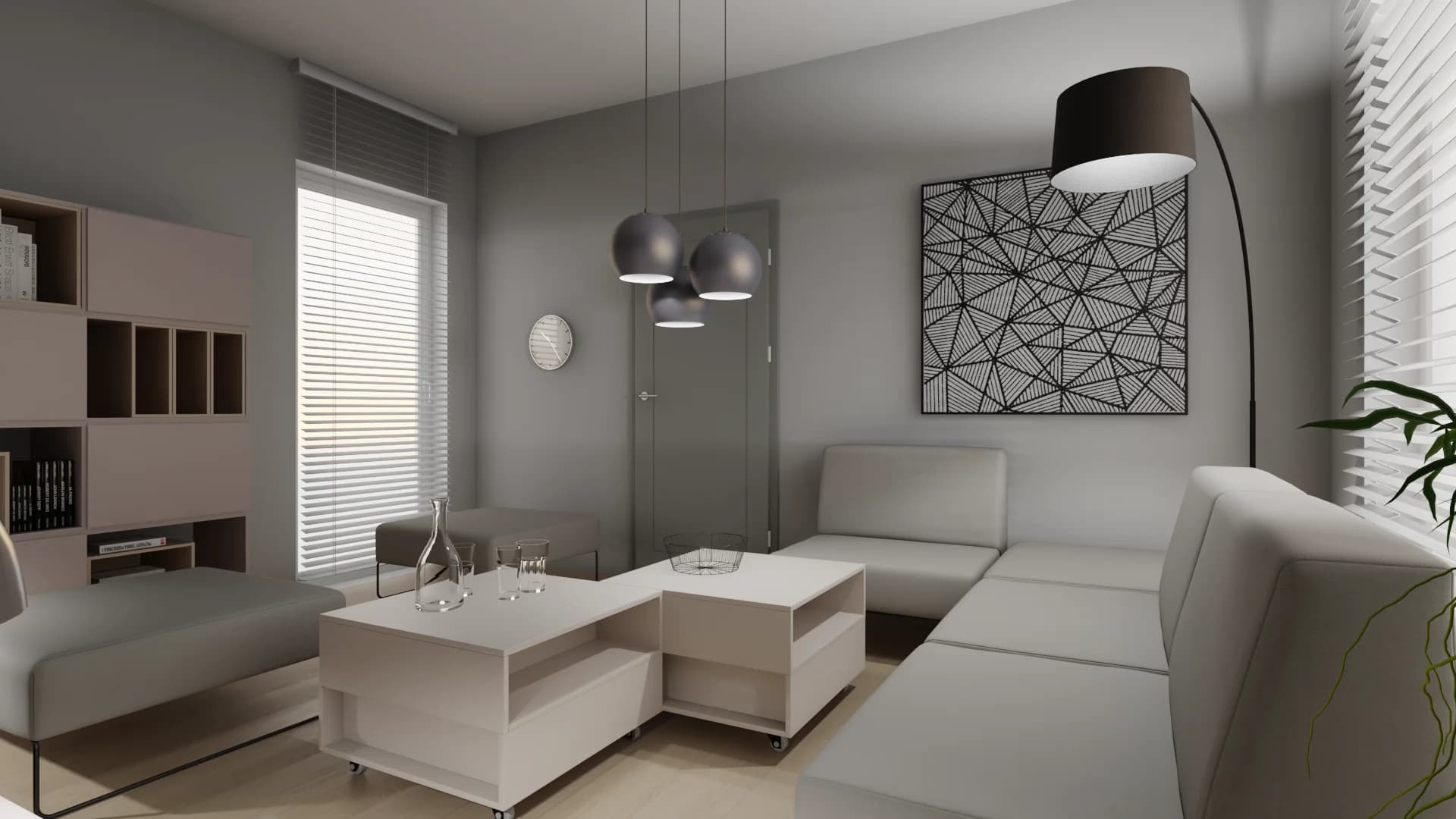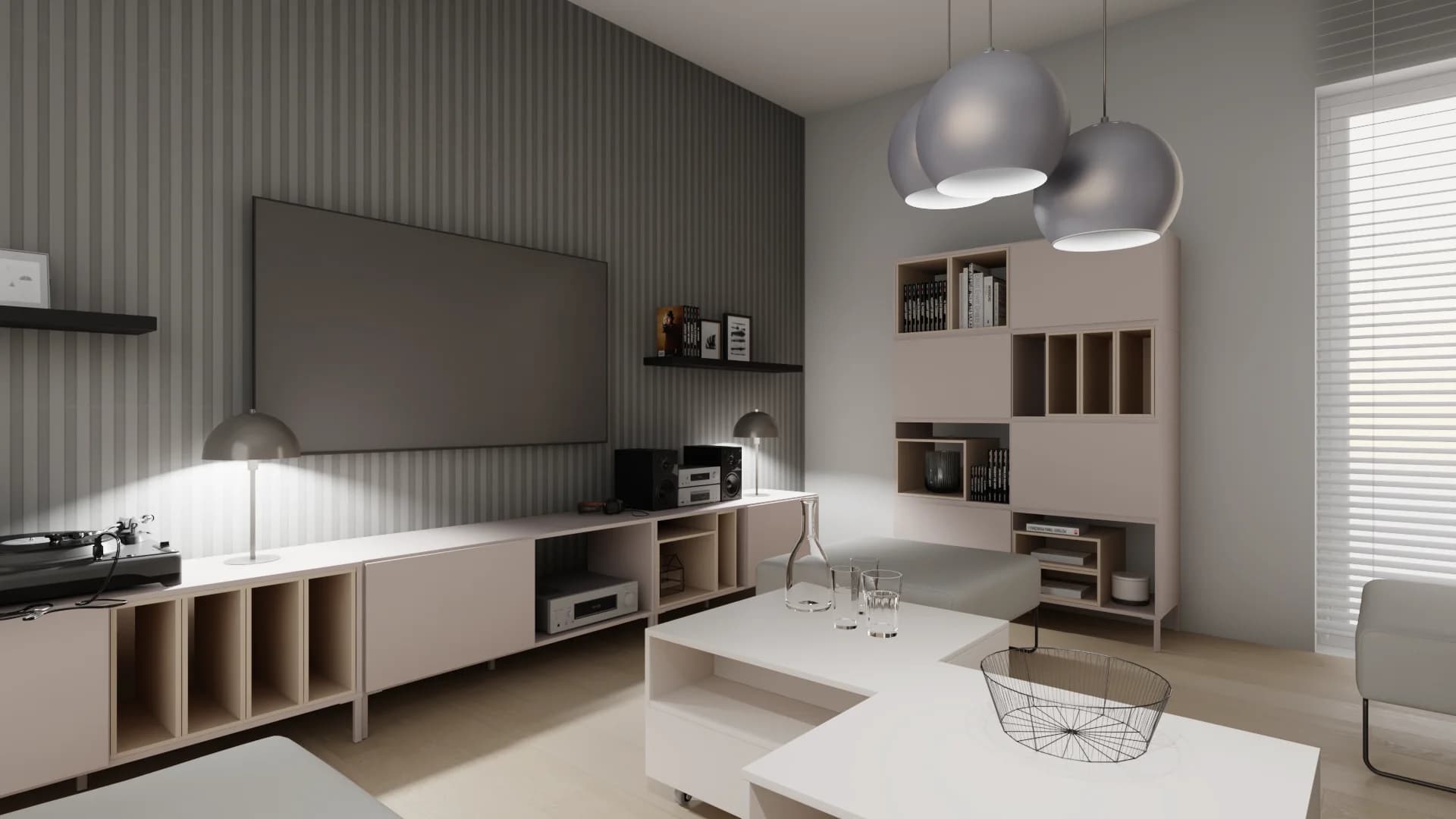 This living room has room for everything that is conducive to a pleasant stay. You can rest comfortably on the spacious corner sofa and, if necessary, spend the night with friends. Thanks to the modular shelving units against the TV wall, all music CDs and board games are always at hand. The functionality of the interior is enhanced by two mobile benches on wheels.