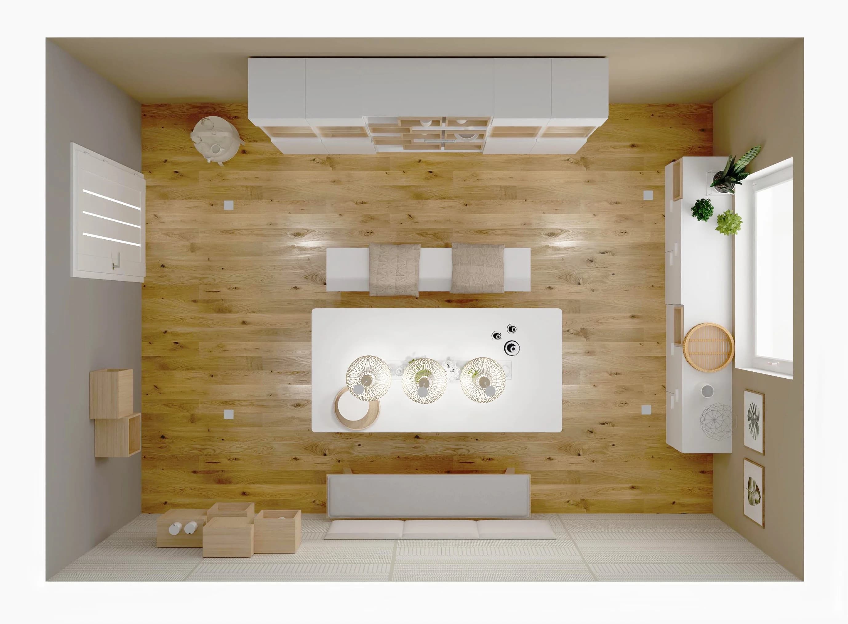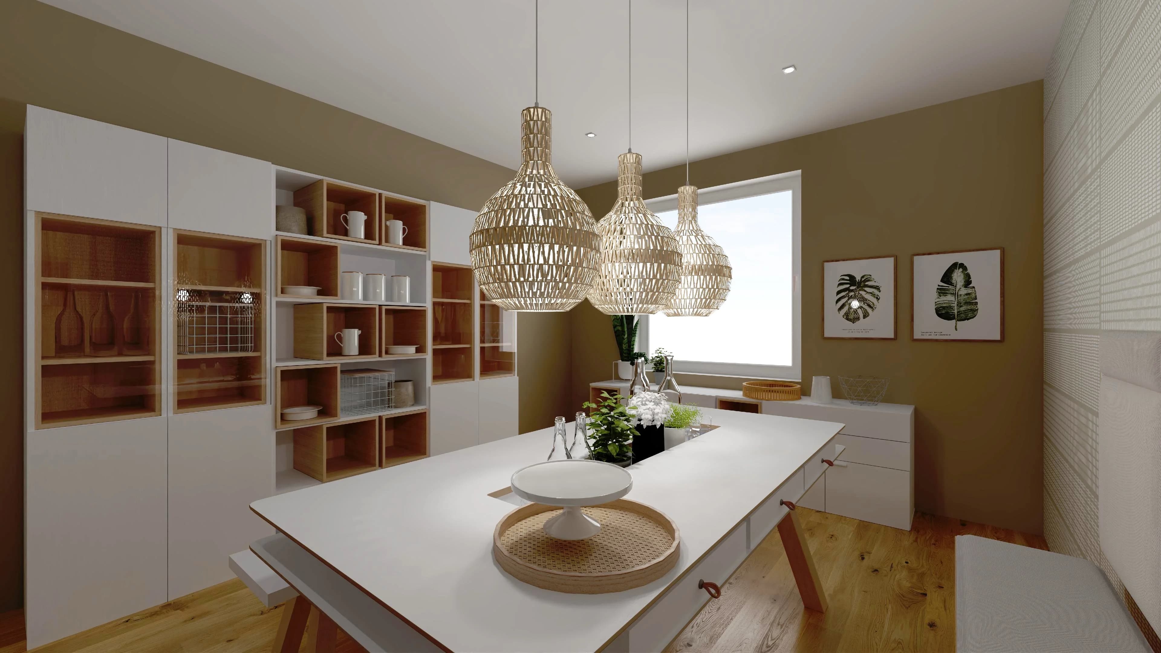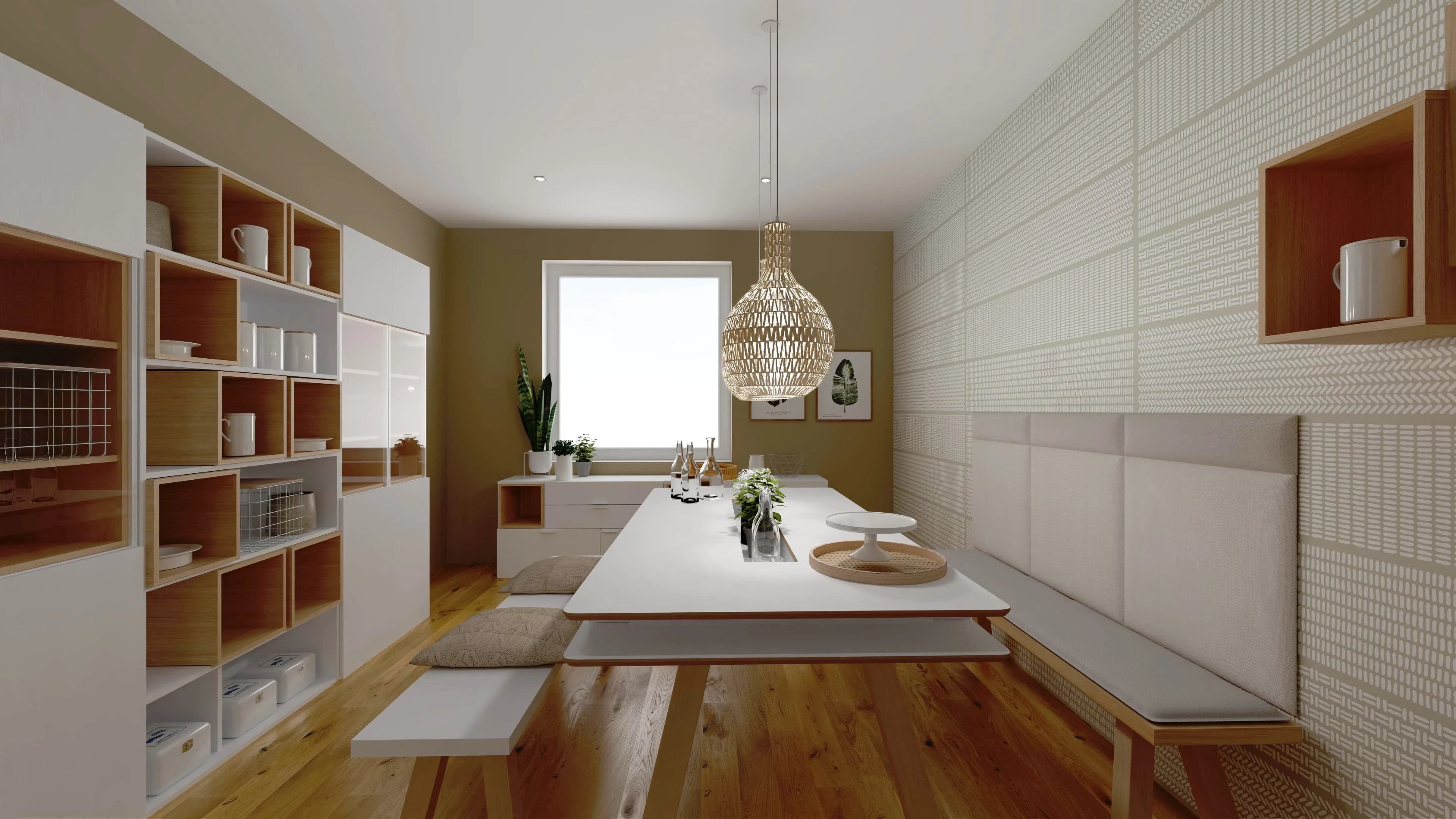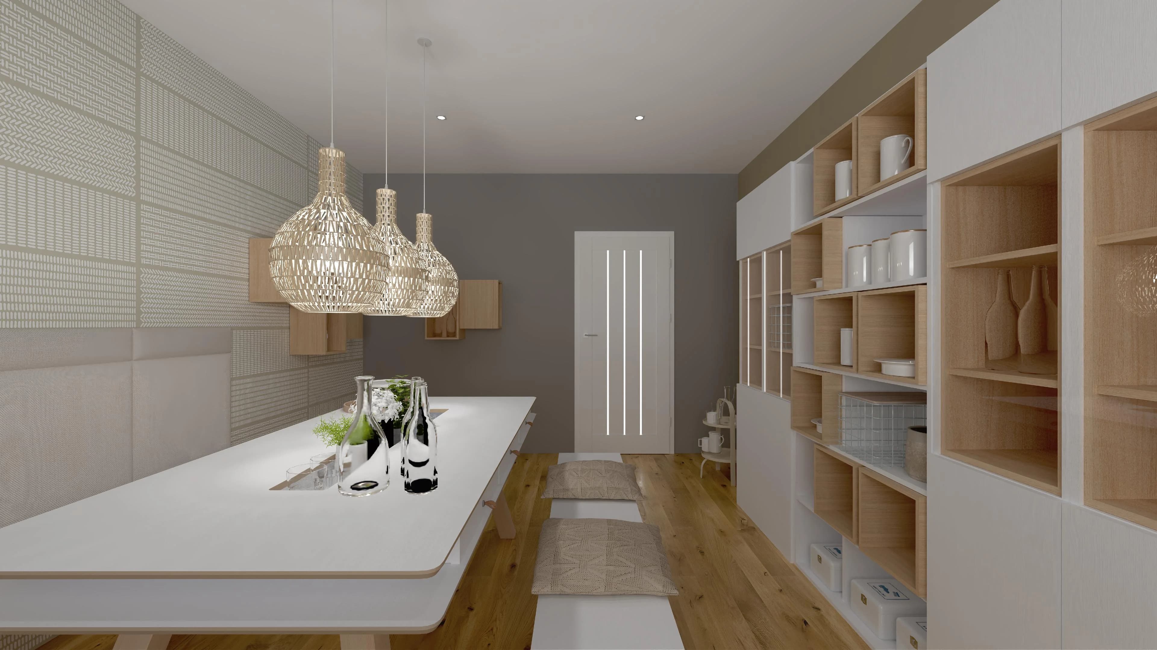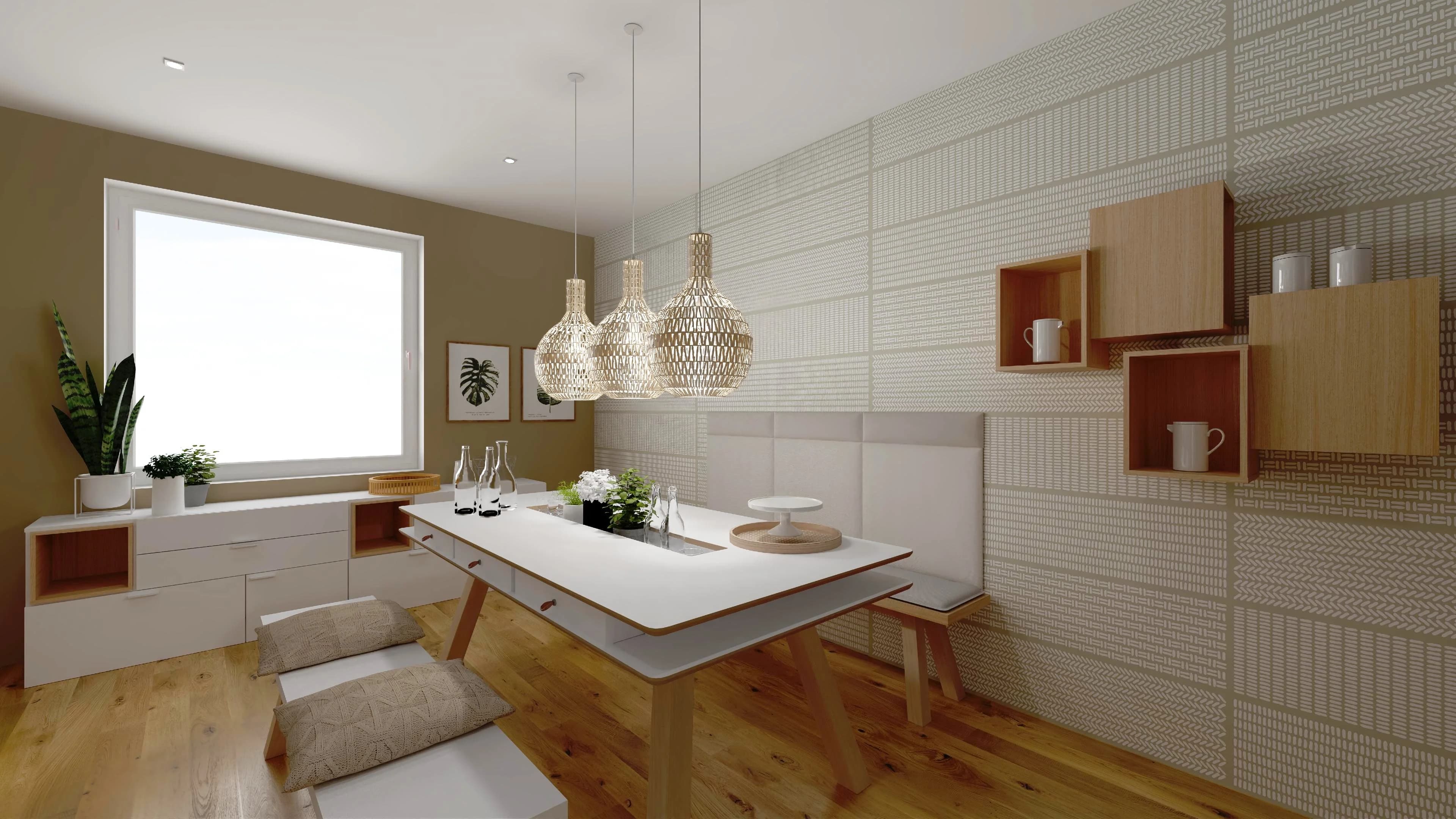 Królem tego wnętrza jest stół z podręcznymi schowkami na drobiazgi. Zamiast tradycyjnych krzeseł towarzyszą mu zgrabne ławki. Witryny z ledowym oświetleniem podkreślają ulubioną zastawę i wprowadzają przyjazną atmosferę. Dzięki ciepłym kolorom i panelom ściennym z ciekawym printem przestrzeń zyskuje na wyrazie i sprzyja wspólnemu biesiadowaniu.