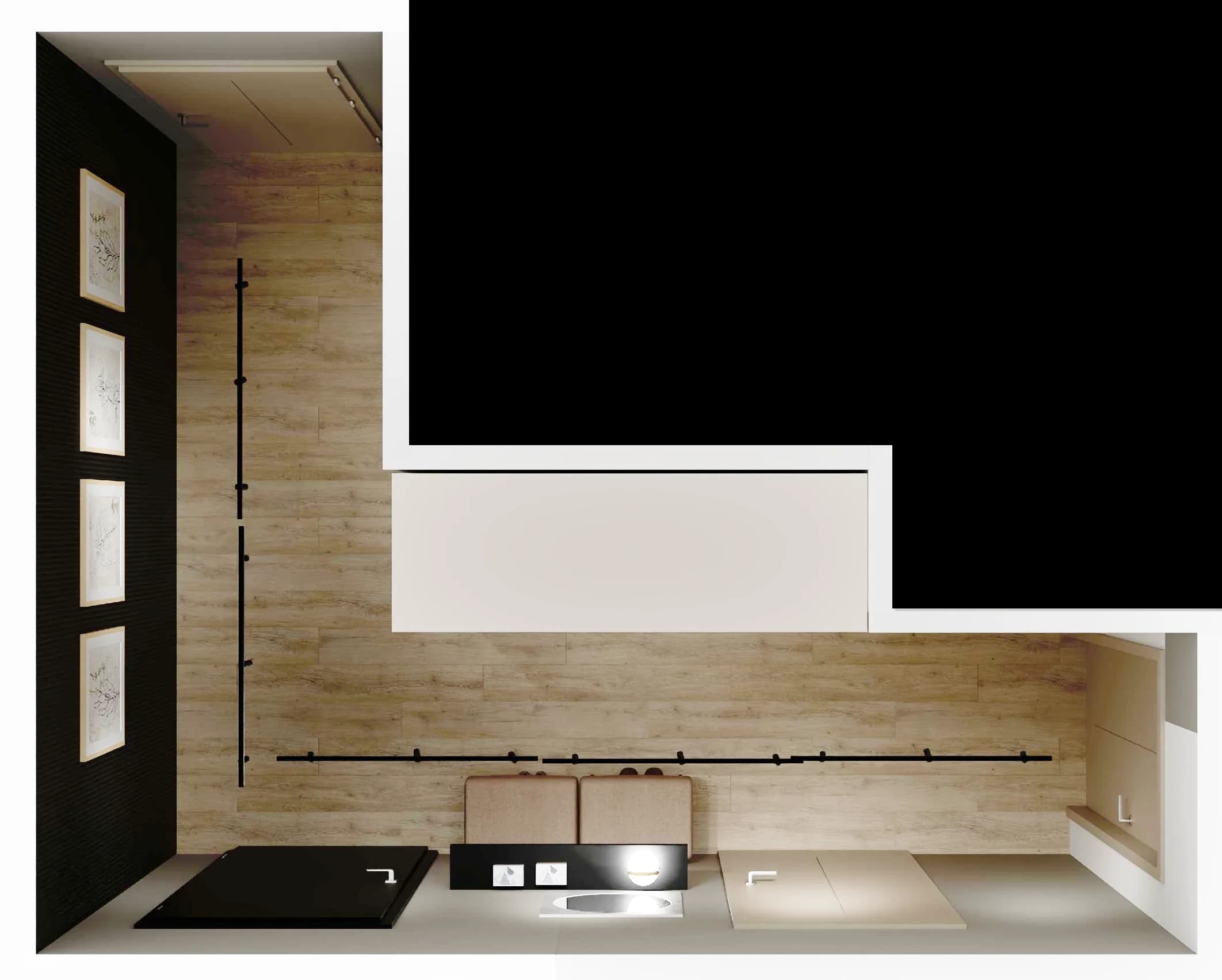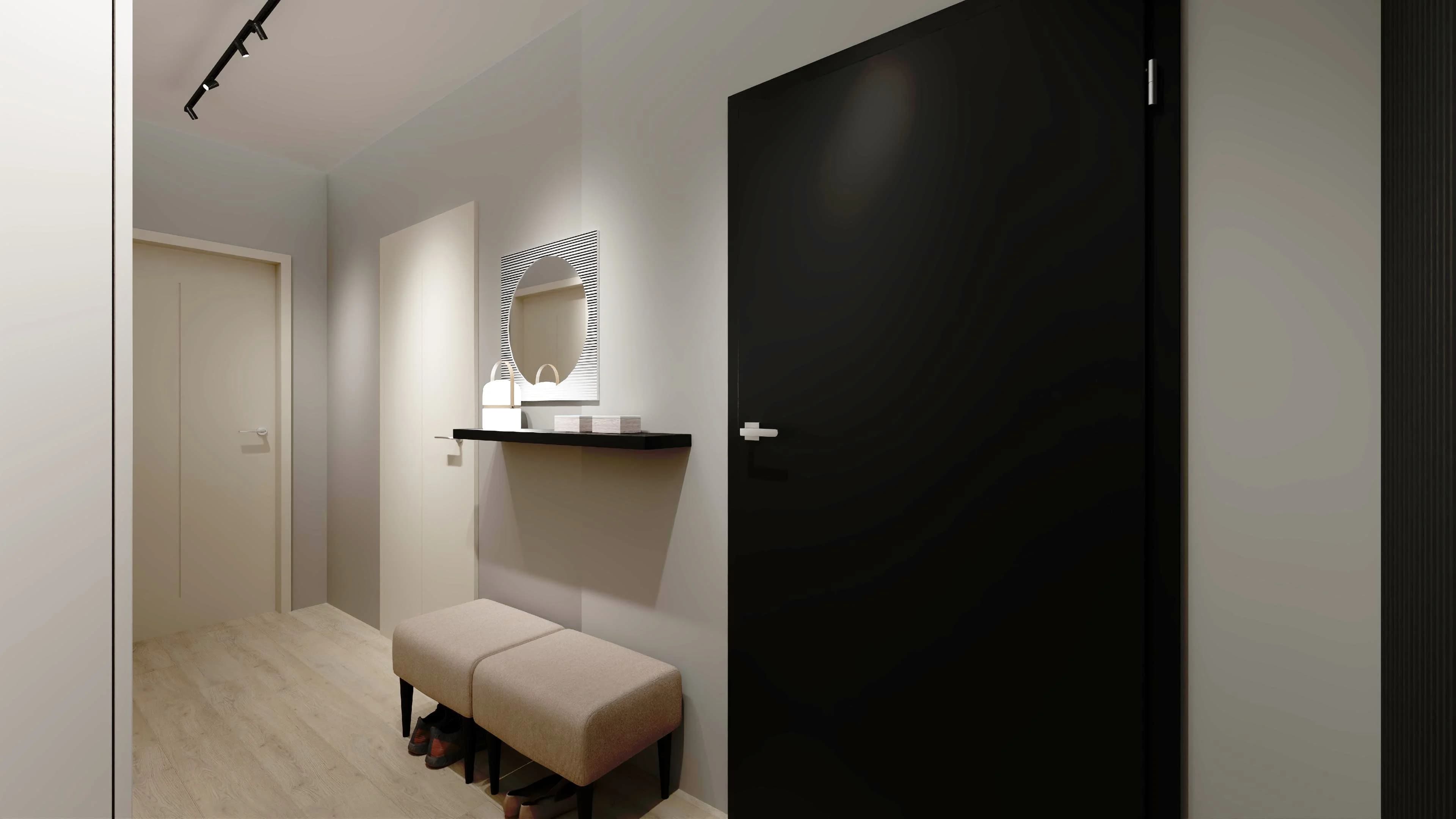Ciasny korytarz zyskuje na funkcjonalności dzięki sprytnym rozwiązaniom. Pakowna szafa (160 x 240 cm) ma boczną przystawkę na akcesoria do sprzątania oraz blendy, które wypełniają szczelinę między meblami i sufitem. Dwa pufy służą jako wygodne siedzisko, a niewielka półka ścienna to idealne miejsce na klucze. Charakteru dodaje przestrzeni ściana czarnych lameli.