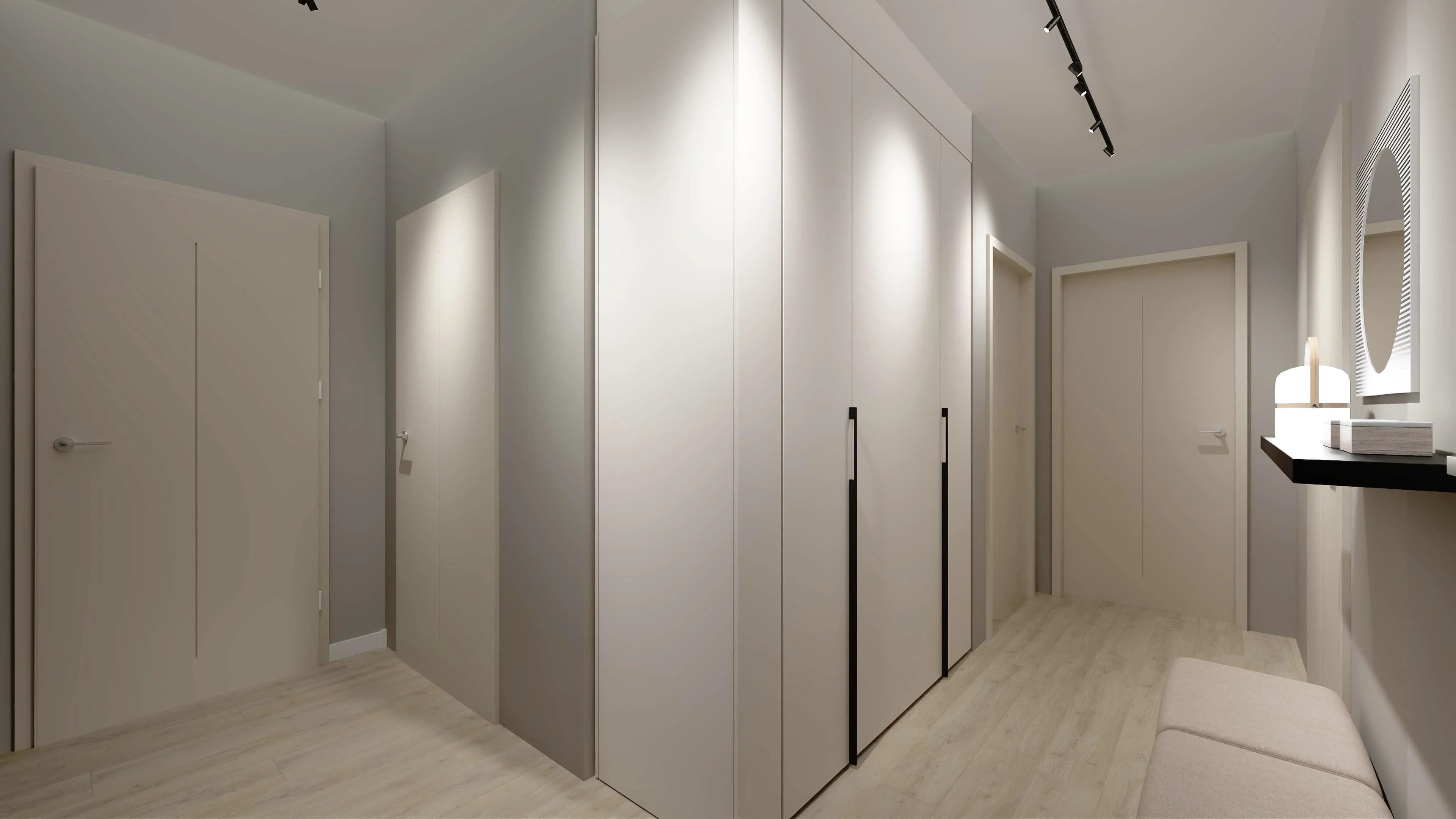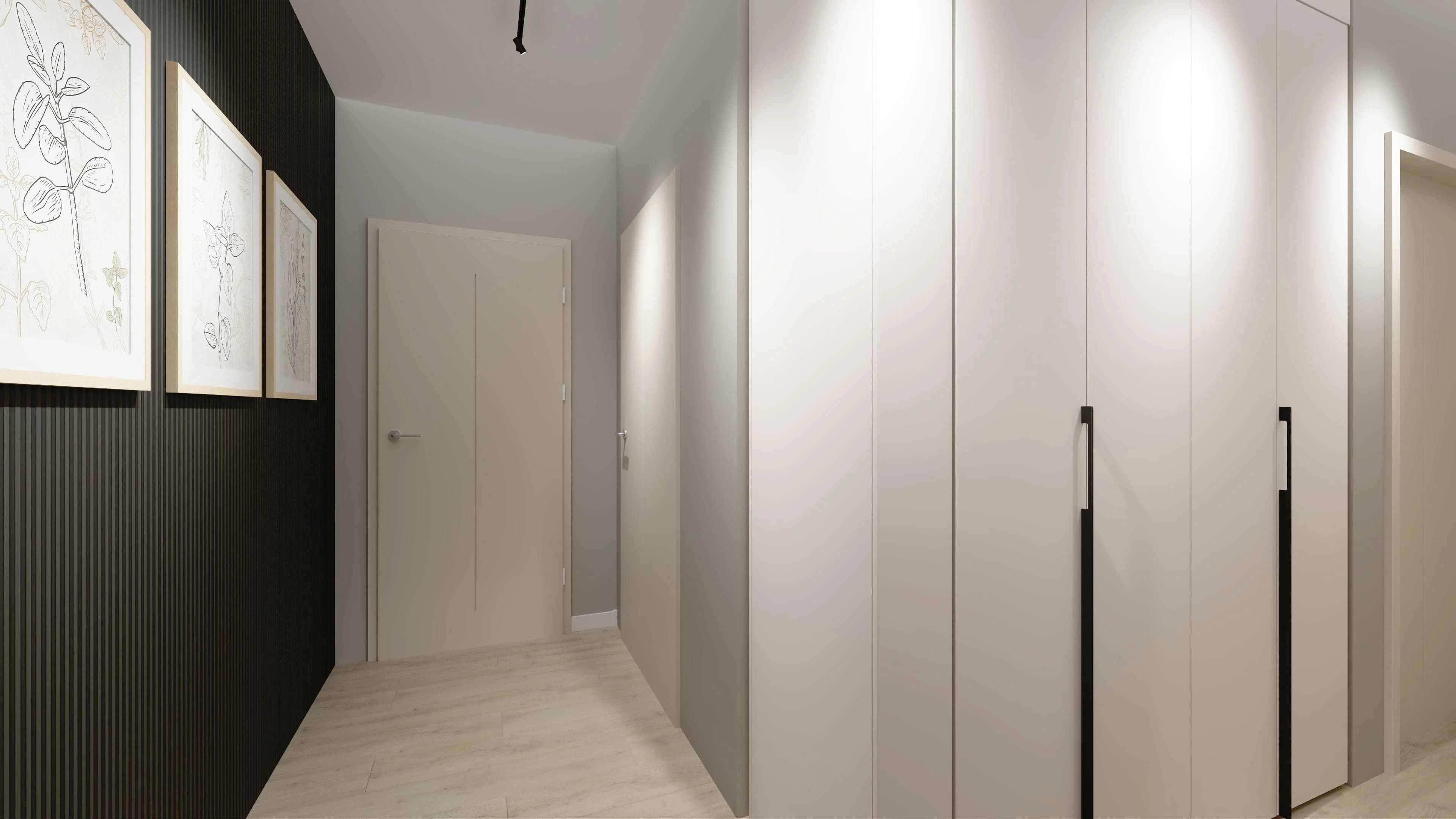Wąski korytarz z praktycznymi szafami i jasną podłogą