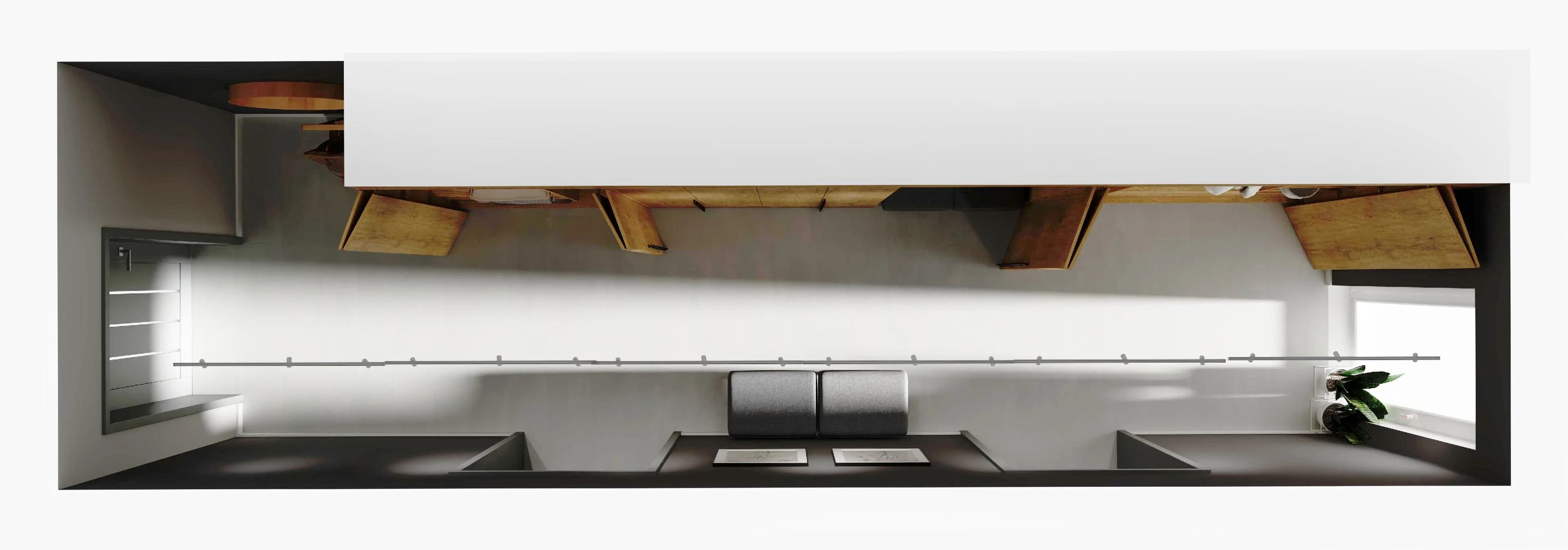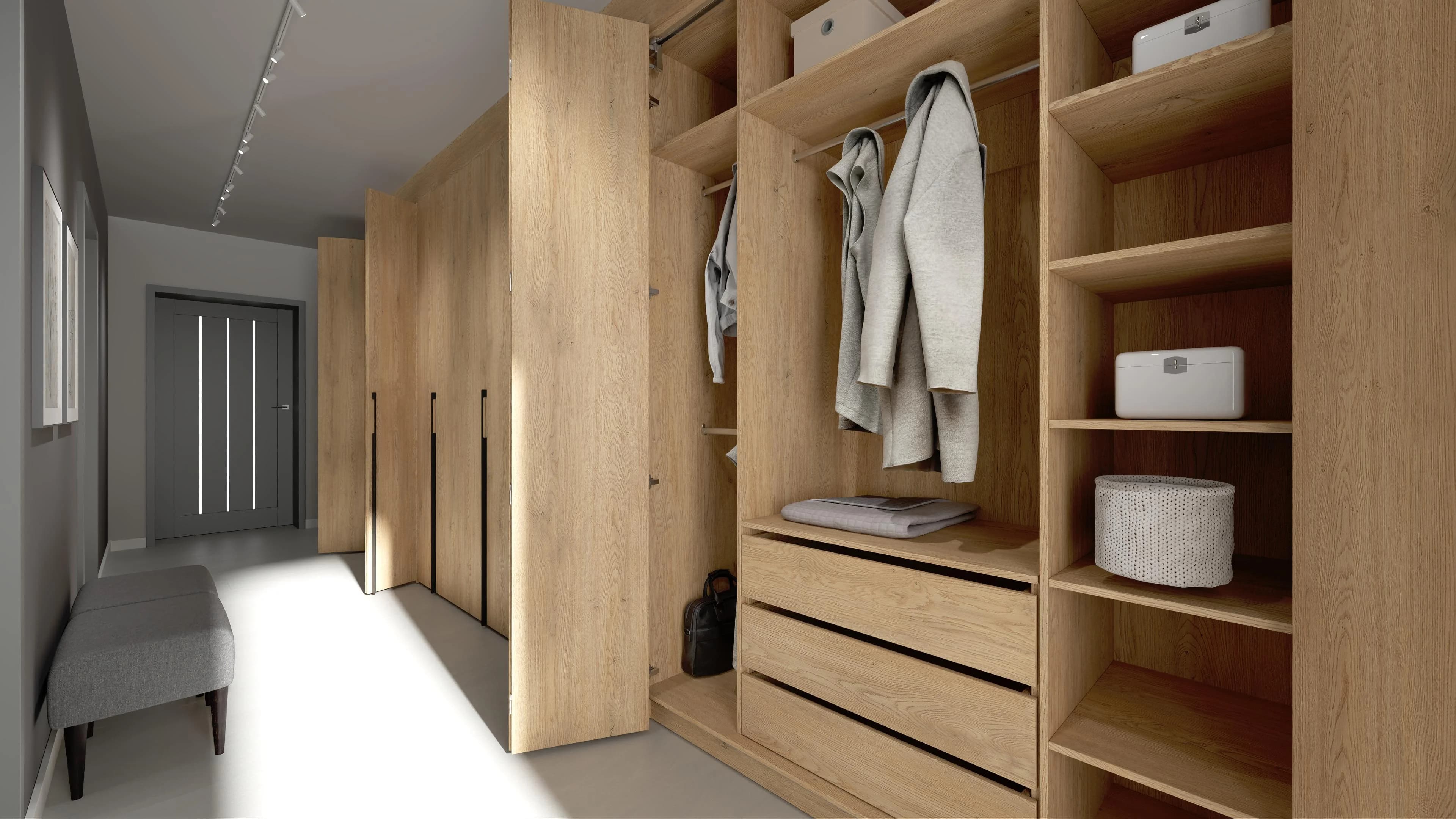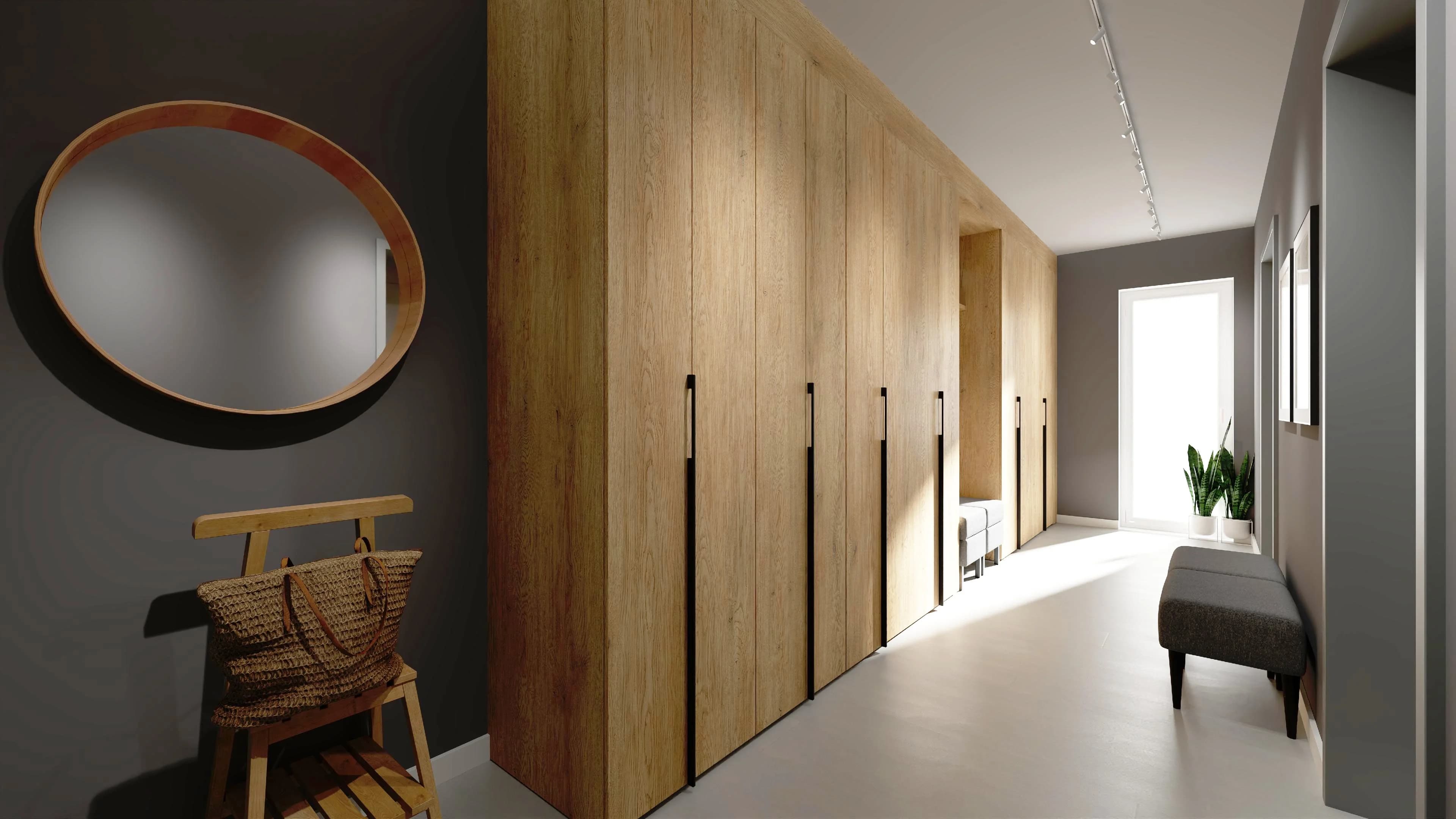 Wąski korytarz z zabudowanymi szafami