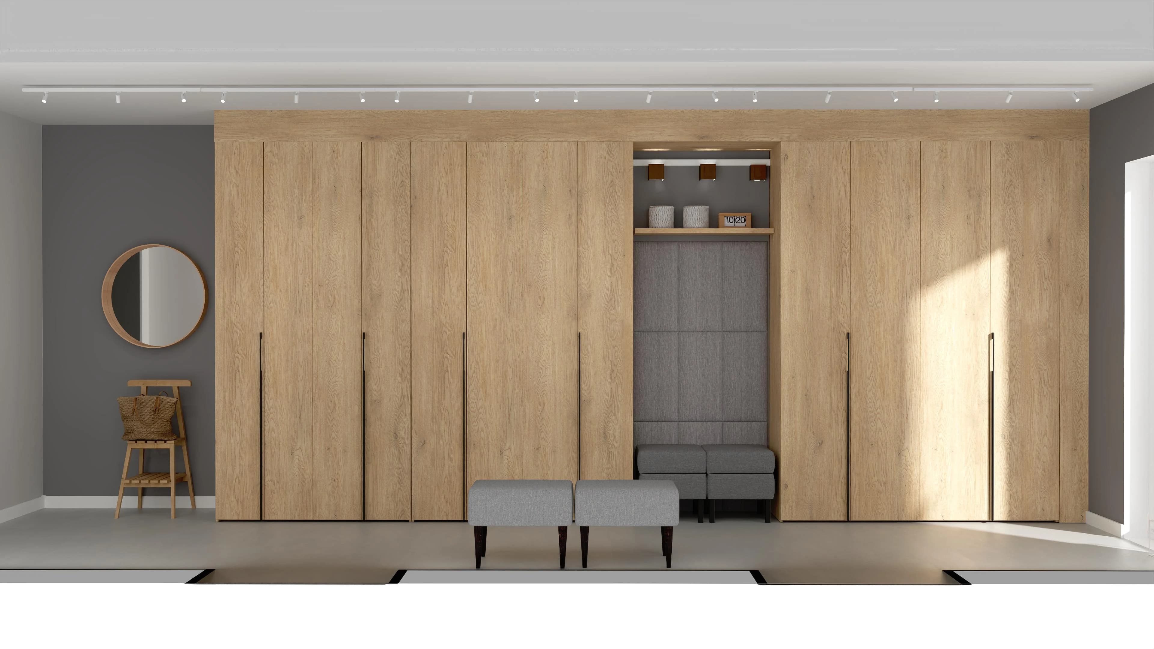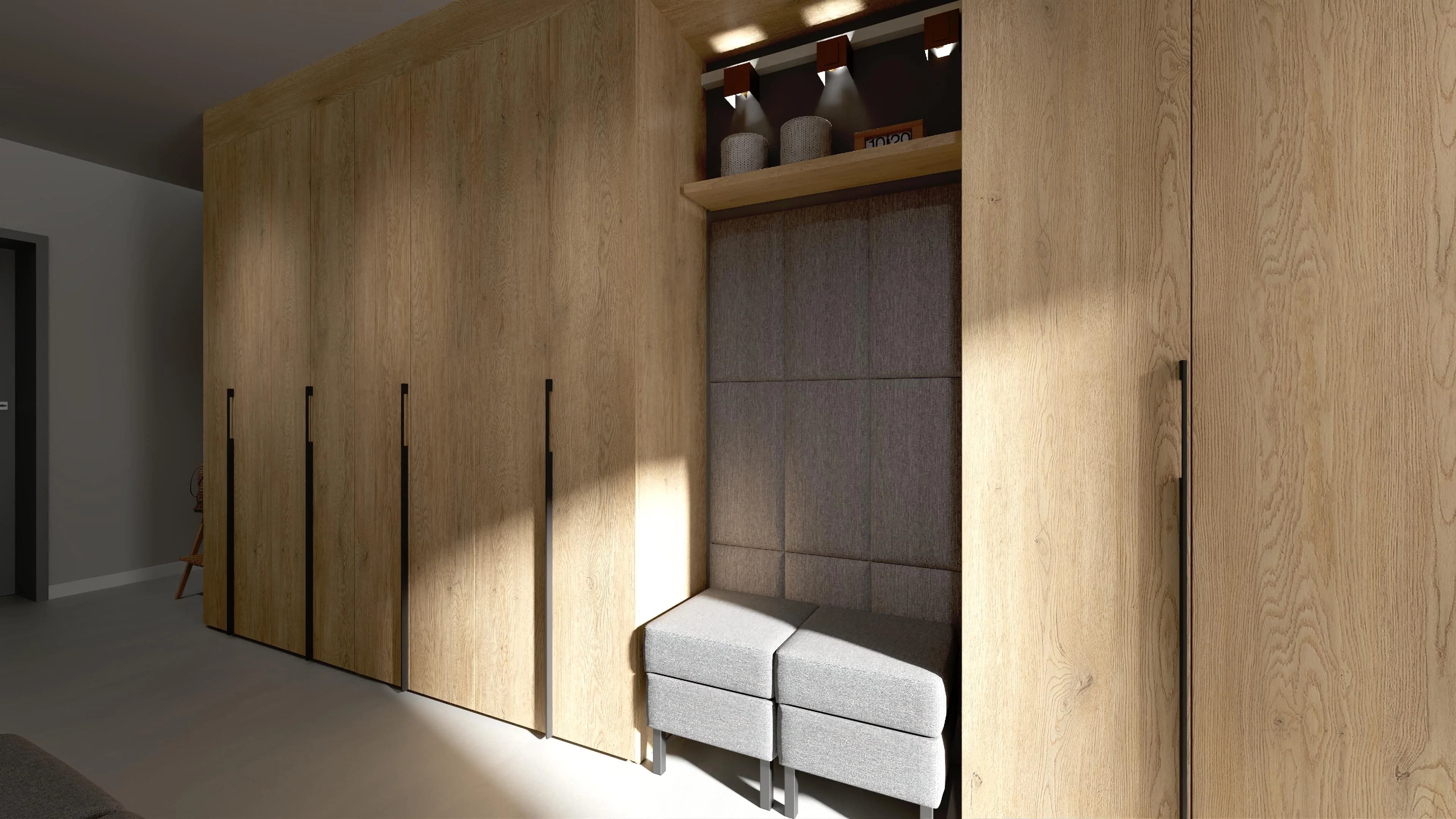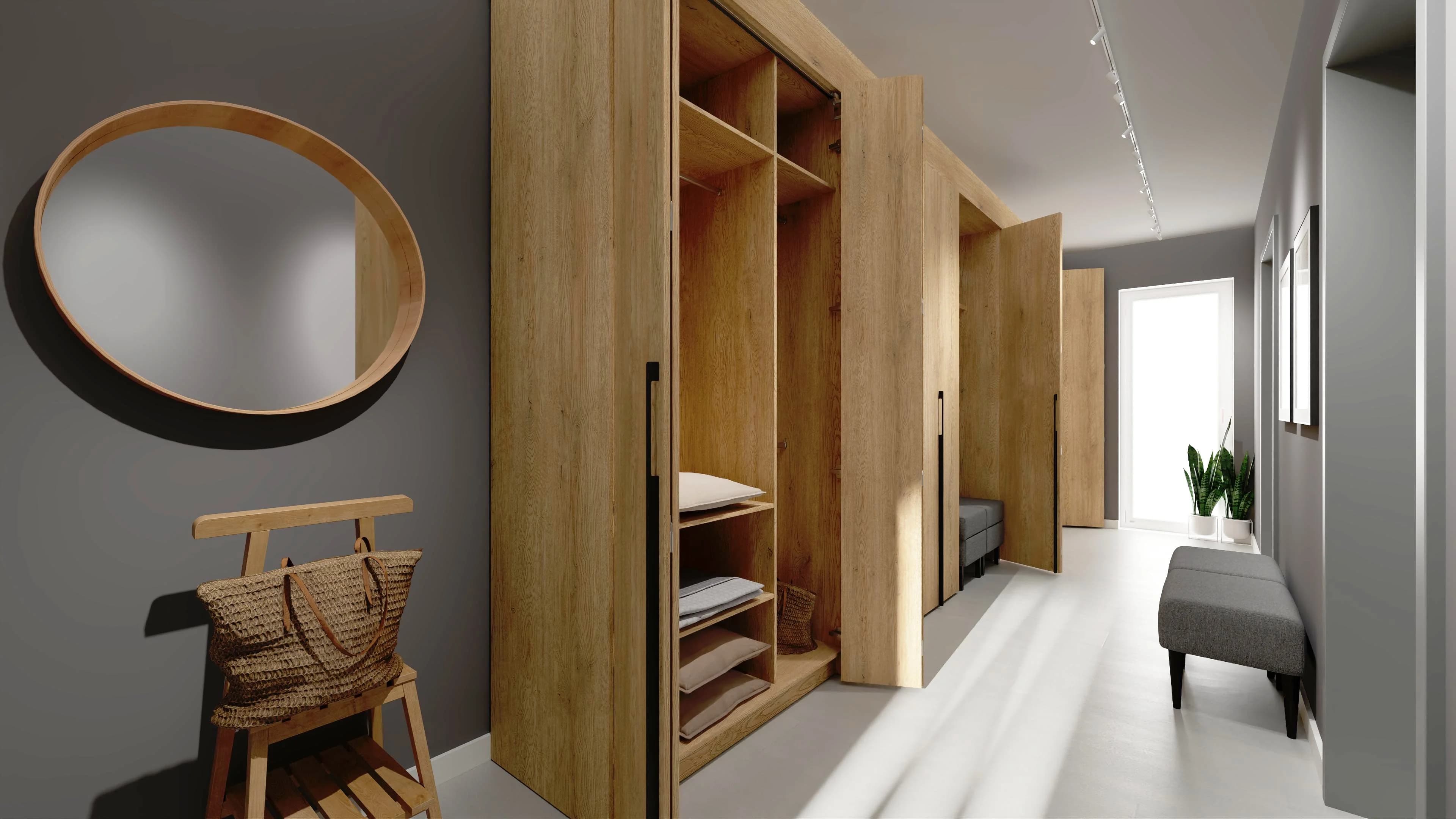 Przytulnie zaaranżowana przestrzeń, mimo małego metrażu, jest wygodna w użytkowaniu. Dzięki trzem pojemnym szafom (125x240, 140x240 i 175x240 cm) znajdzie się tutaj mnóstwo miejsca na komfortowe przechowywanie. W praktycznej wnęce z pufem można wygodnie przysiąść, by włożyć buty, a w okrągłym lustrze szybko sprawdzić wygląd przed wyjściem.