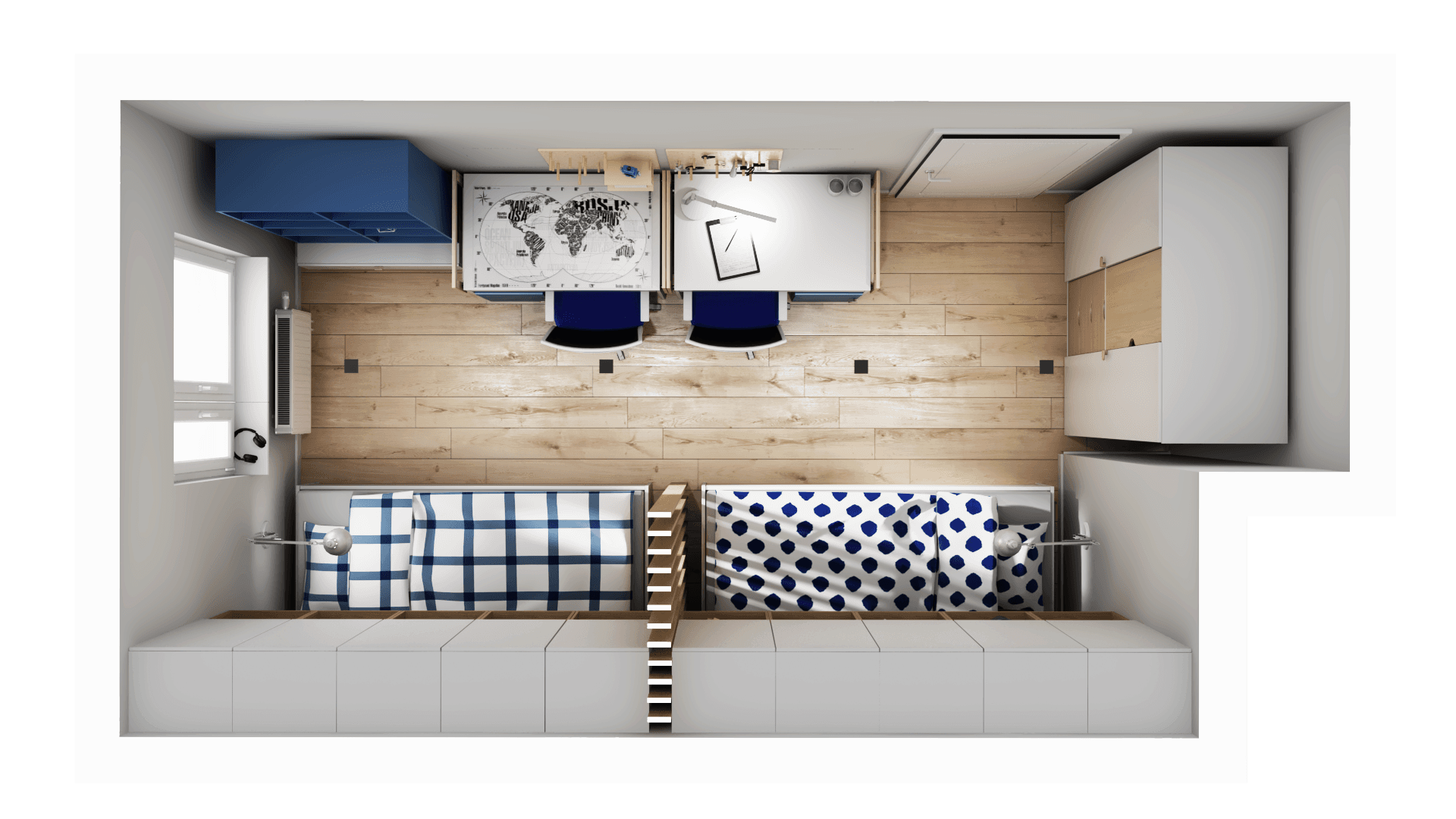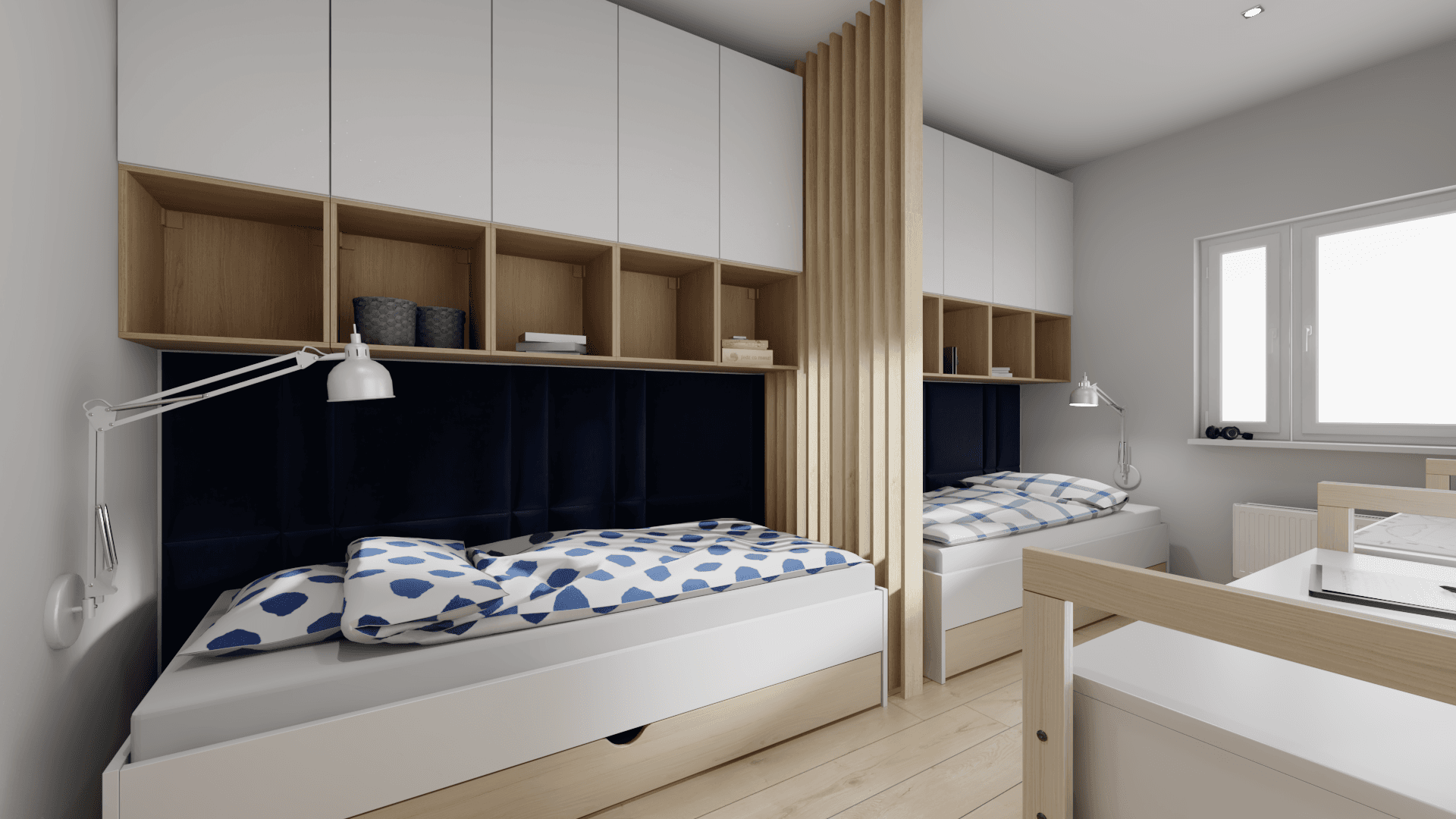 Thanks to the universal colour scheme and practical furnishings, the room of the two older children can grow up together with them. On separate beds, each child will find a private space for themselves. A wall with desks and organisers promotes comfortable learning and the development of passions. When things no longer fit in the wardrobe, the hanging lockers and bed drawers come to the rescue.