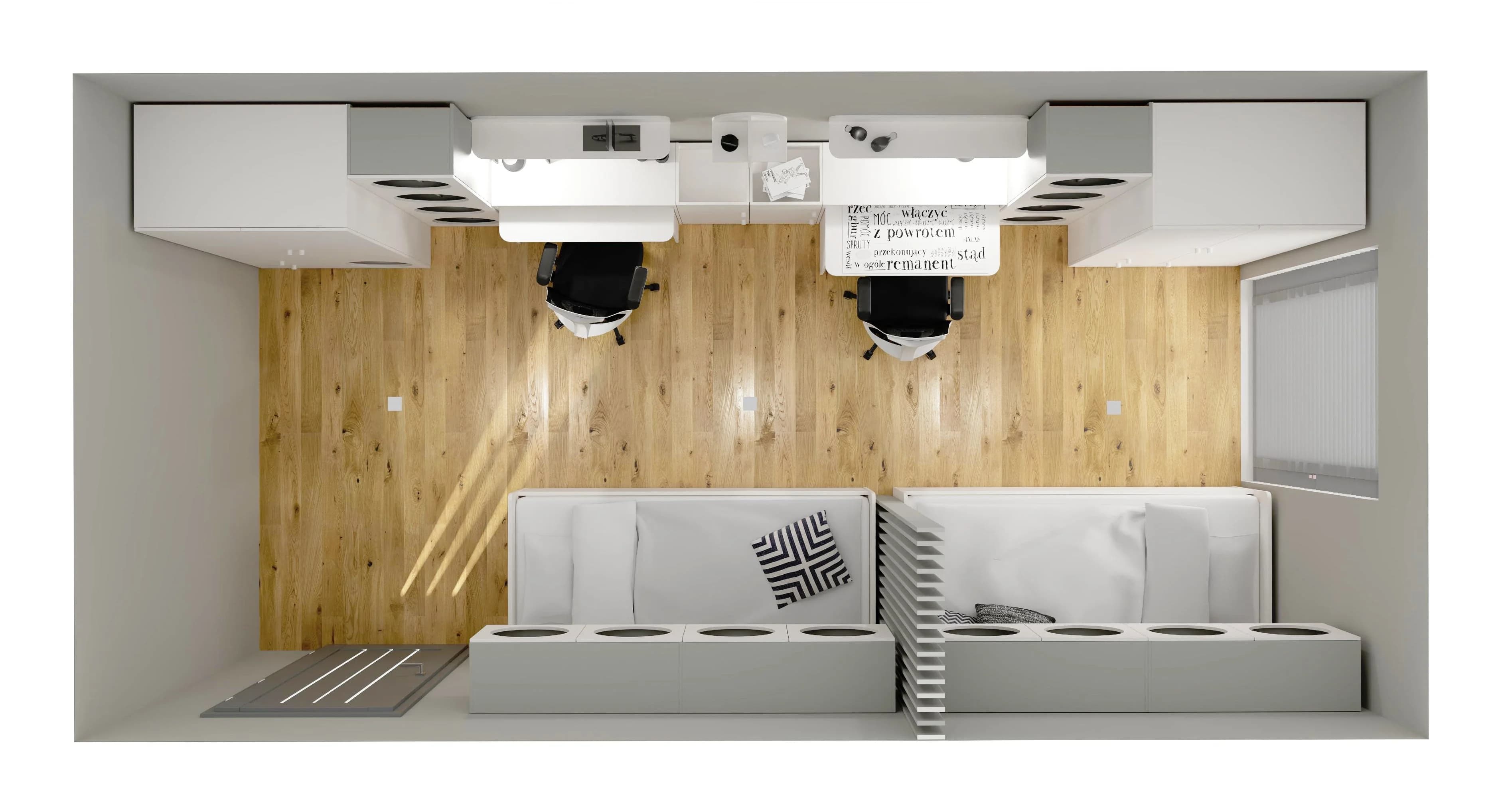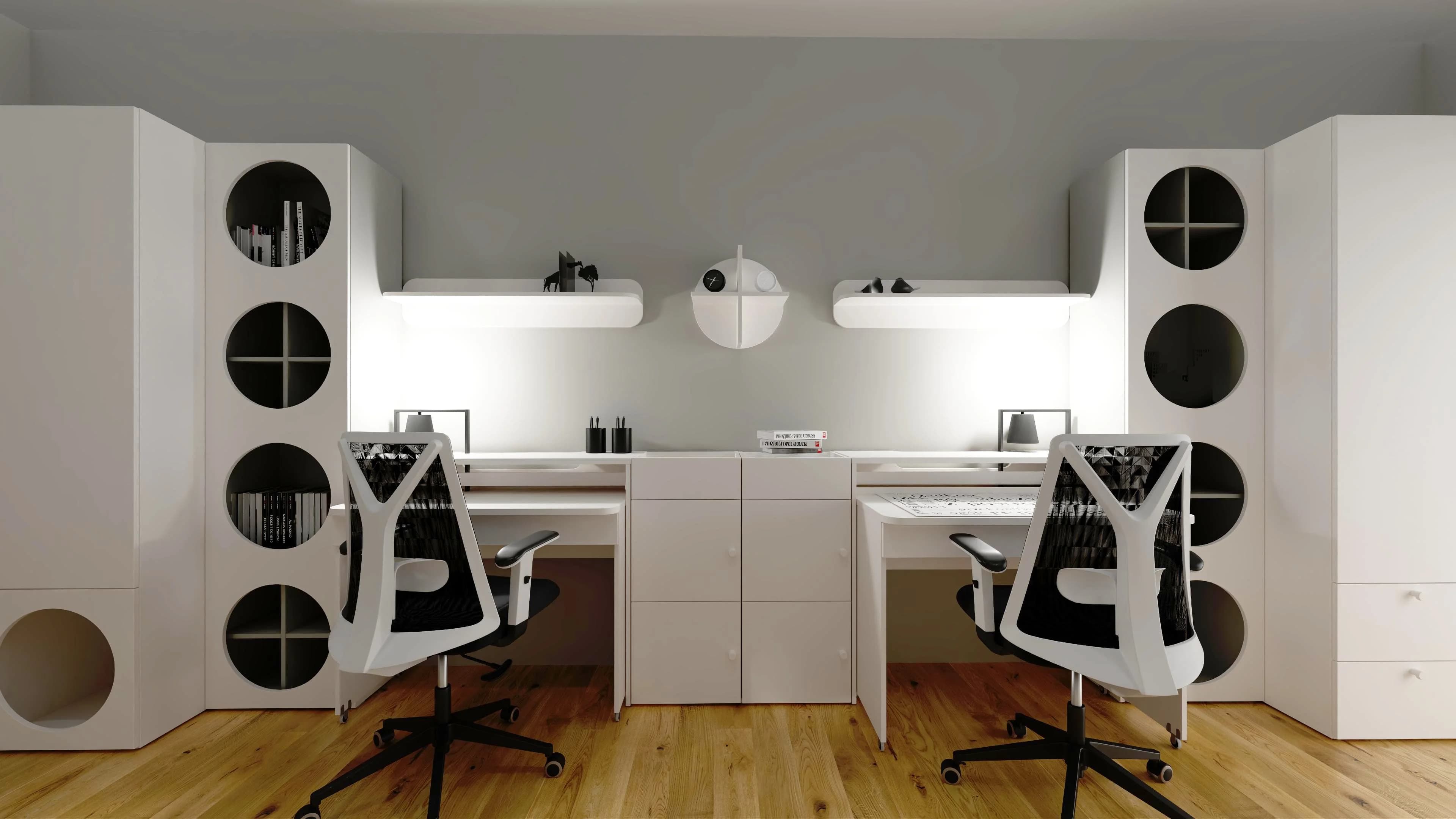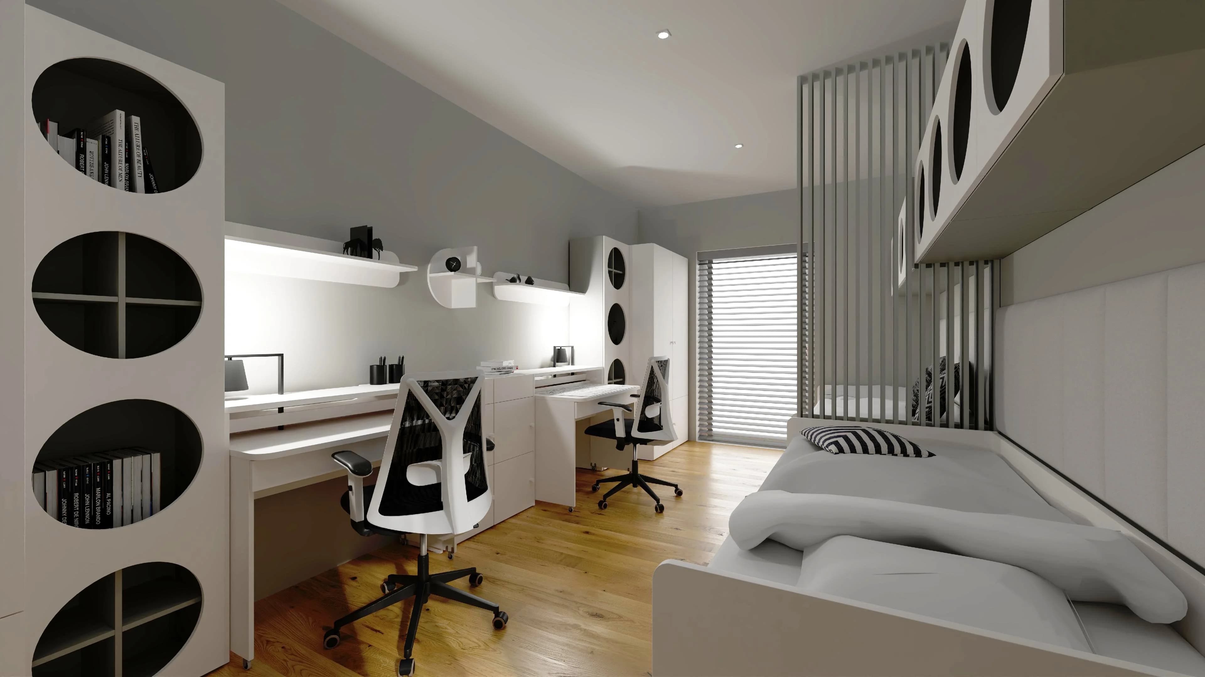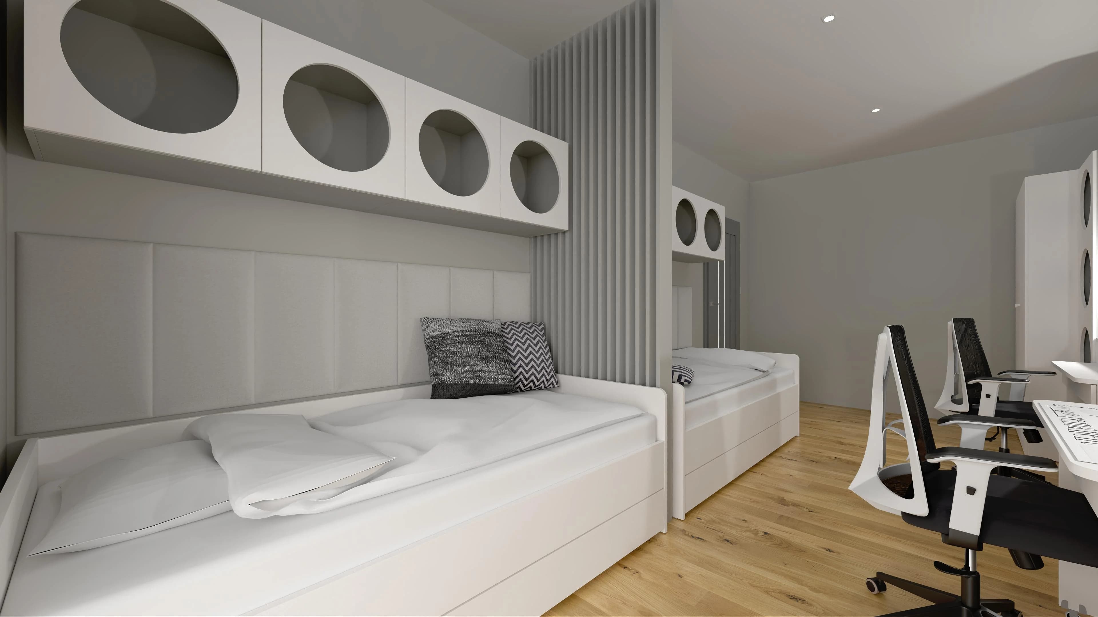 Dzięki neutralnym kolorom i funkcjonalnym meblom pokój starszaków może dorastać razem z nimi. Ustawione tuż przy ścianie łóżka, oddzielone wysoką ścianką z lameli, pozwalają dzieciom być razem, a jednocześnie zachować prywatność. Wysuwane biurka tworzą idealne warunki do odrabiania lekcji i nauki. Utrzymanie porządku jest prostsze dzięki dużym regałom.