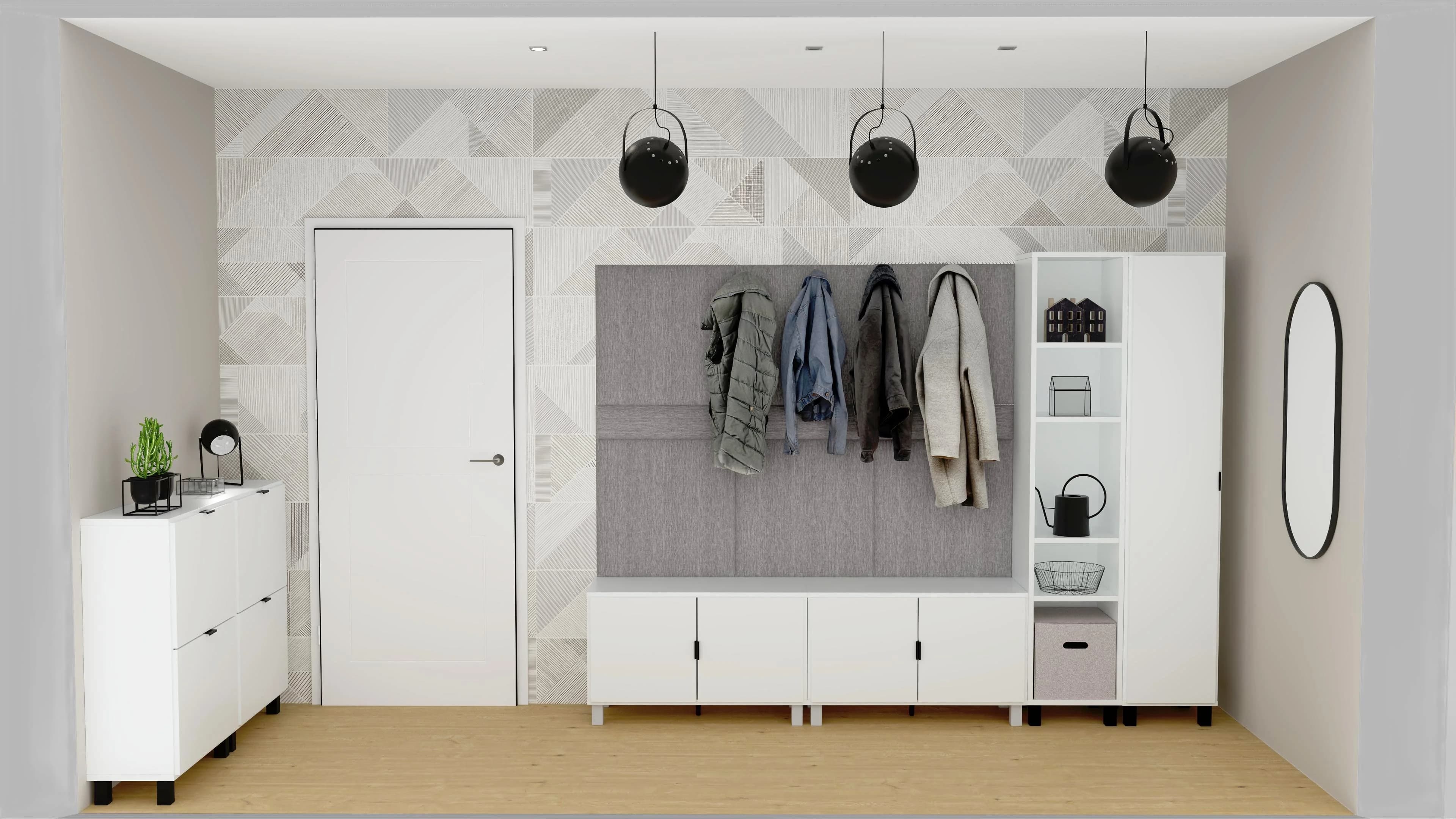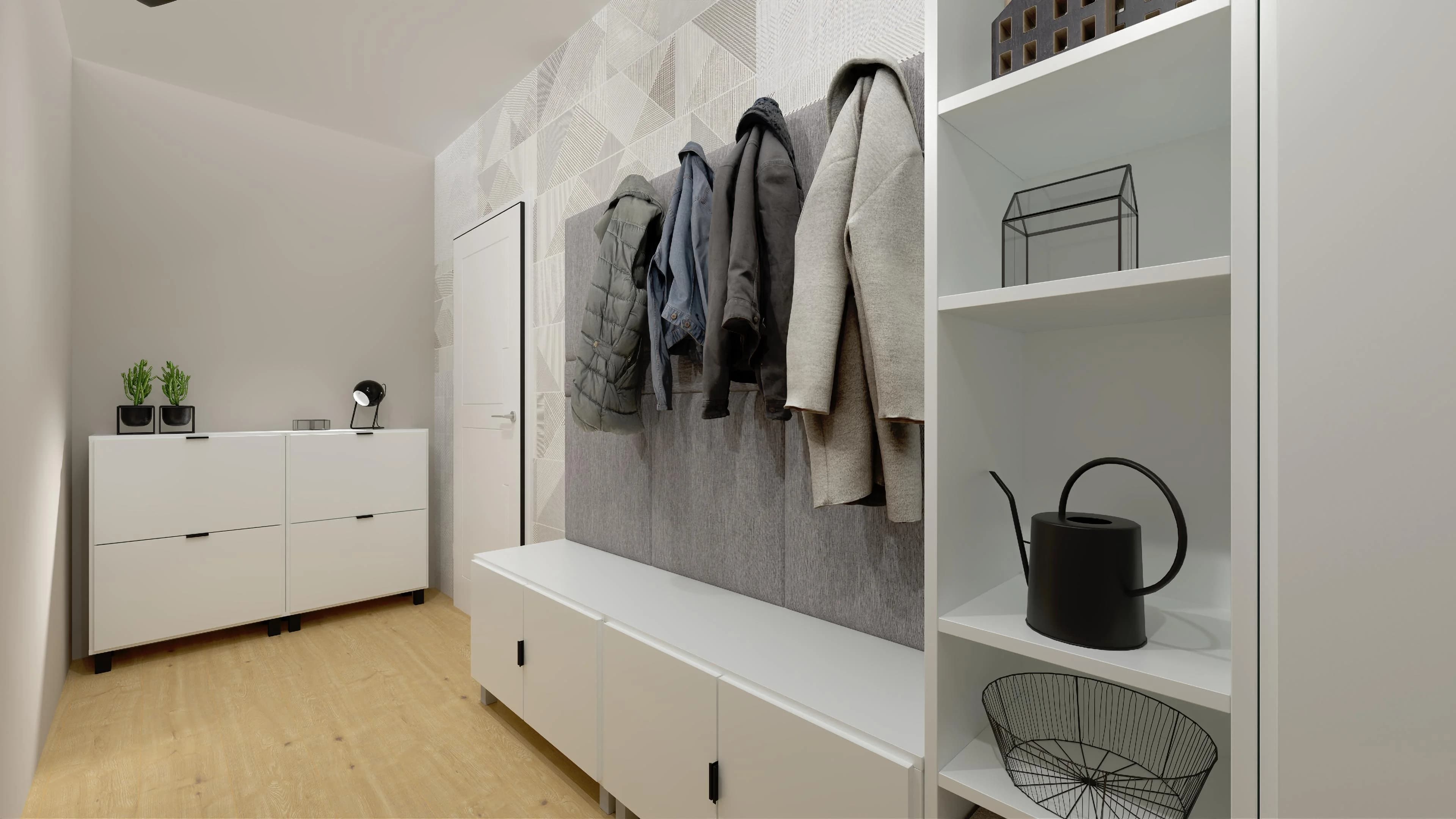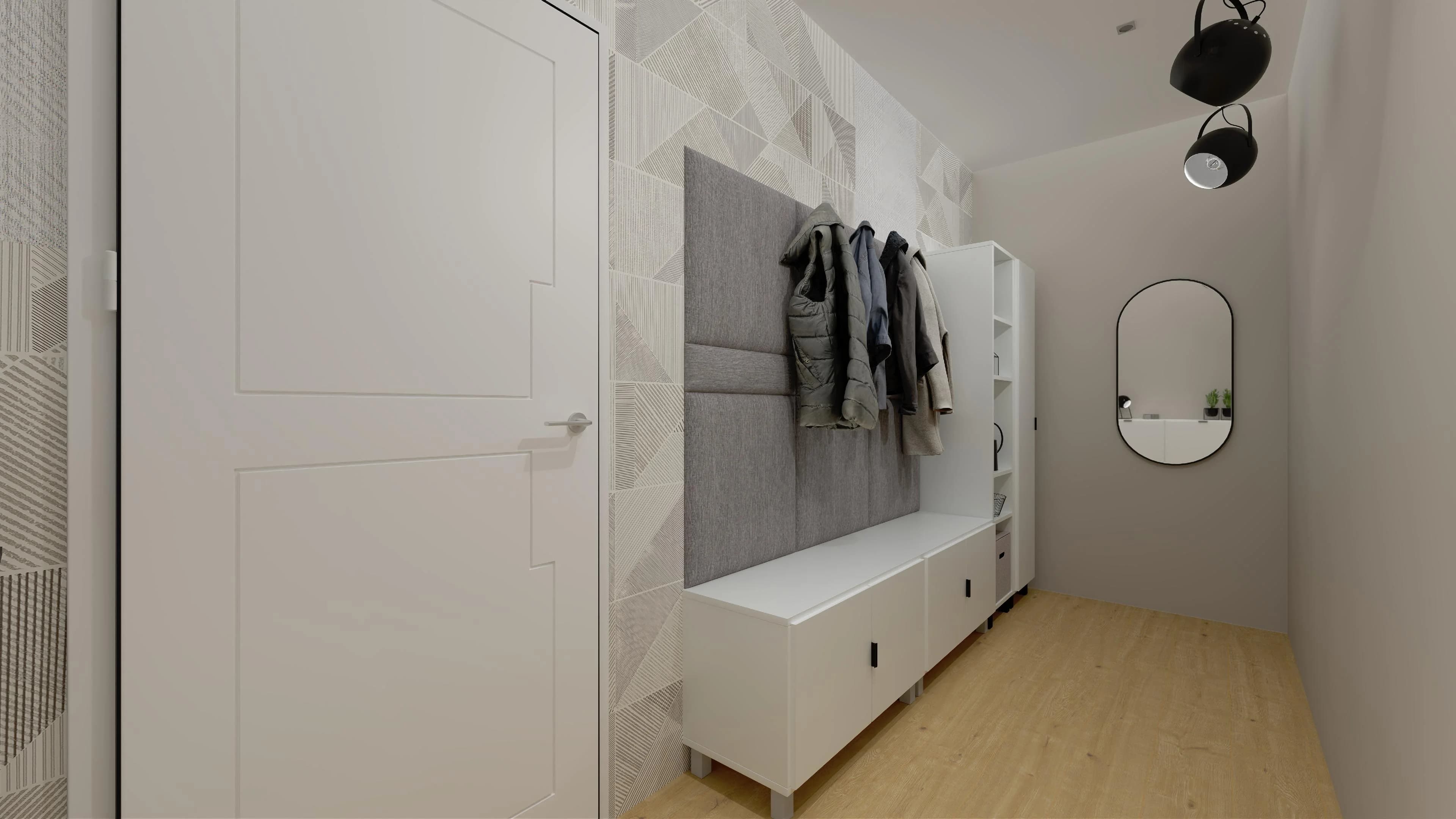 The small hallway has been decorated in bright colours to make it optically appear larger. White furniture keeps shoes and accessories neatly arranged, while an upholstered wall serves as a hanger for seasonal jackets and handbags. In the wall mirror, you can look at yourself just before you leave. The wooden floor makes the interior feel cosy.