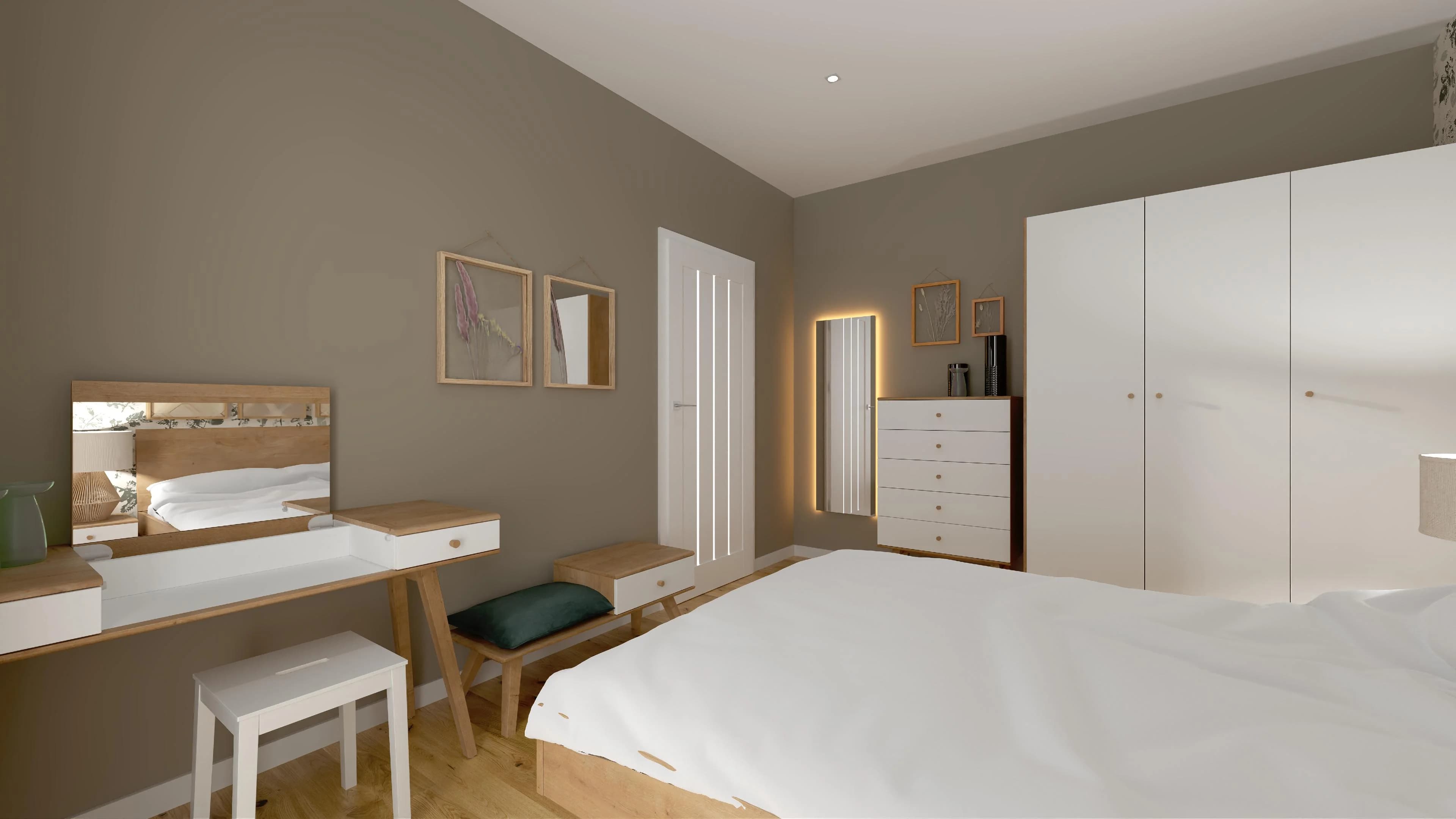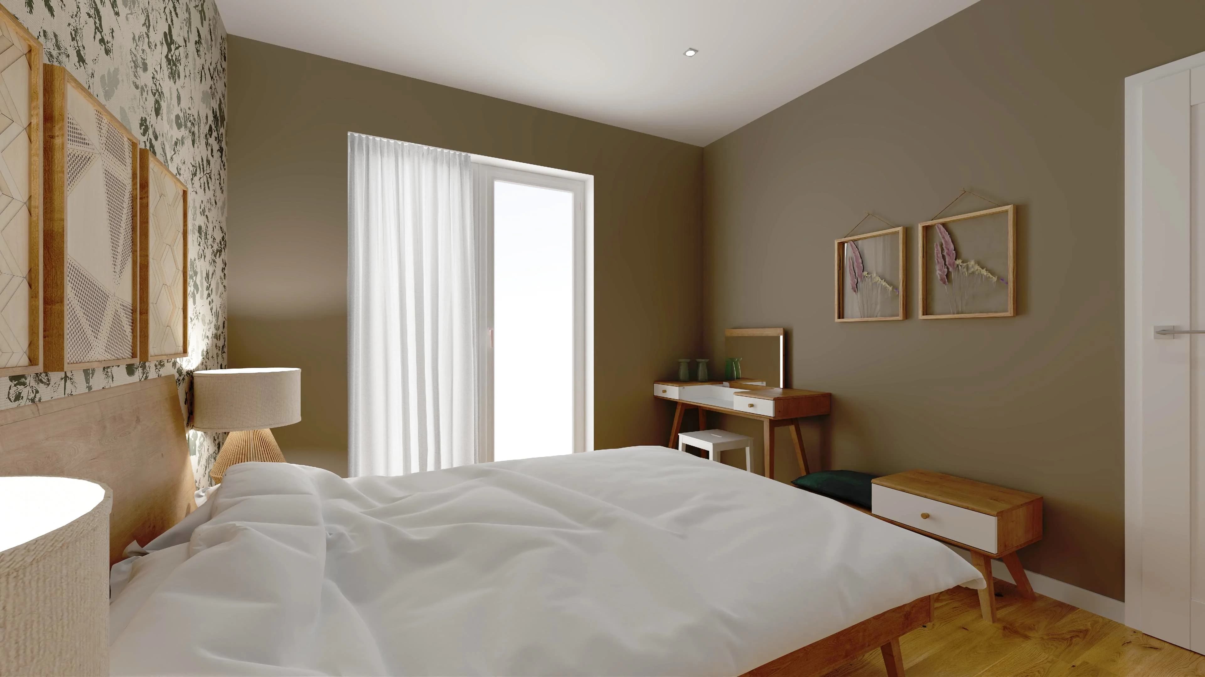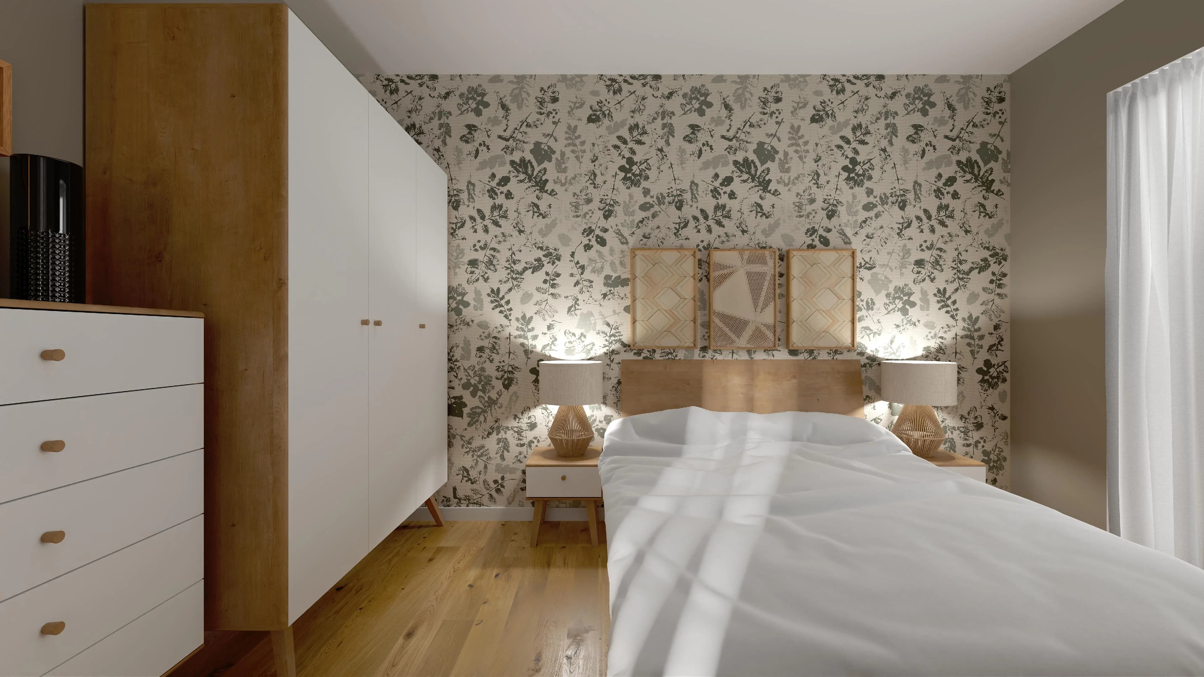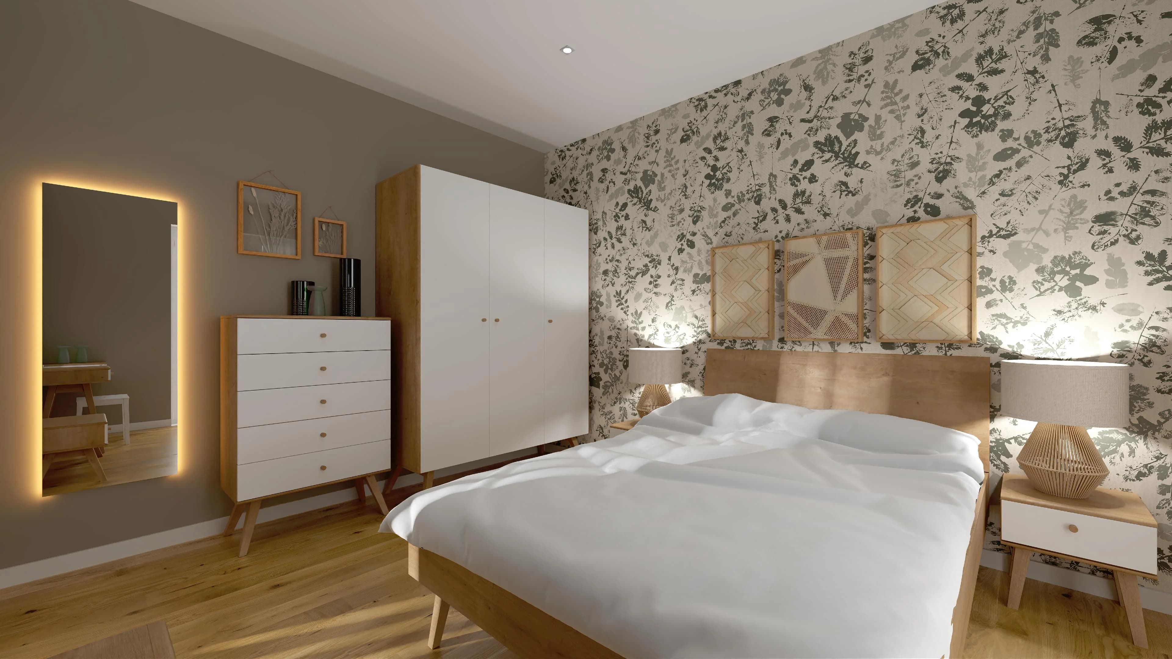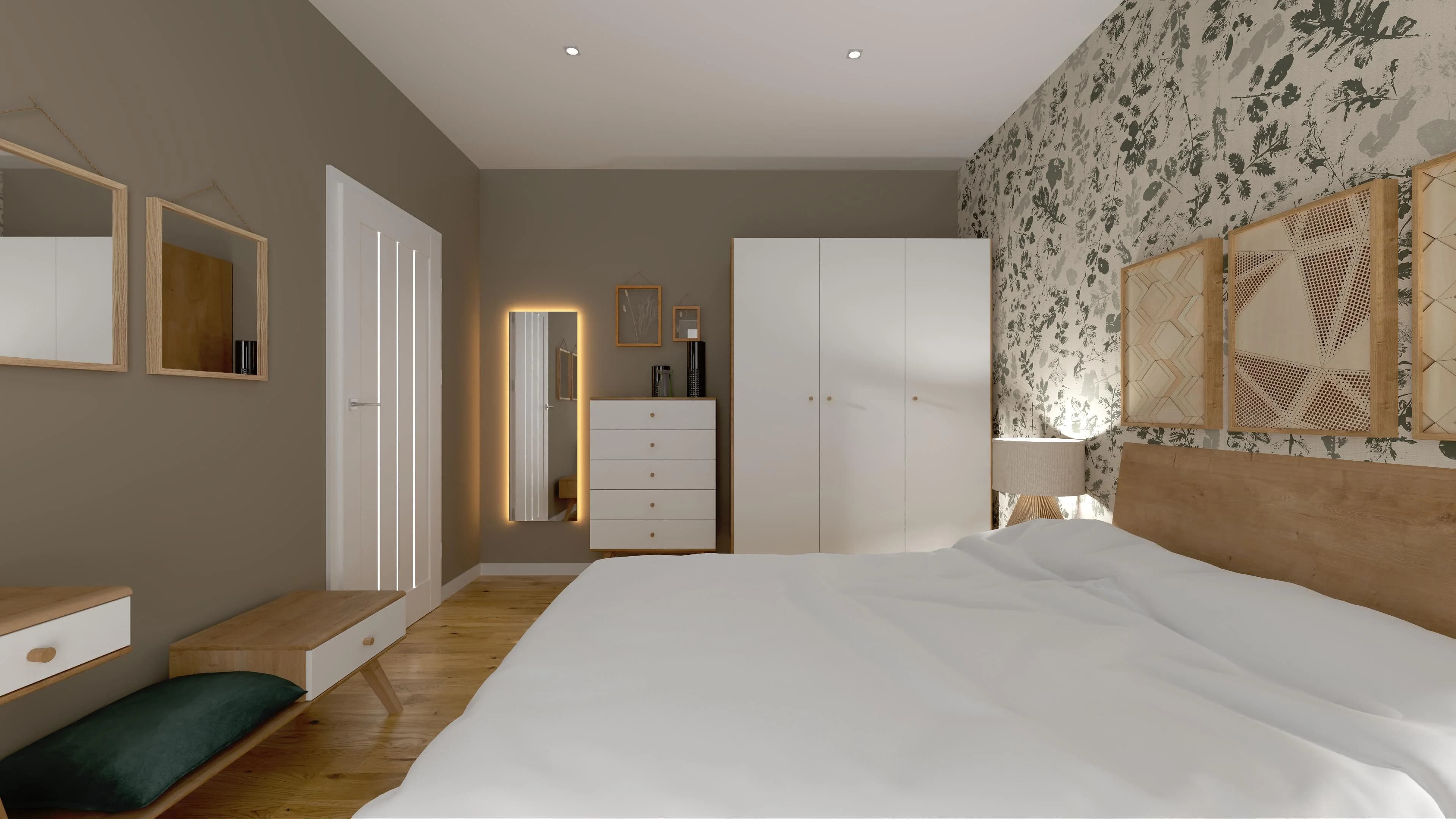 Urocza sypialnia jest zaaranżowana przytulnie i komfortowo. Dominują w niej przygaszone barwy ziemi i kolory drewna. Duże łóżko i podręczne szafki nocne tworzą idealne miejsce do relaksu dla dwóch osób. Pakowne meble zapewniają sporo przestrzeni do organizacji odzieży i obuwia. Charakter wnętrza definiują panele z wzorem liści oraz dodatki w naturalnym stylu.