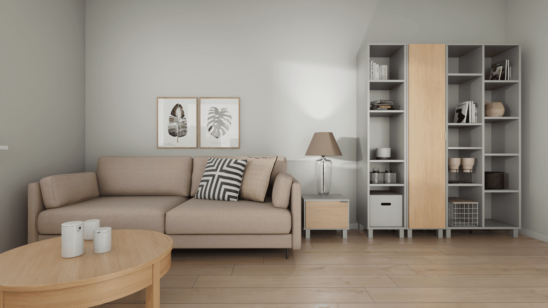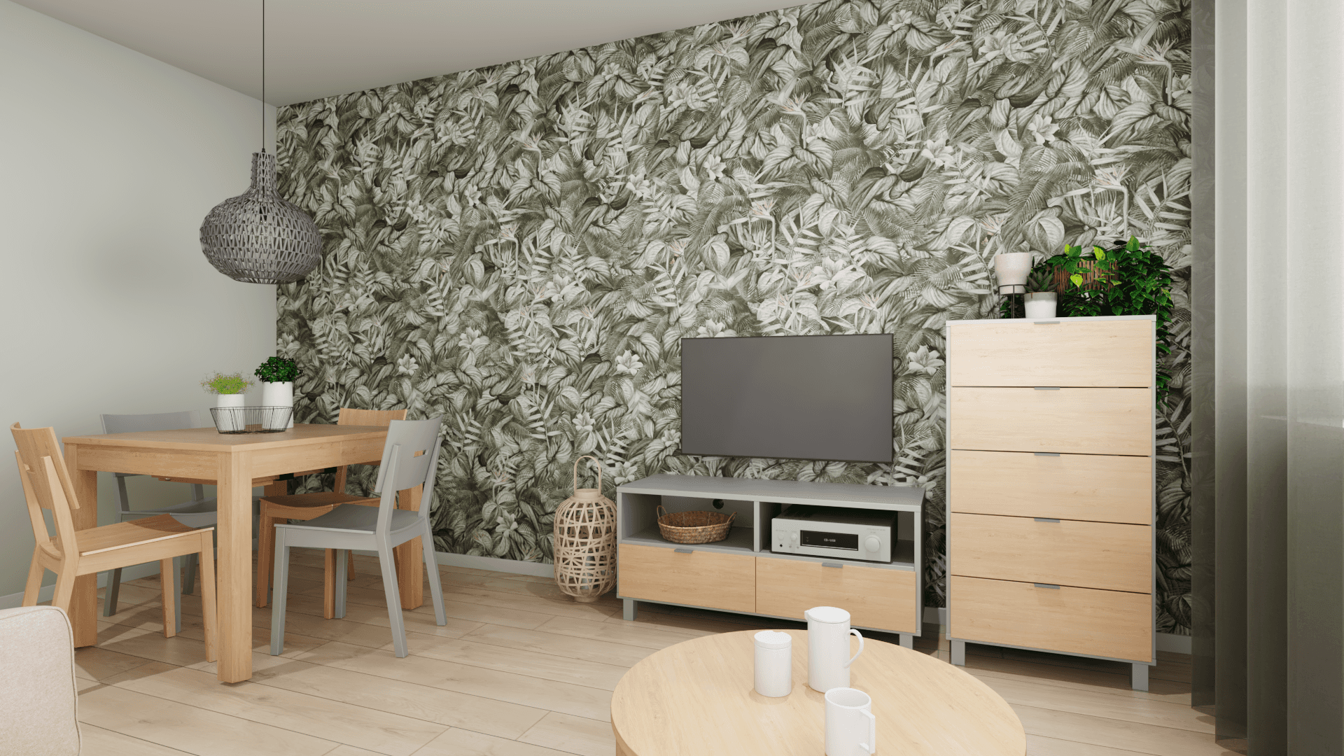 The cosy room, despite its small size, serves many functions. The sofa provides a comfortable place to rest during the day and at night. The square table with chairs allows you to receive guests and, if necessary, transforms into a workplace. A calm arrangement with practical furniture will suit the needs of older people perfectly.