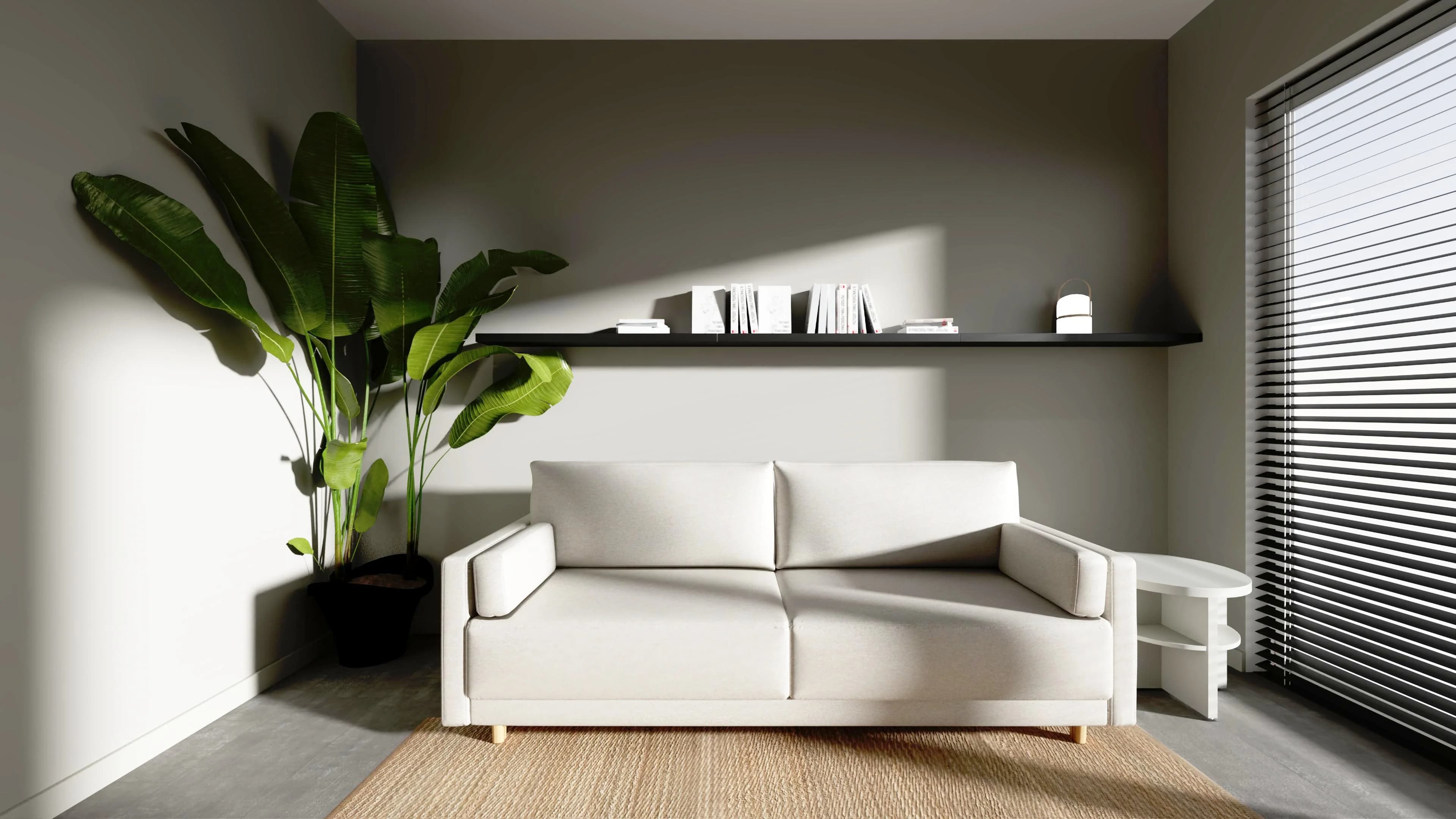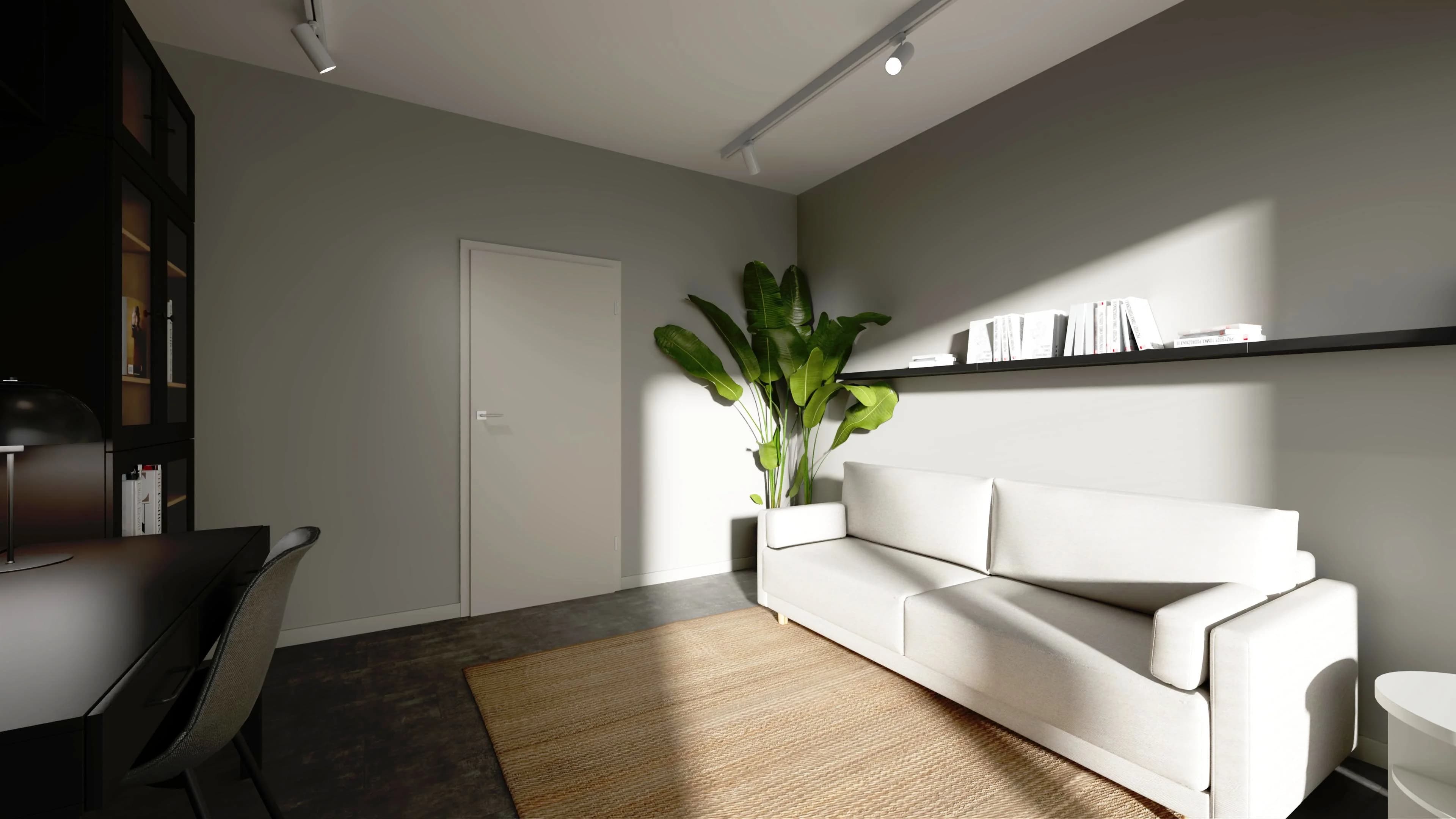 Ta przestrzeń inspiruje do rozwoju swoich pasji. Minimalistyczny wystrój wnętrza sprzyja wyciszeniu i skupieniu. Dzięki zabudowie z regałów jest tu mnóstwo miejsca na książki i dokumenty, a przy biurku można wygodnie popracować. Tapicerowana sofa zachęca do przerw, gdy głowa potrzebuje oddechu. O przytulną stronę aranżacji dba duży dywan.