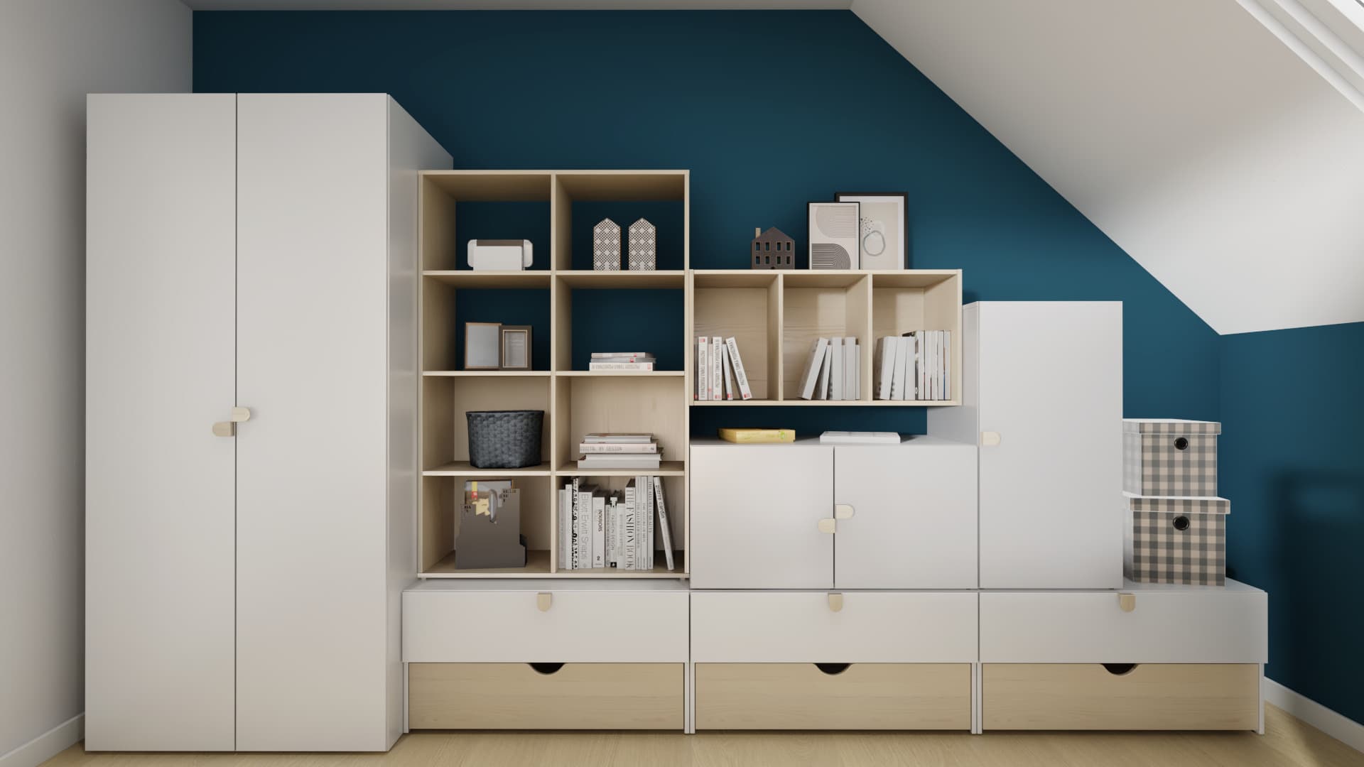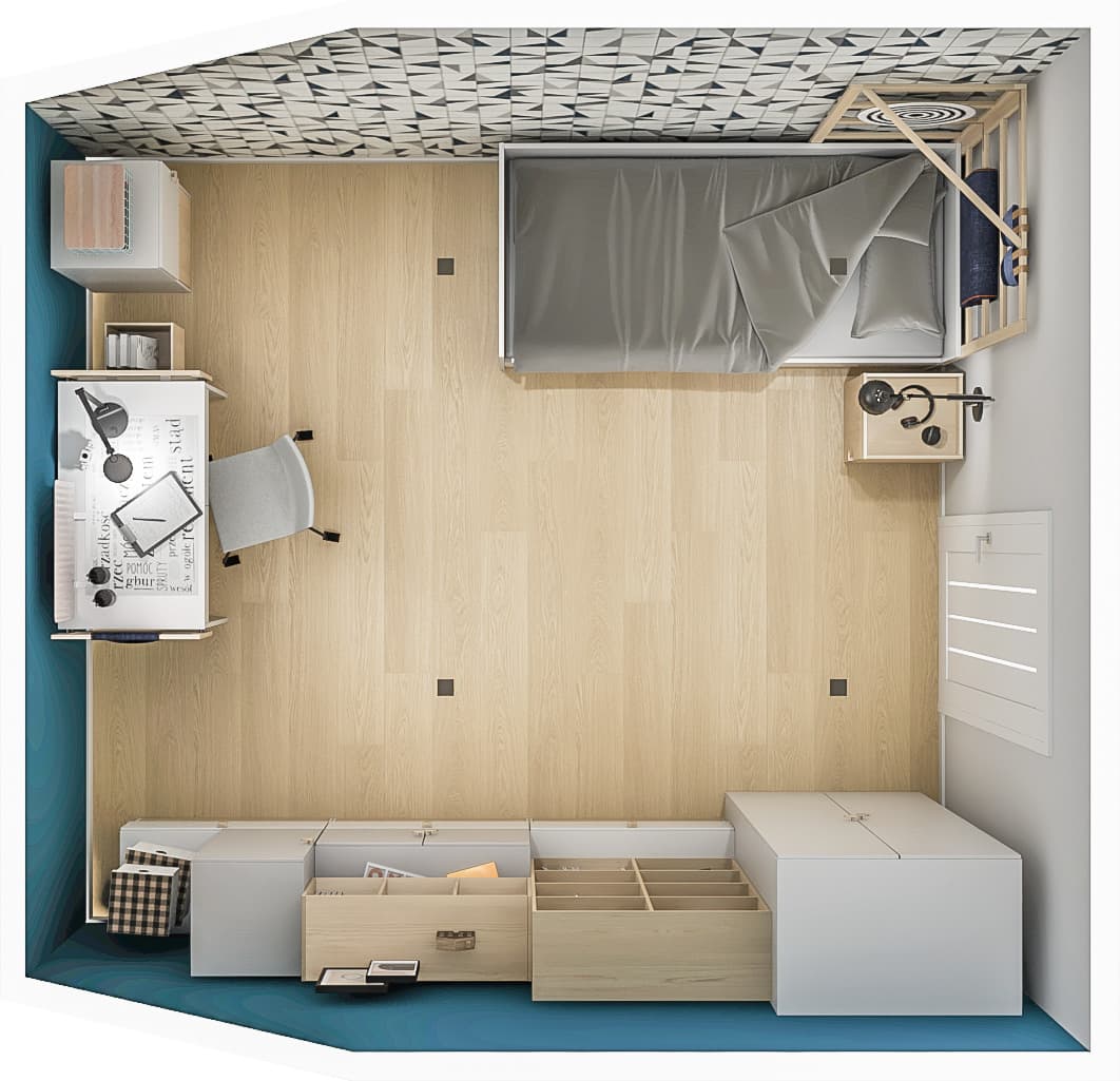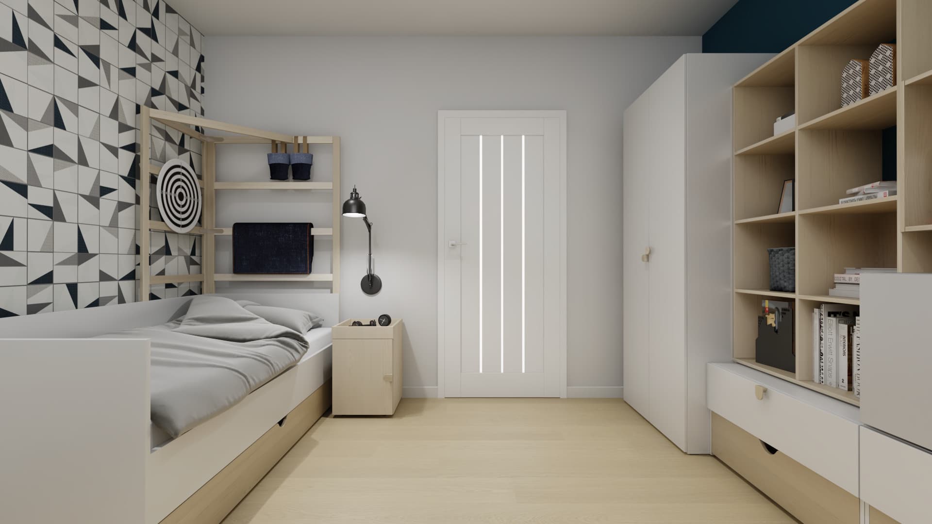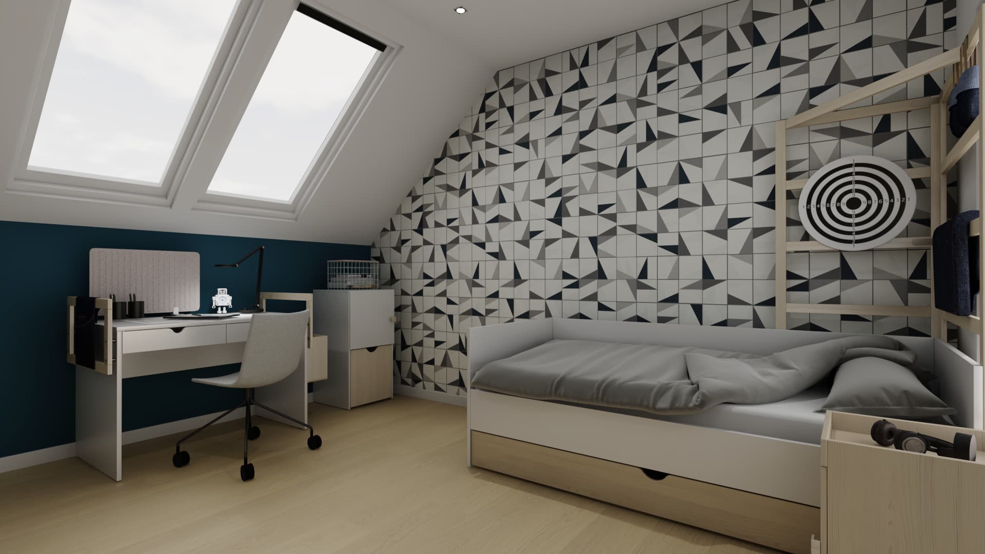 The modern interior for a teenager is functional and timeless. Wall panels with an origami motif in shades of grey and black give it character. The monochromatic colour scheme is broken by dark blue walls with capacious bookcases and a wardrobe in the background. Thanks to ingenious ladders at the desk and bed, small items can be conveniently stored.