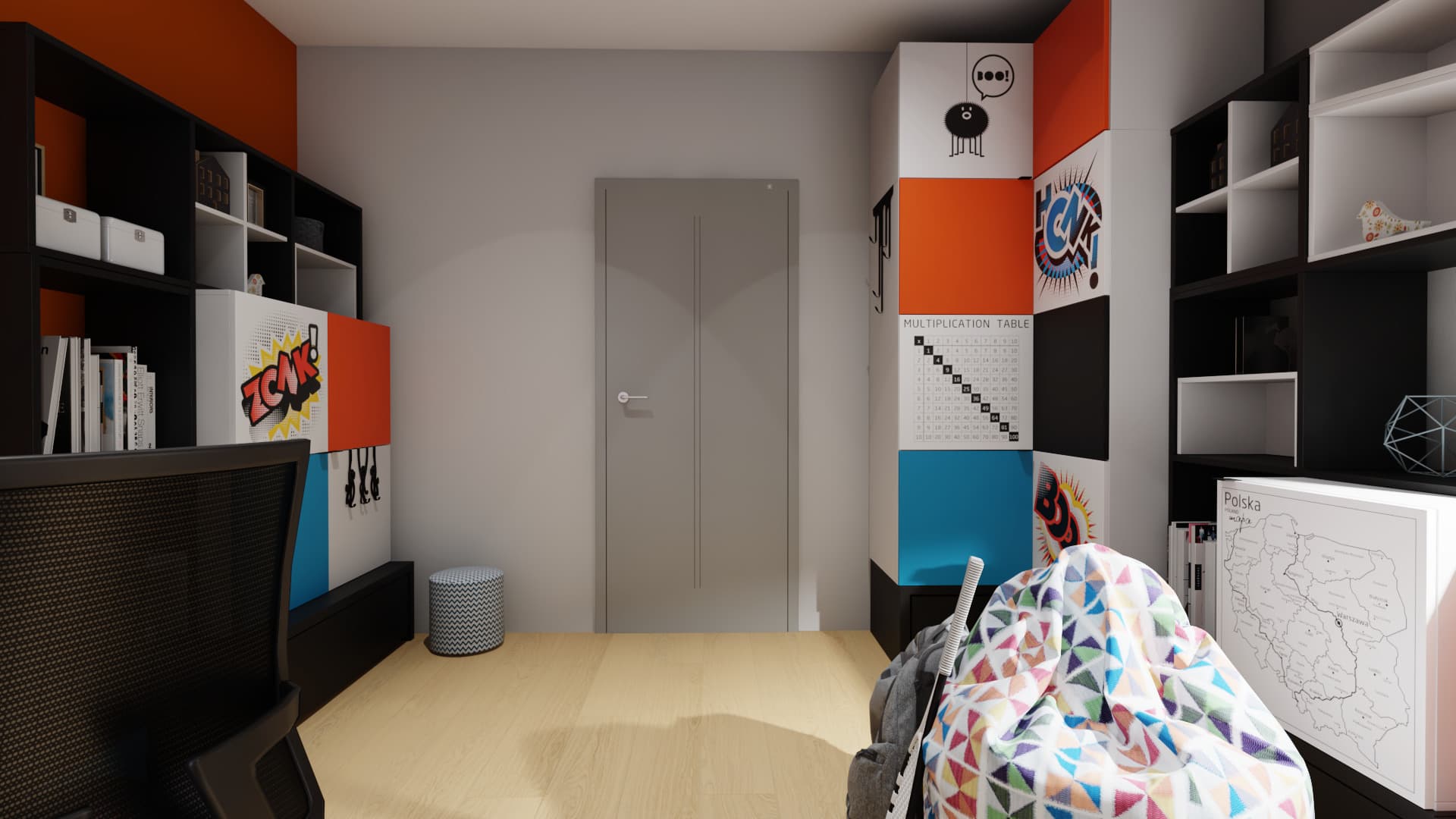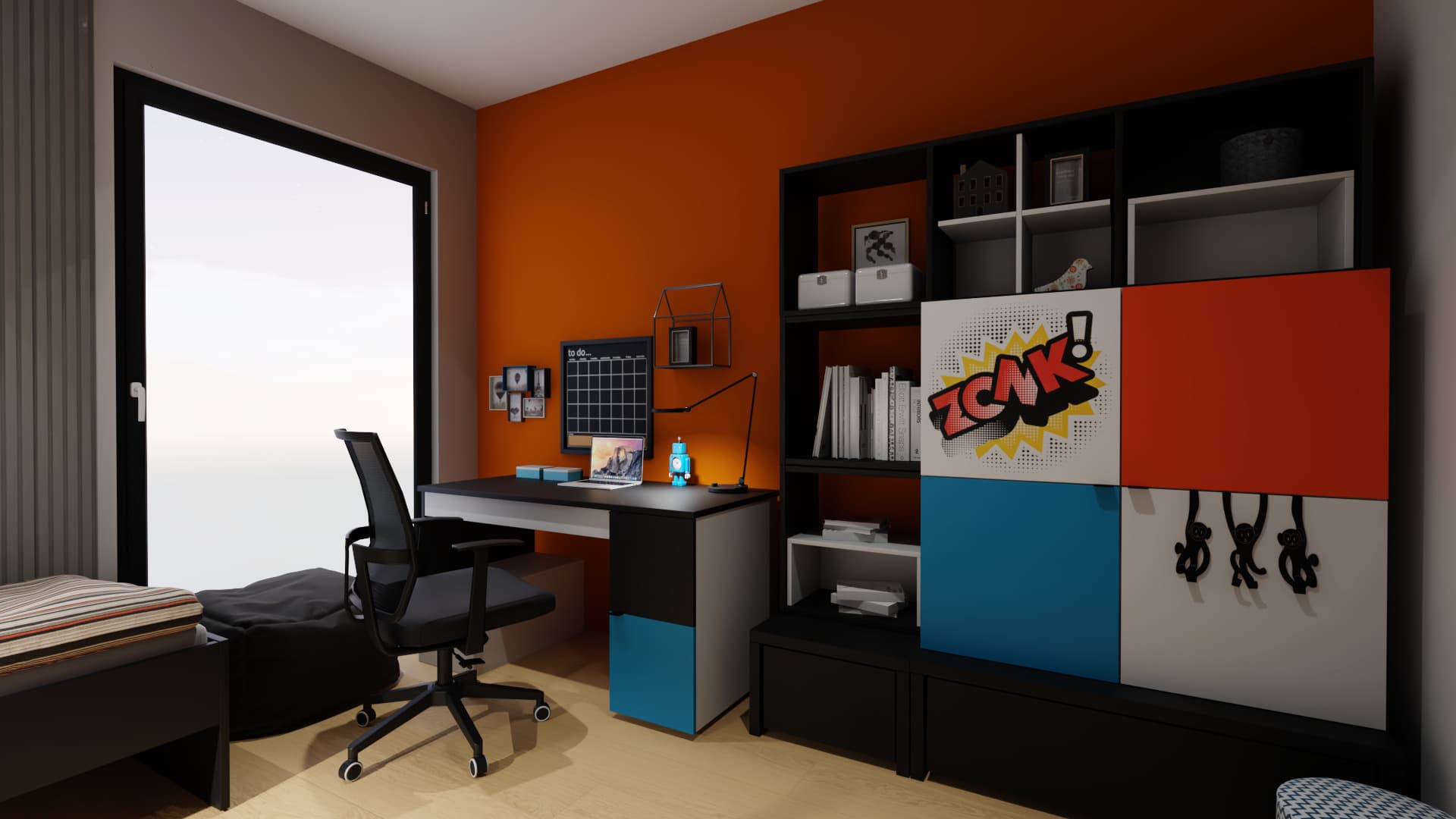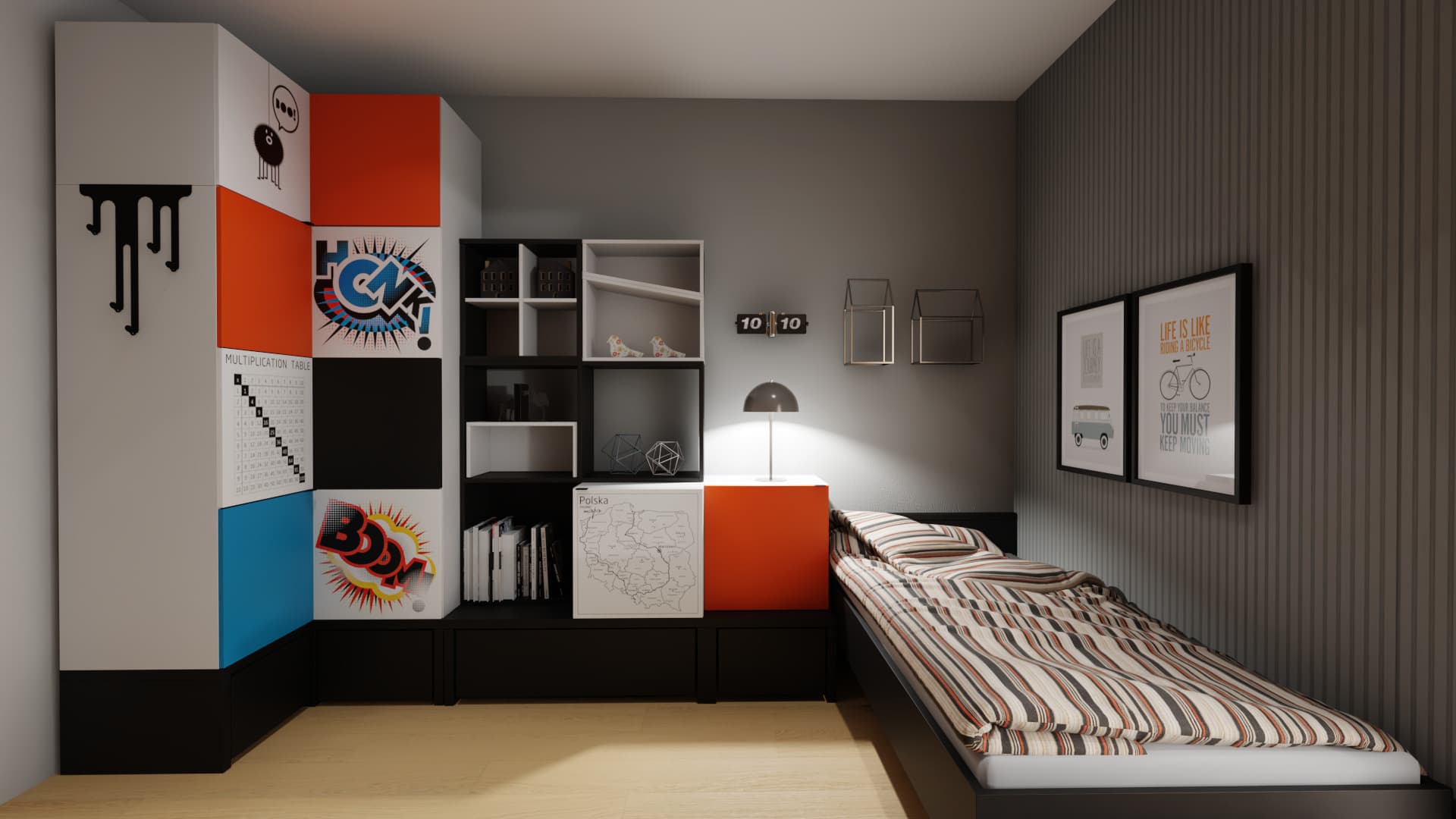 This youthful room is full of vibrant colours that stimulate action. A desk and a functional bookcase with interesting fronts stand against an orange wall. A sleeping area with a bed and a structured decoration of grey piping brings tranquillity. Self-cleaning is facilitated by a modular corner wardrobe.