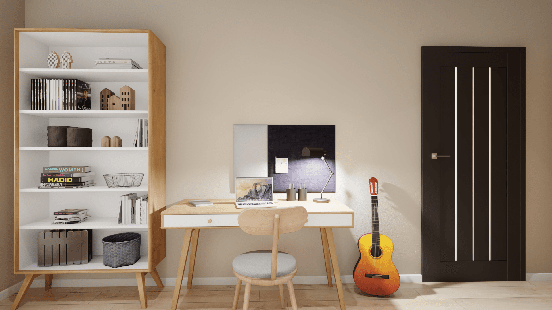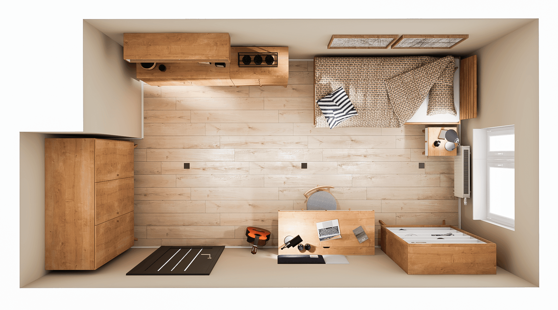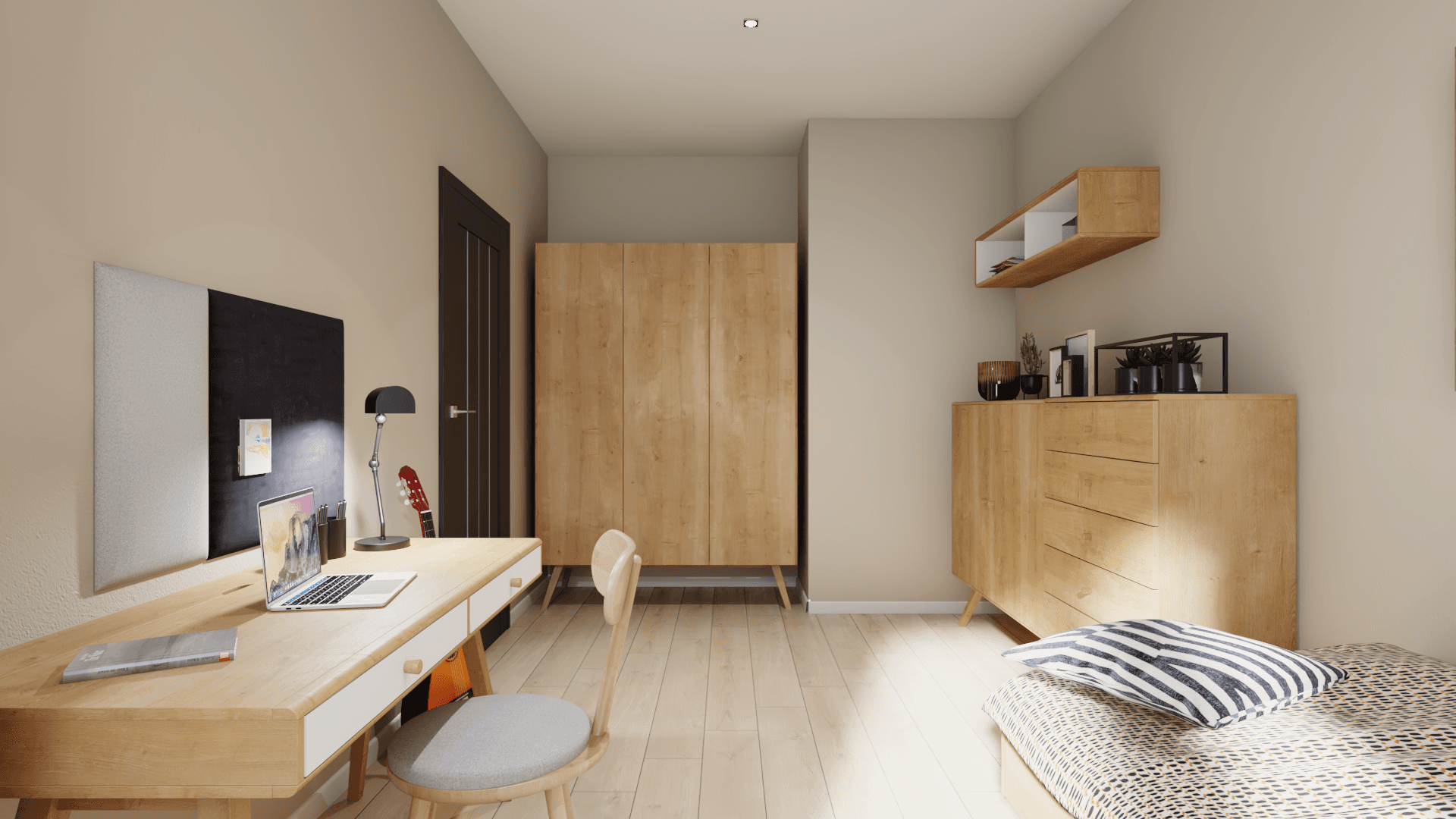 The nature-inspired student room exudes tranquillity and is conducive to studying. A cosy atmosphere is created by visually light furniture with soothing wood grain. A bed with an openwork headboard provides a comfortable rest. Clothes and personal belongings are easily organised in the spacious wardrobe and chest of drawers, while the practical desk creates a comfortable study area.