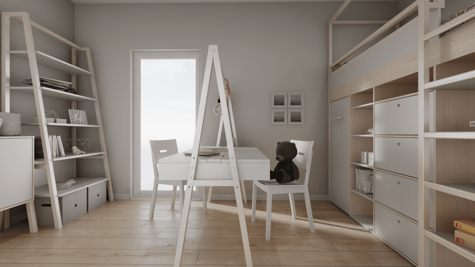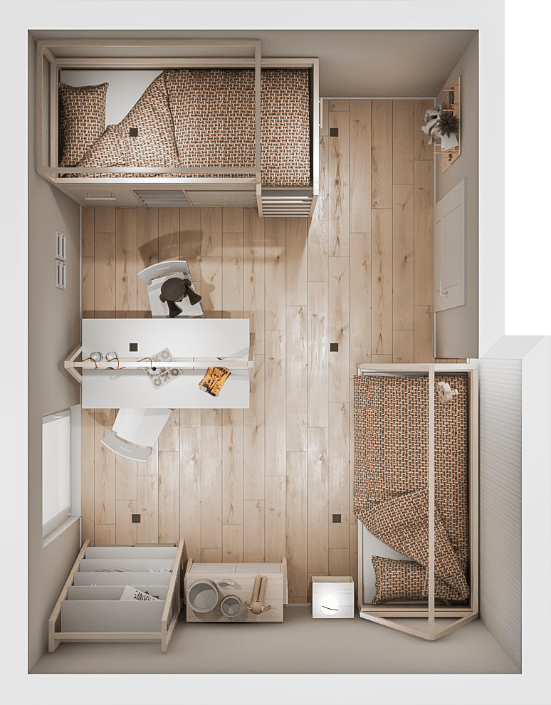The cosy room for two princesses conceals many ingenious solutions. The beds catch the eye - bunk beds with an integrated wardrobe and a charming tipi, which can be transformed into a real palace. A double-sided desk with a rail allows creative ideas to be realised, while a visually light bookcase allows treasures to be displayed. Plenty of storage space to keep things tidy.