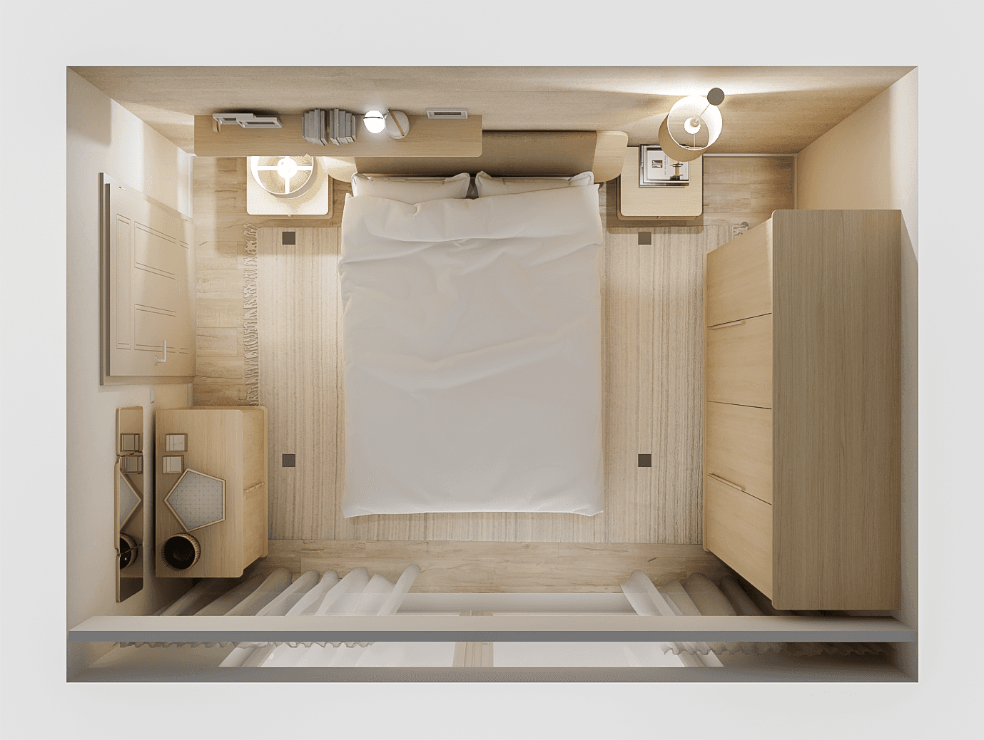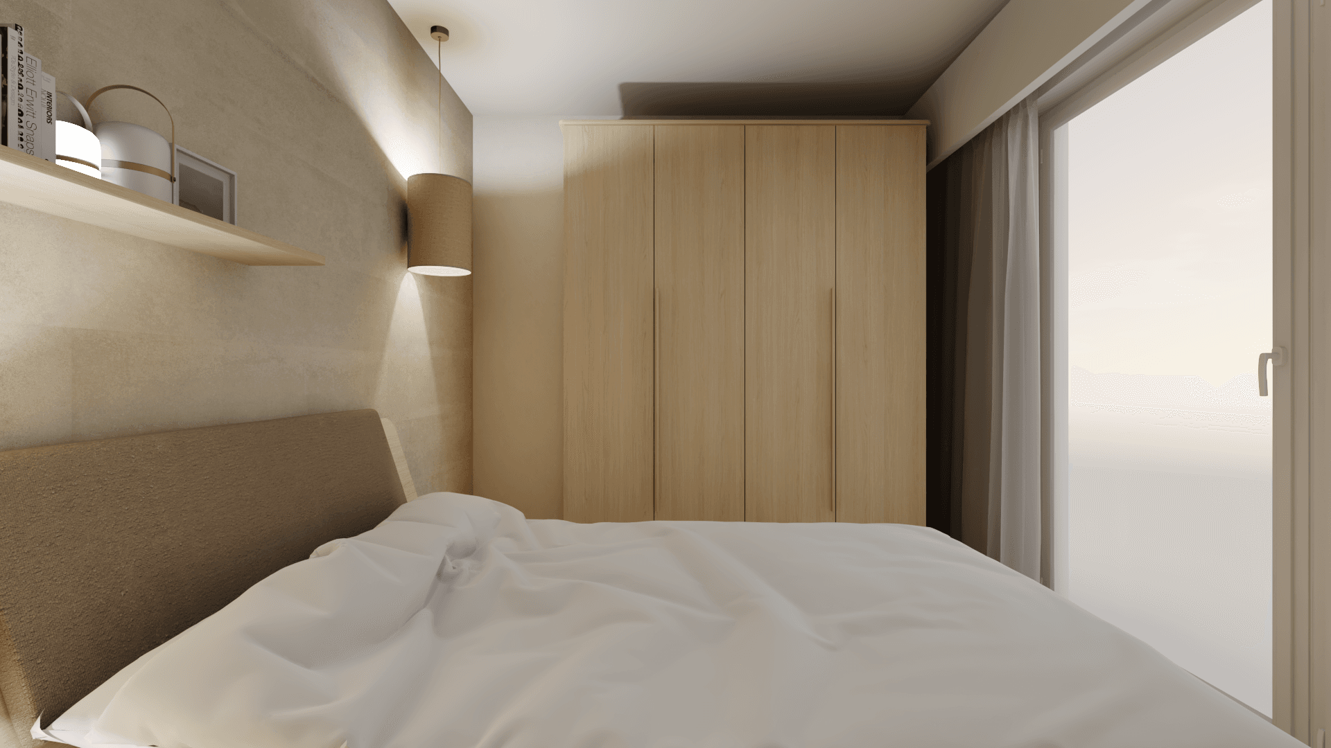 The small bedroom in light shades exudes tranquillity and is conducive to moments of relaxation. Wood and beige colours make the space feel cosy and warm. The bed, placed in the centre, allows you to sleep comfortably and the soft headrest is useful for reading. Morning preparations are facilitated by a large wardrobe and a chest of drawers with a mirror, which also serves as a dressing table.