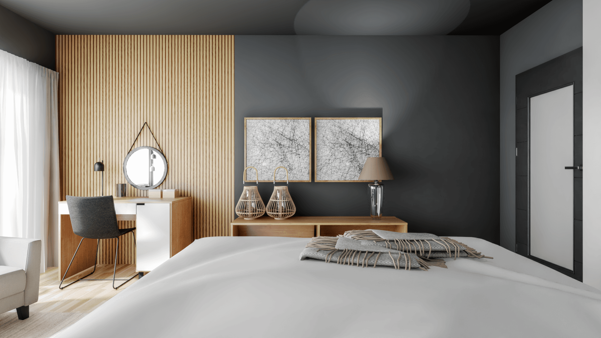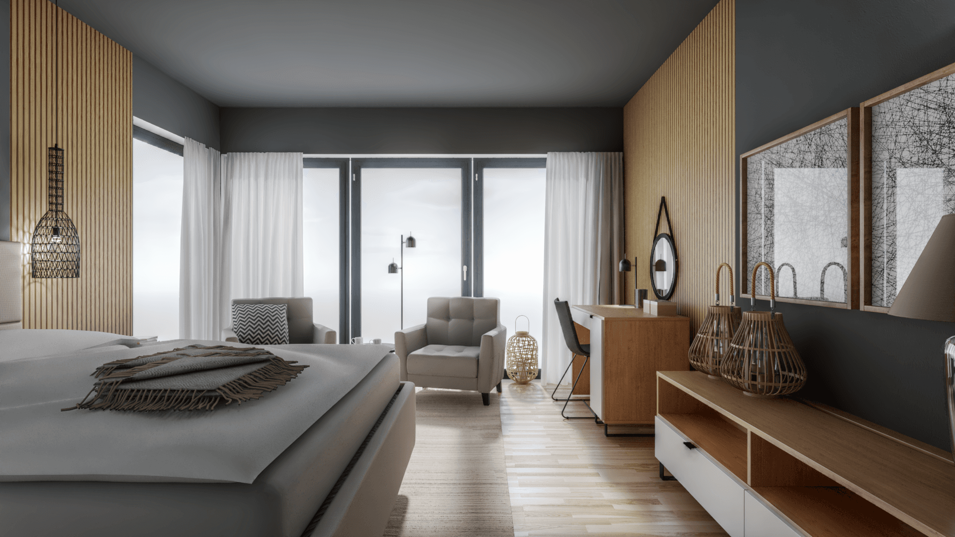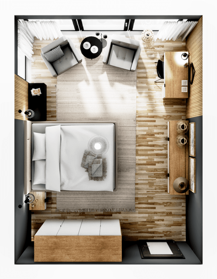 The elegantly arranged bedroom is wrapped in light, warm tones. Its focal point is a wide bed with a headboard, accompanied by cabinets with bedside lamps. A large corner window serves as a bracket for a comfortable area to relax with a book. A muted colour palette, soft textiles and pouffes add to the spacious interior.