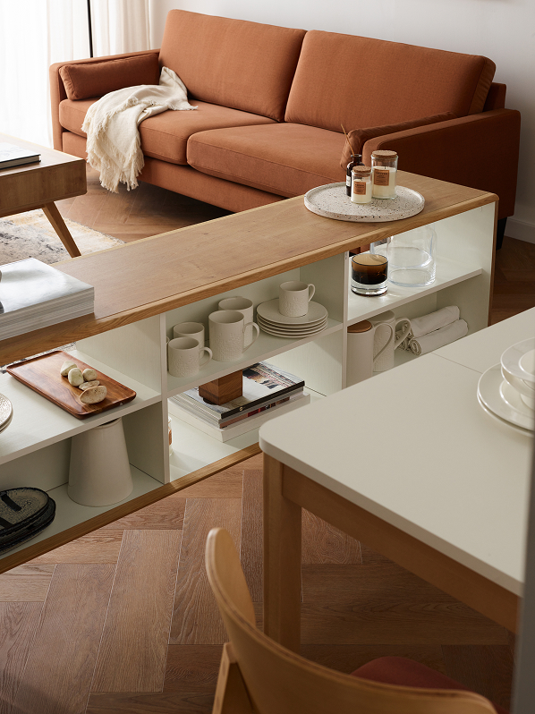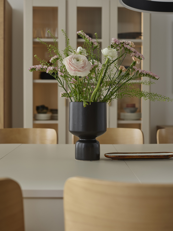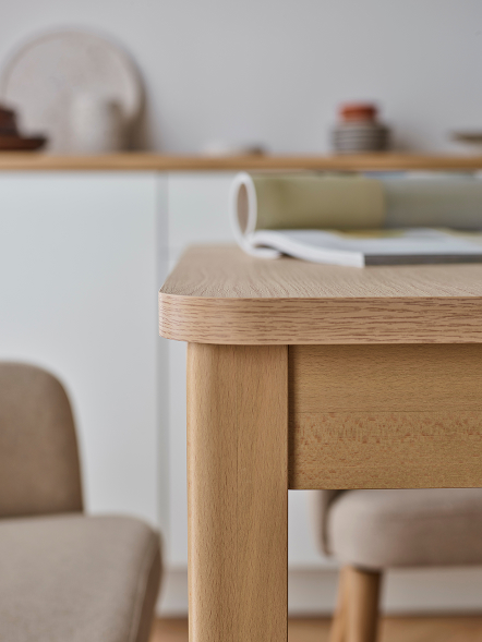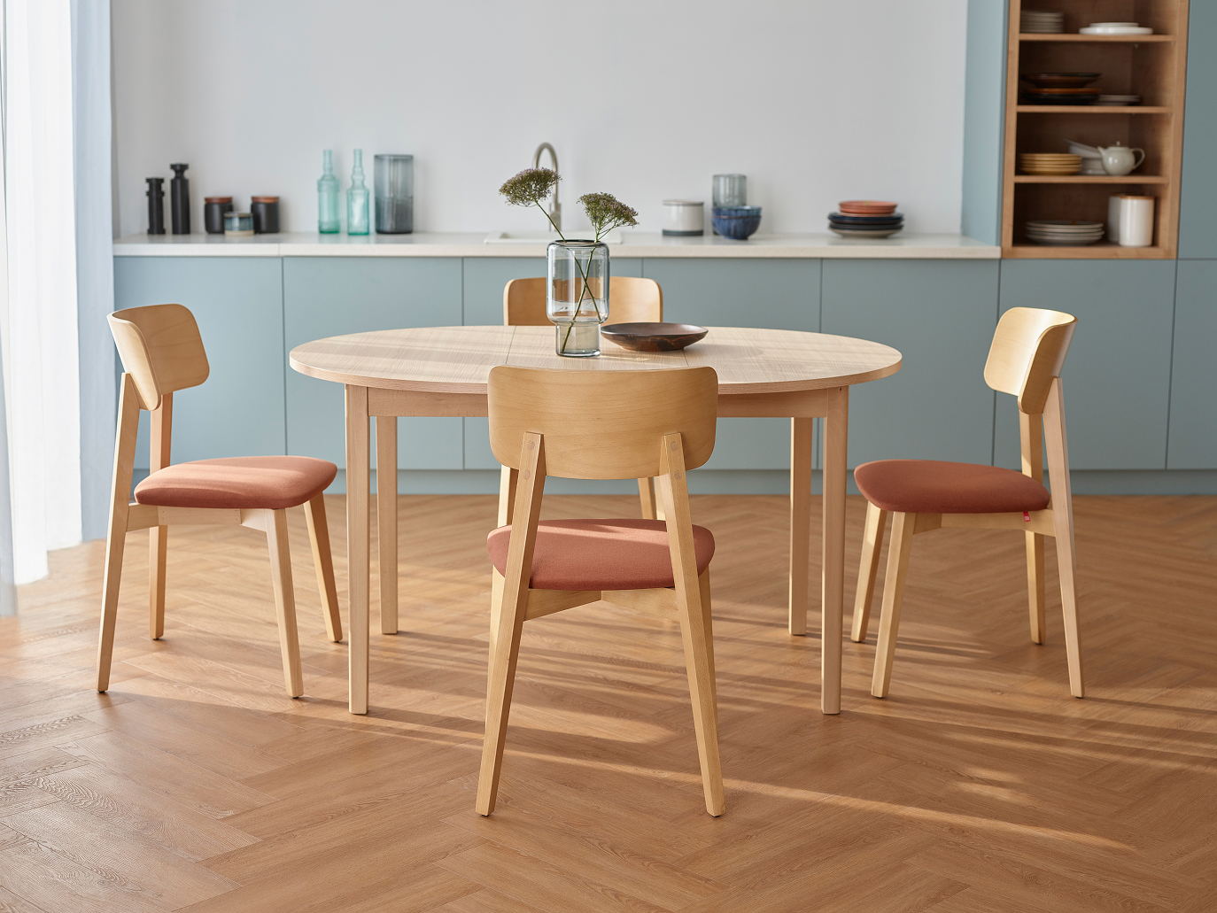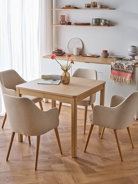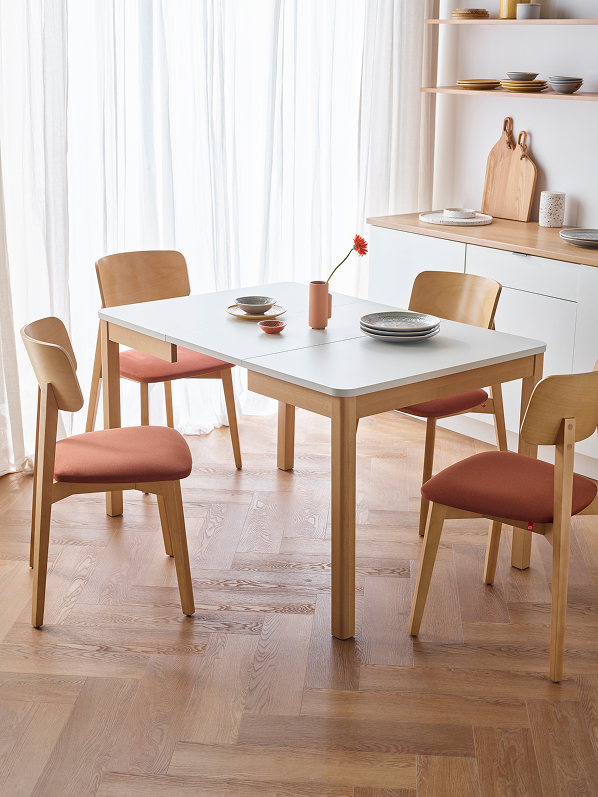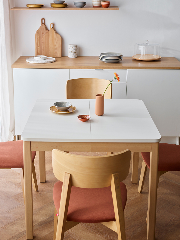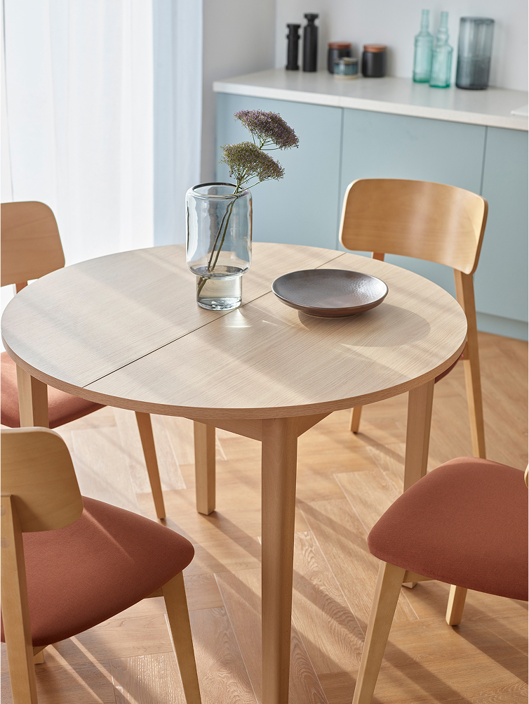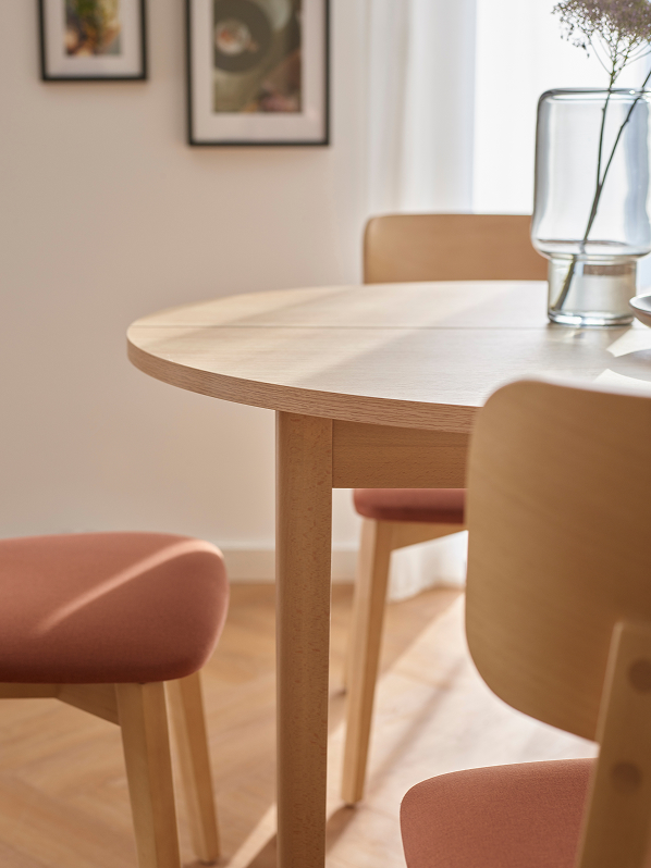 Zgrabny stół Konso zajmuje mało miejsca, będzie więc idealnym wyborem do mniejszych wnętrz. Okrągły lub kwadratowy blat można w kilka chwil rozłożyć.