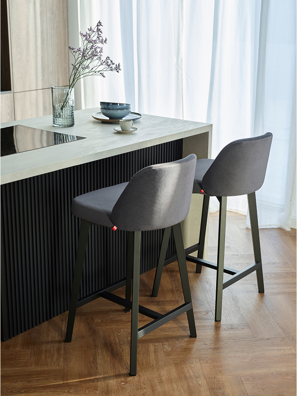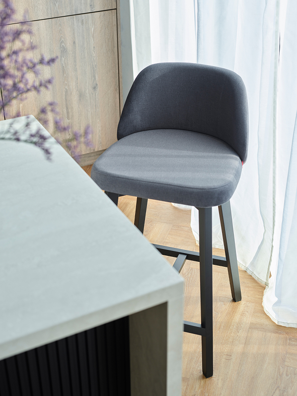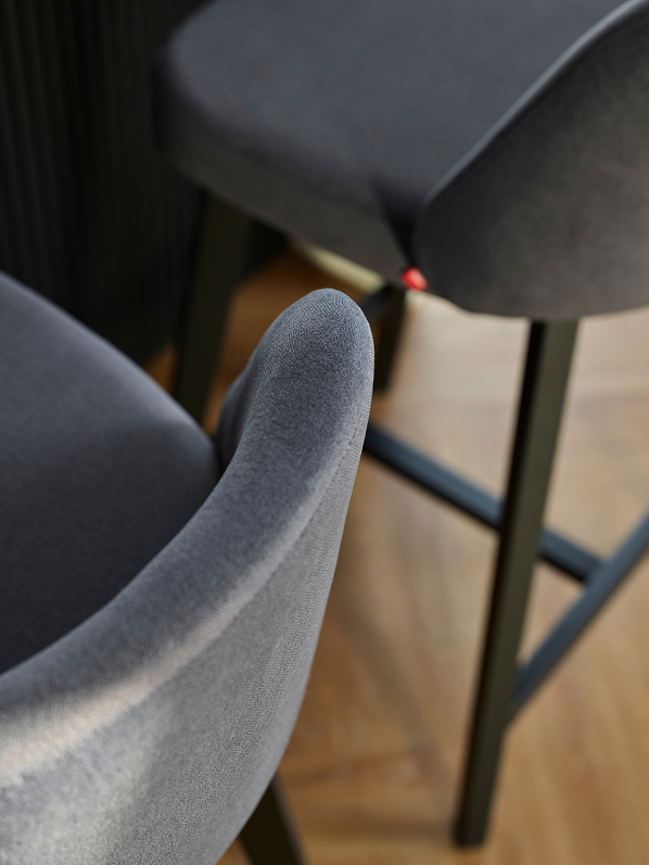Tapicerowany hoker Komm o wysokości siedziska 70 cm to doskonały wybór do wysokich stołów i wysp kuchennych, zapewniający komfort siedzenia i podparcie nóg.