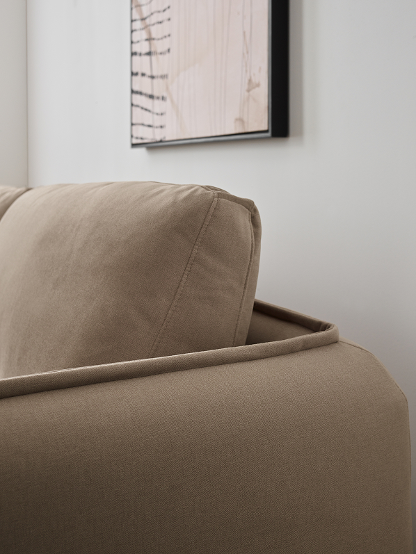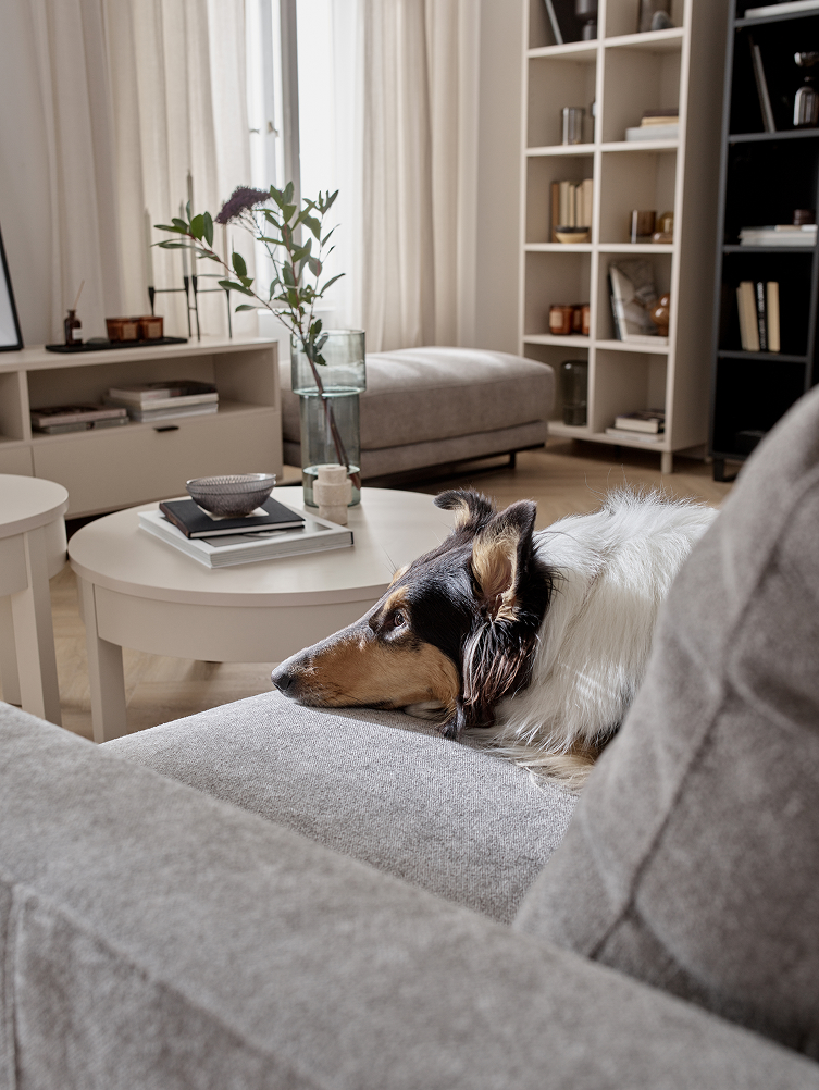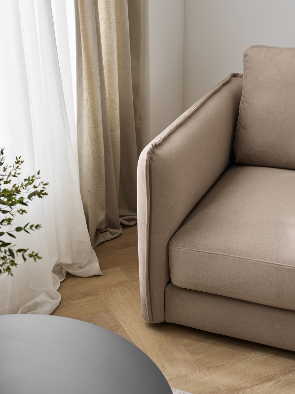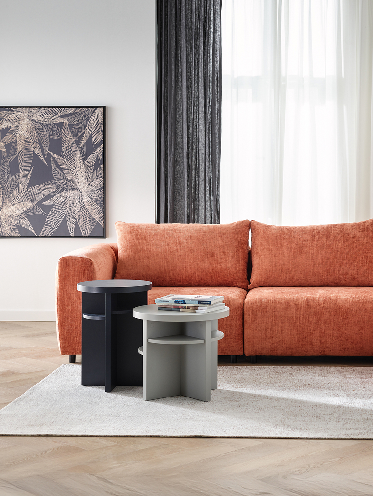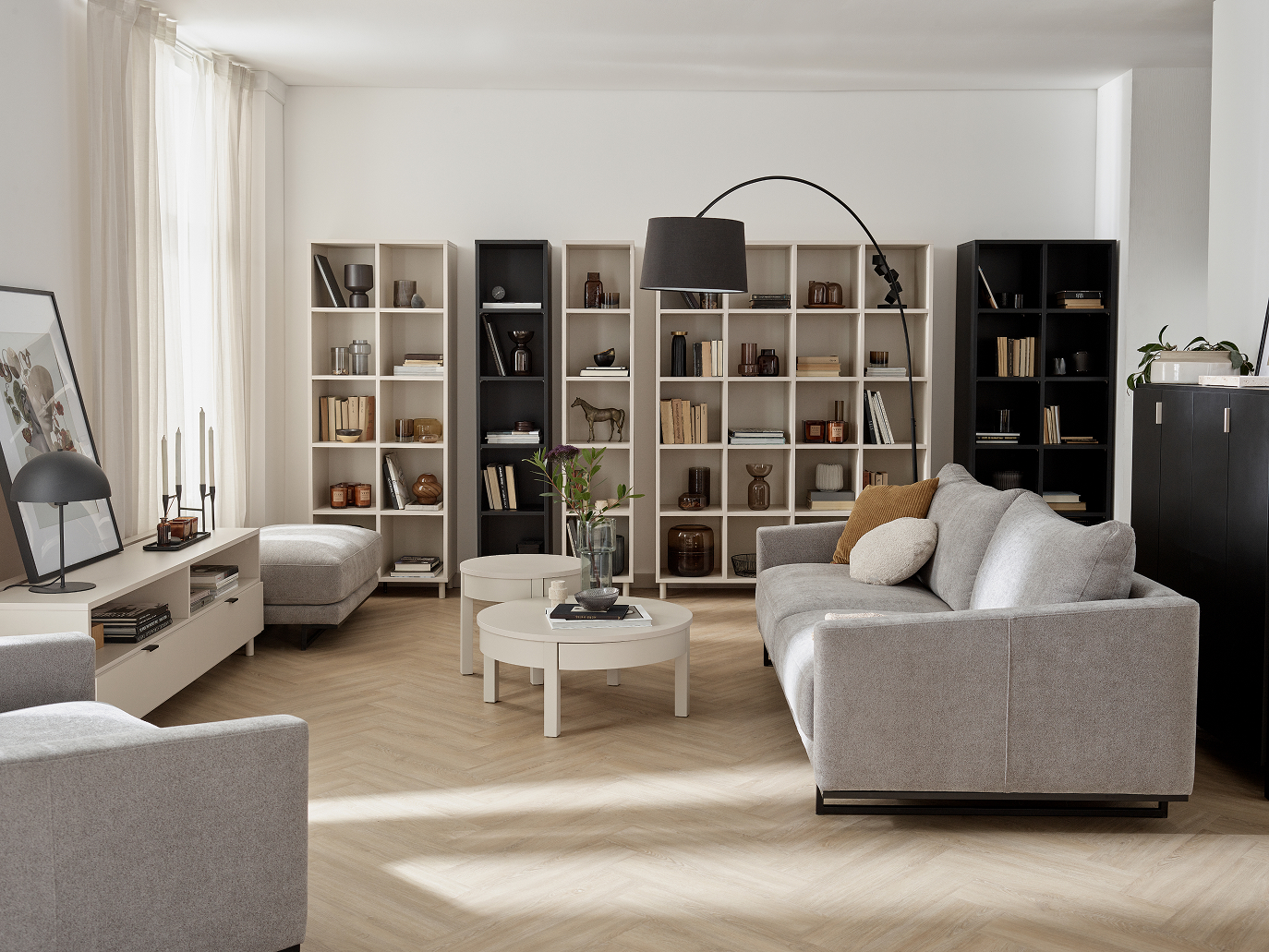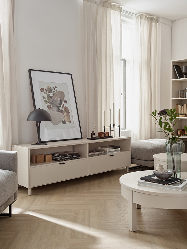 Beżowe meble Simple można zestawić z bryłami w czarnym kolorze. Uzyskamy w ten sposób mocniejszą, wyrafinowaną aranżację, idealną do salonu.