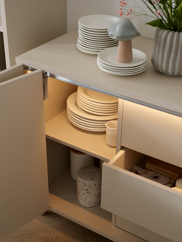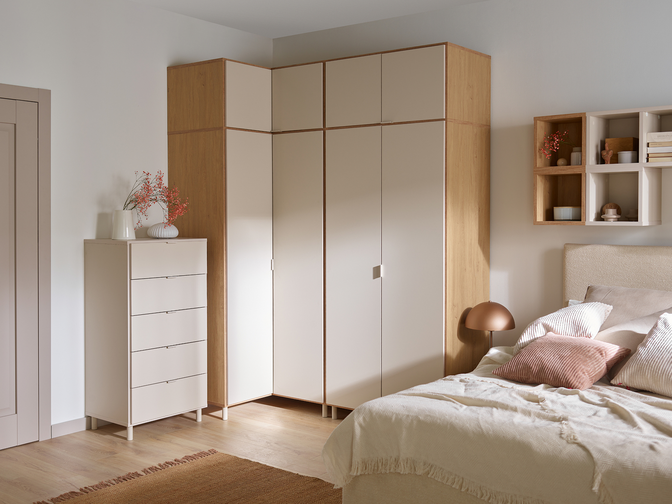 Beż to kolor harmonii, spokoju i ponadczasowej elegancji. W nowoczesnych aranżacjach pełni rolę subtelnego tła, które podkreśla formę mebli, a jednocześnie ociepla przestrzeń i wprowadza do niej przytulność. Szafy i komody Simple będą się świetnie prezentowały zarówno w monochromatycznej kompozycji, jak i w połączeniach beżowych frontów z dębowymi korpusami.
