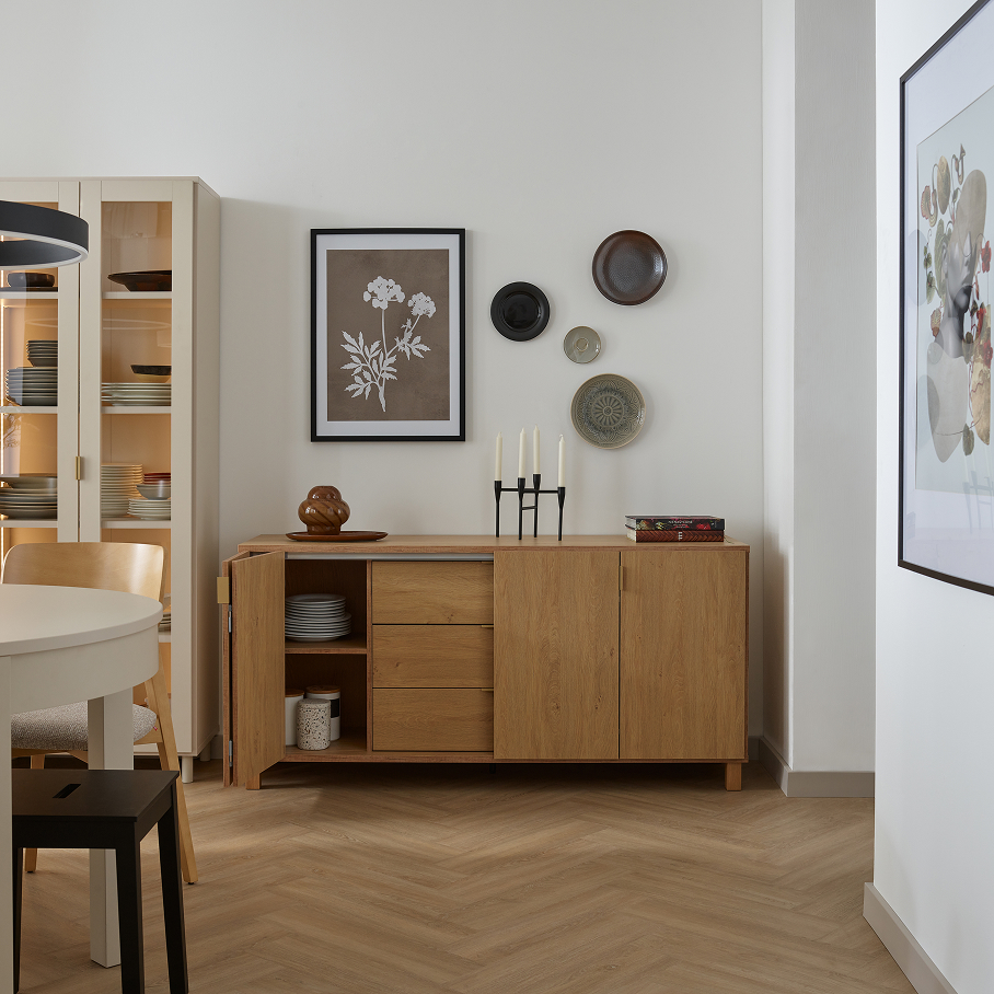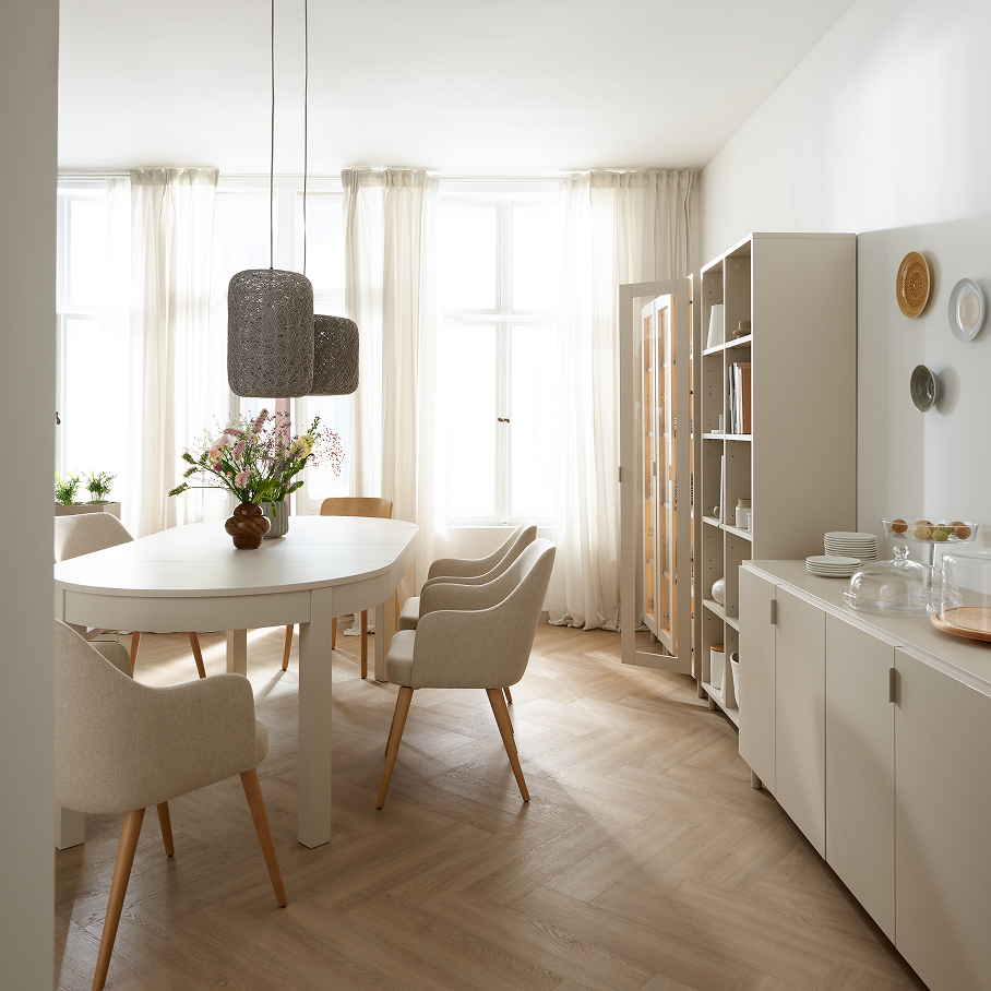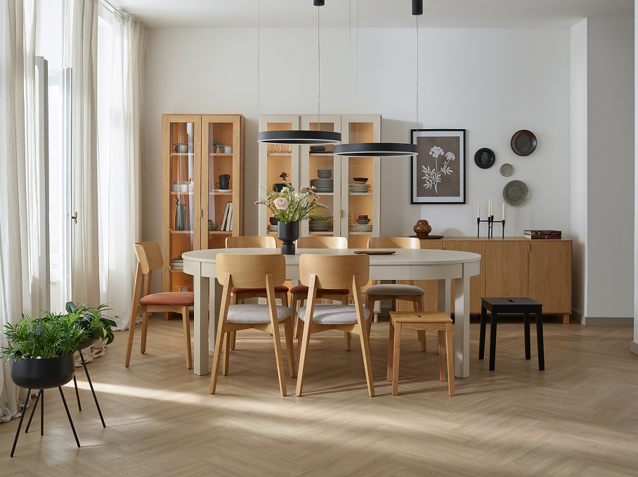 Kolekcja Simple to opowieść o ponadczasowej funkcjonalności. Rozkładany okrągły stół zachwyci Cię swoją praktycznością, a barek i liczne modele komód zadowolą nawet najbardziej wymagających. Przeszklone witryny pomogą wyeksponować ulubione przedmioty i wprowadzą do jadalni dużo lekkości.
