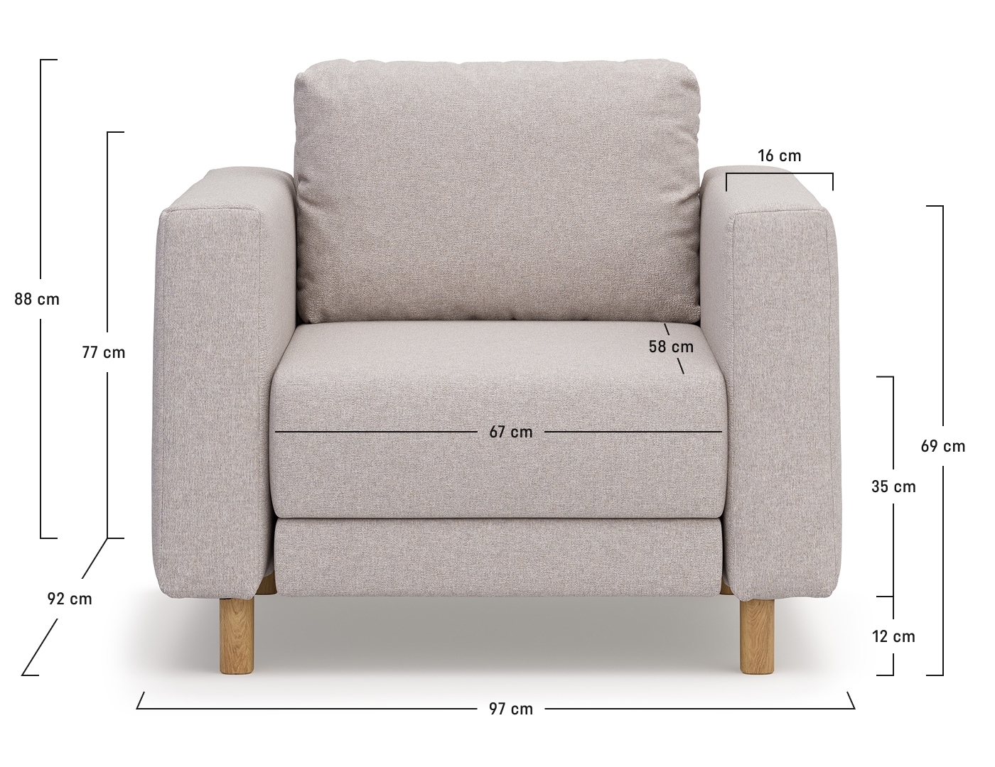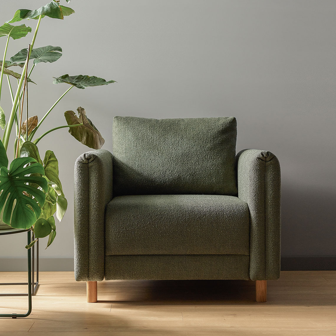 - Thanks to the high legs, the armchair is optically light. There is a choice of slightly higher, slanted legs in the color of natural oak and straight black legs, lower and slimmer. As a result, the armchair can have different heights, which will translate into its functionality.