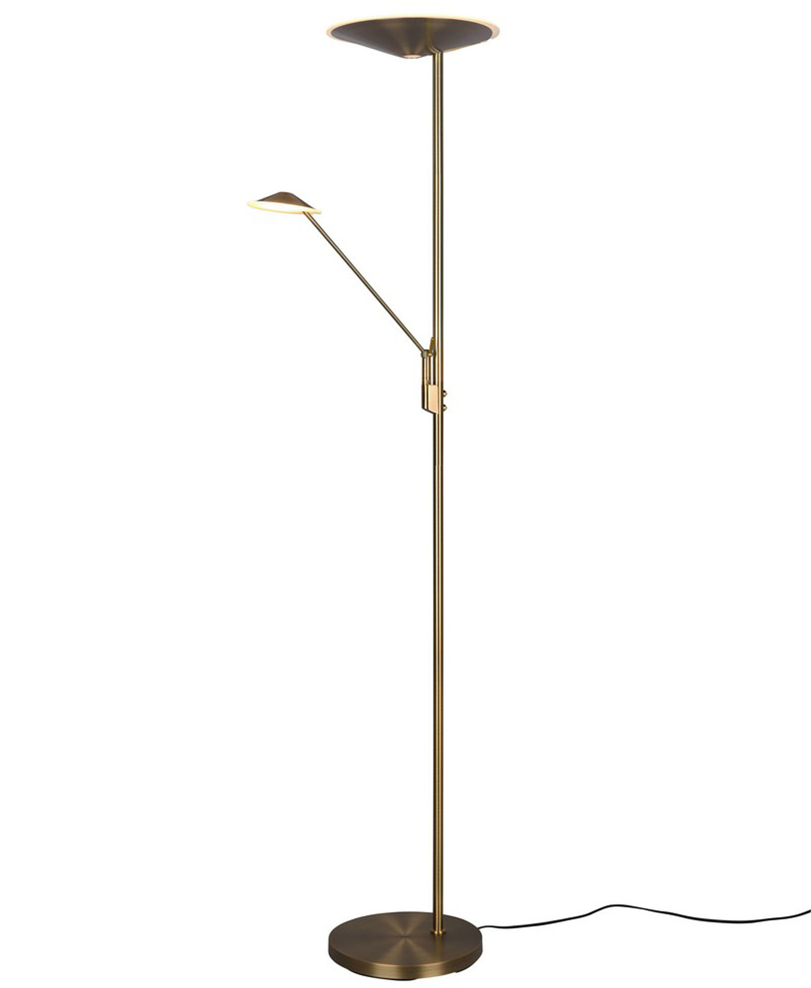 The Brantford lamp is a smart uplighter solution that combines the classic aesthetics of antique brass with modern LED technology. The fixture offers two independent light sources: a top plate, which fills the room with radiance reflected from the ceiling, and an adjustable side arm, ideal as a precise reading light. The sophisticated old gold color makes the lamp perfect for both modern apartments and more classic, warm interiors.