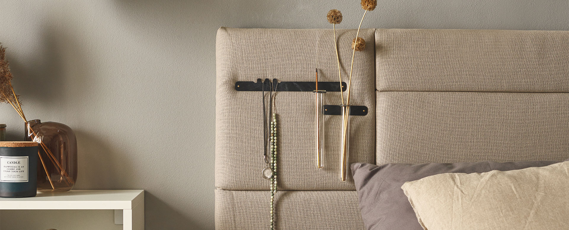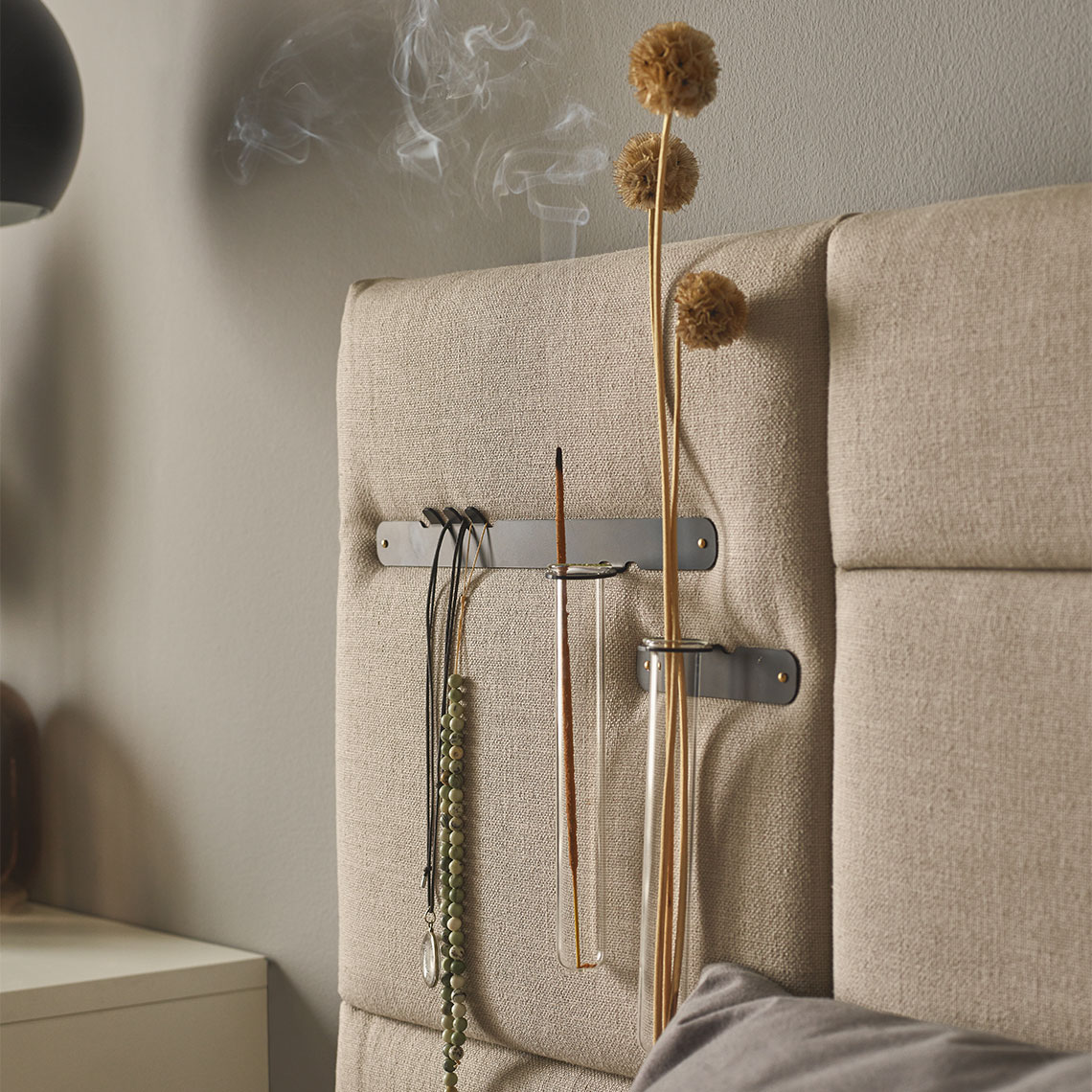 The composition of black slats with glass vials will be an interesting complement to the interior design. You can mount them on furniture, Soform panels or a wall and expose with their help trinkets that will take care of the mood. Favorite jewelry, dried lavender, constantly losing headphones - the set designed by Dorota Balewicz will provide you with everyday convenience and true freedom of arrangement.