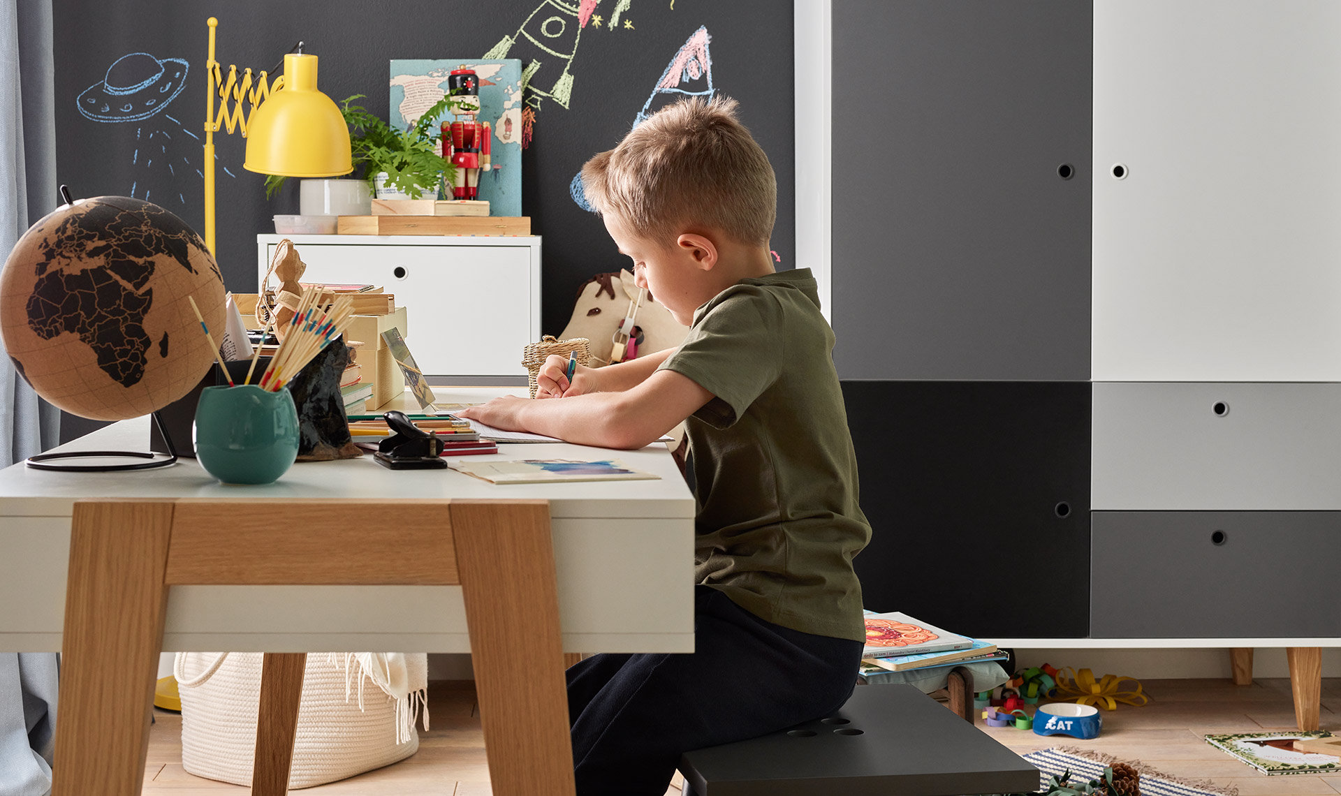 - Thanks to its neutral colors and large working area, the desk is perfect for both children's and teenagers' rooms, as well as a home office or study. Wanting to match the furniture to a specific interior, it is worth using the intuitive VOXBOX application.