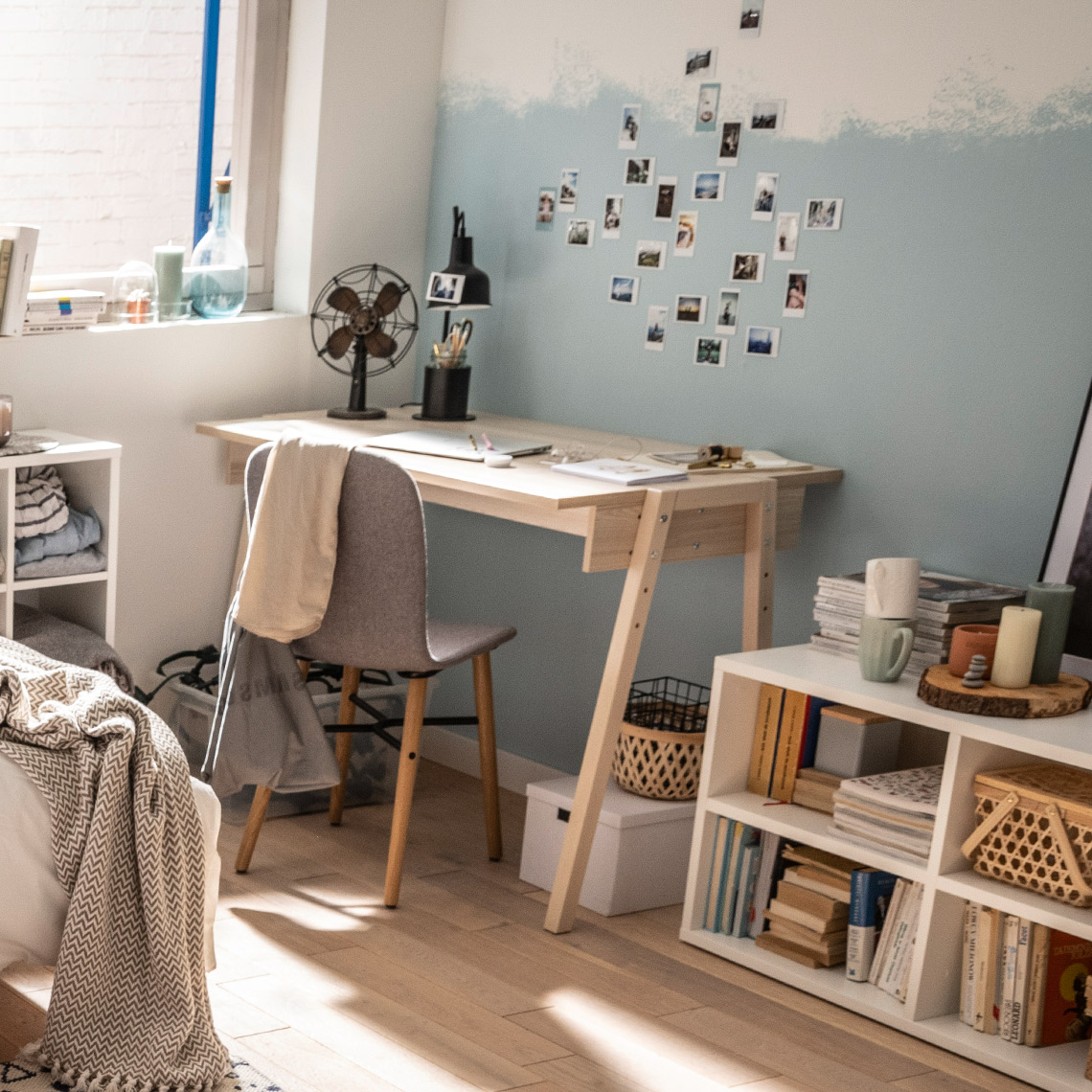 Desk from the Pl Young collection with a height-adjustable top and solid wood legs. Thanks to its universal color scheme, it will work well in both a child's and a teenager's room.