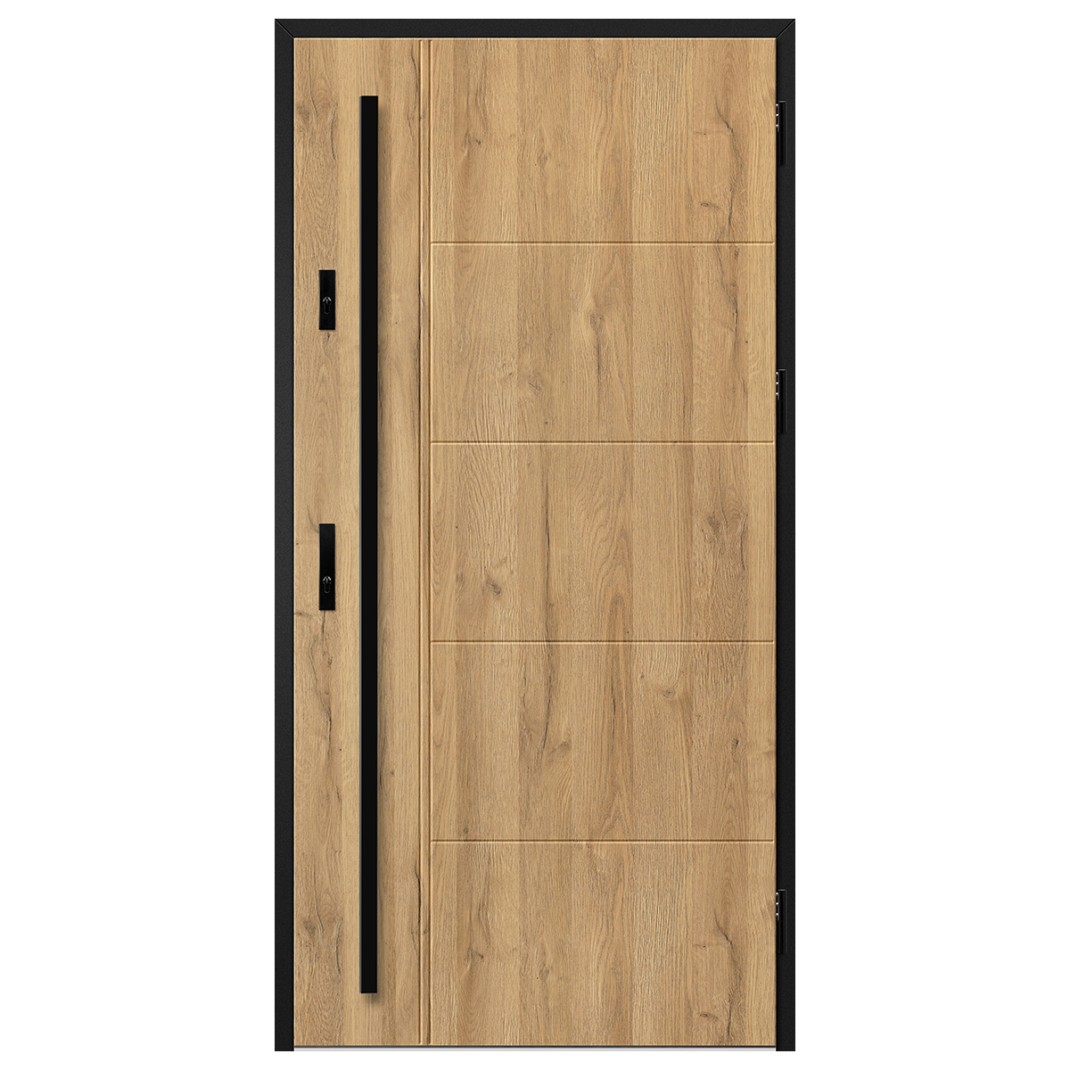 Ościeżnica stalowa, ocynkowana i oklejona w kolorze skrzydła drzwiowego, wyposażona w ciepły próg aluminiowy.