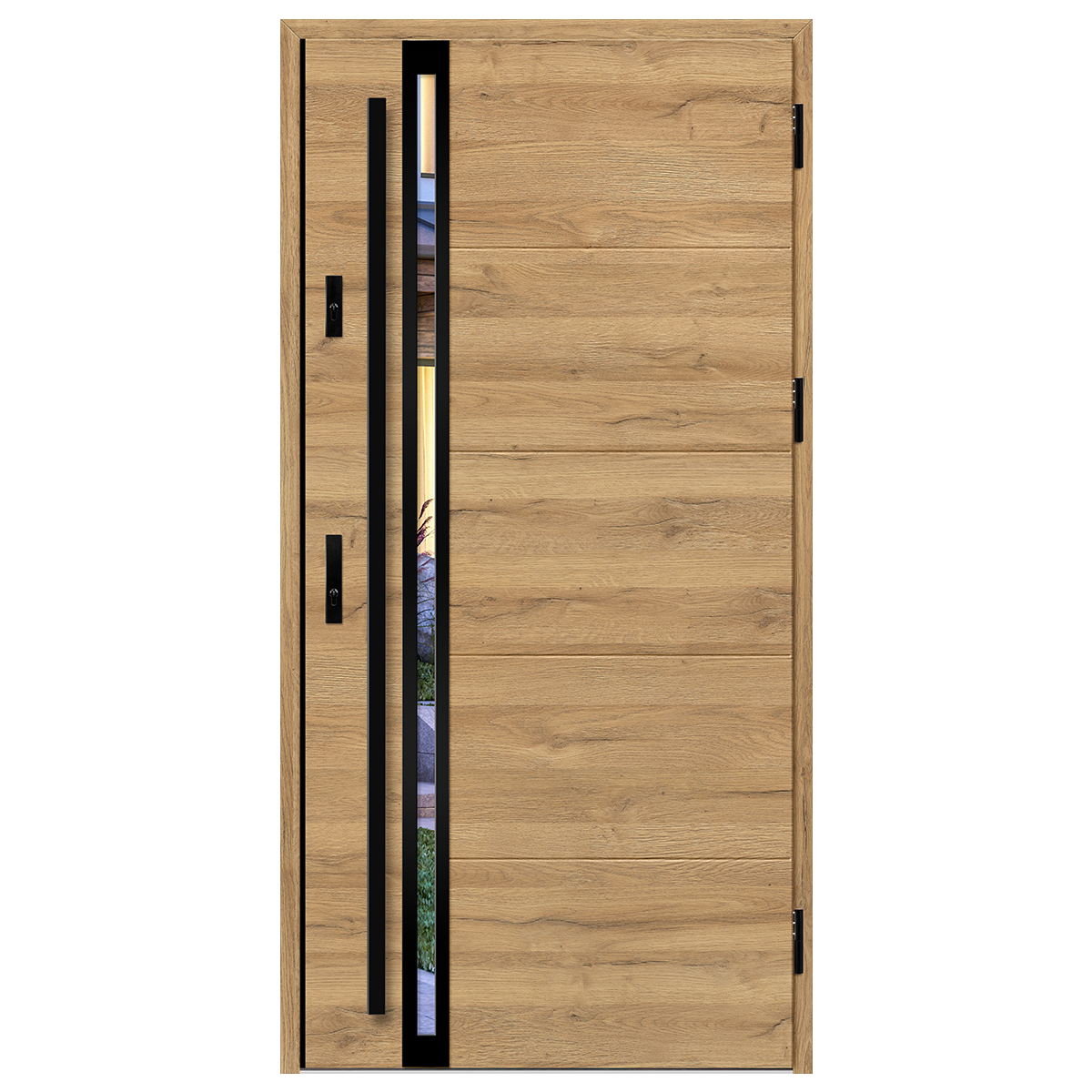 Ościeżnica stalowa, ocynkowana i oklejona w kolorze skrzydła drzwiowego, wyposażona w ciepły próg aluminiowy.