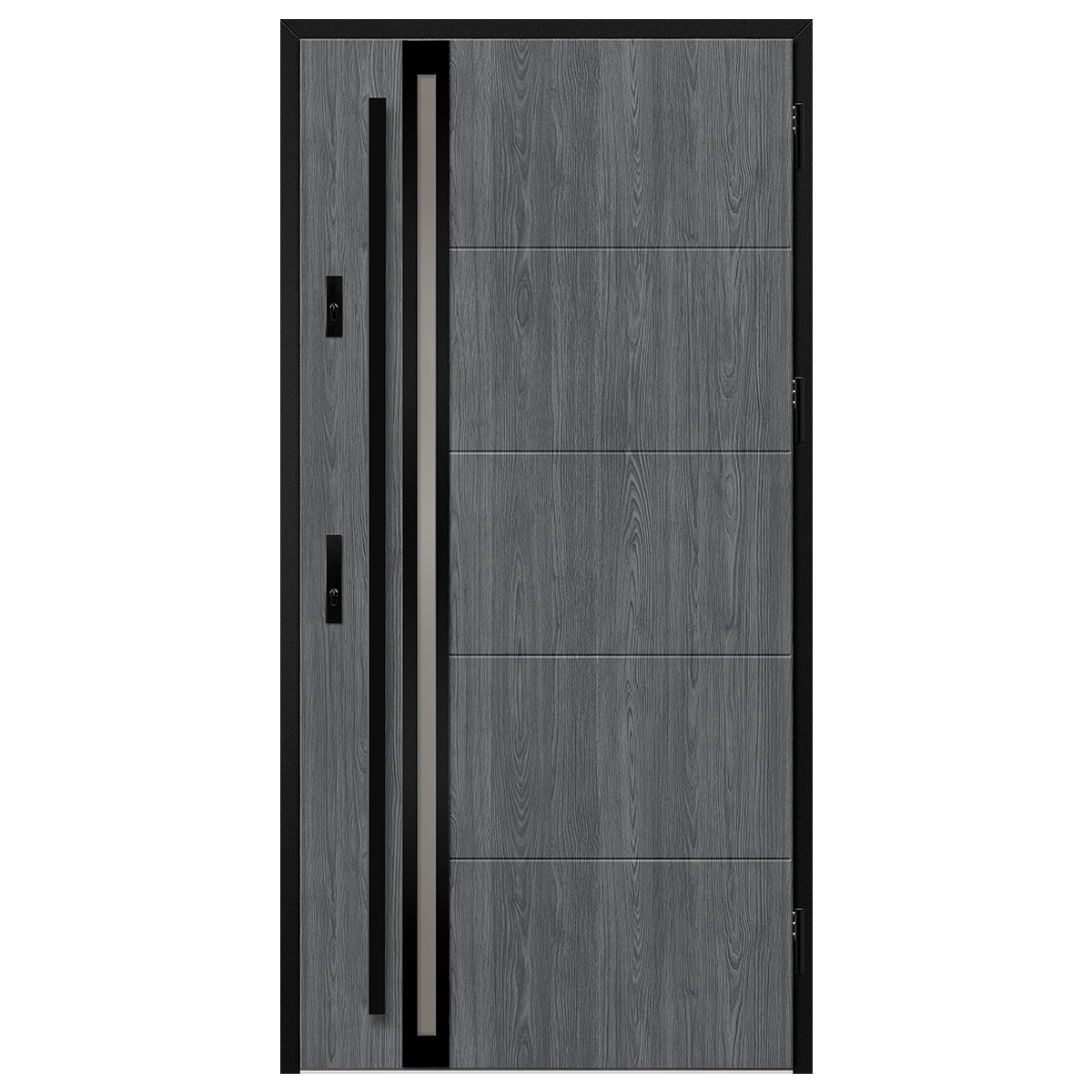 Ościeżnica stalowa, ocynkowana i oklejona w kolorze skrzydła drzwiowego, wyposażona w ciepły próg aluminiowy.