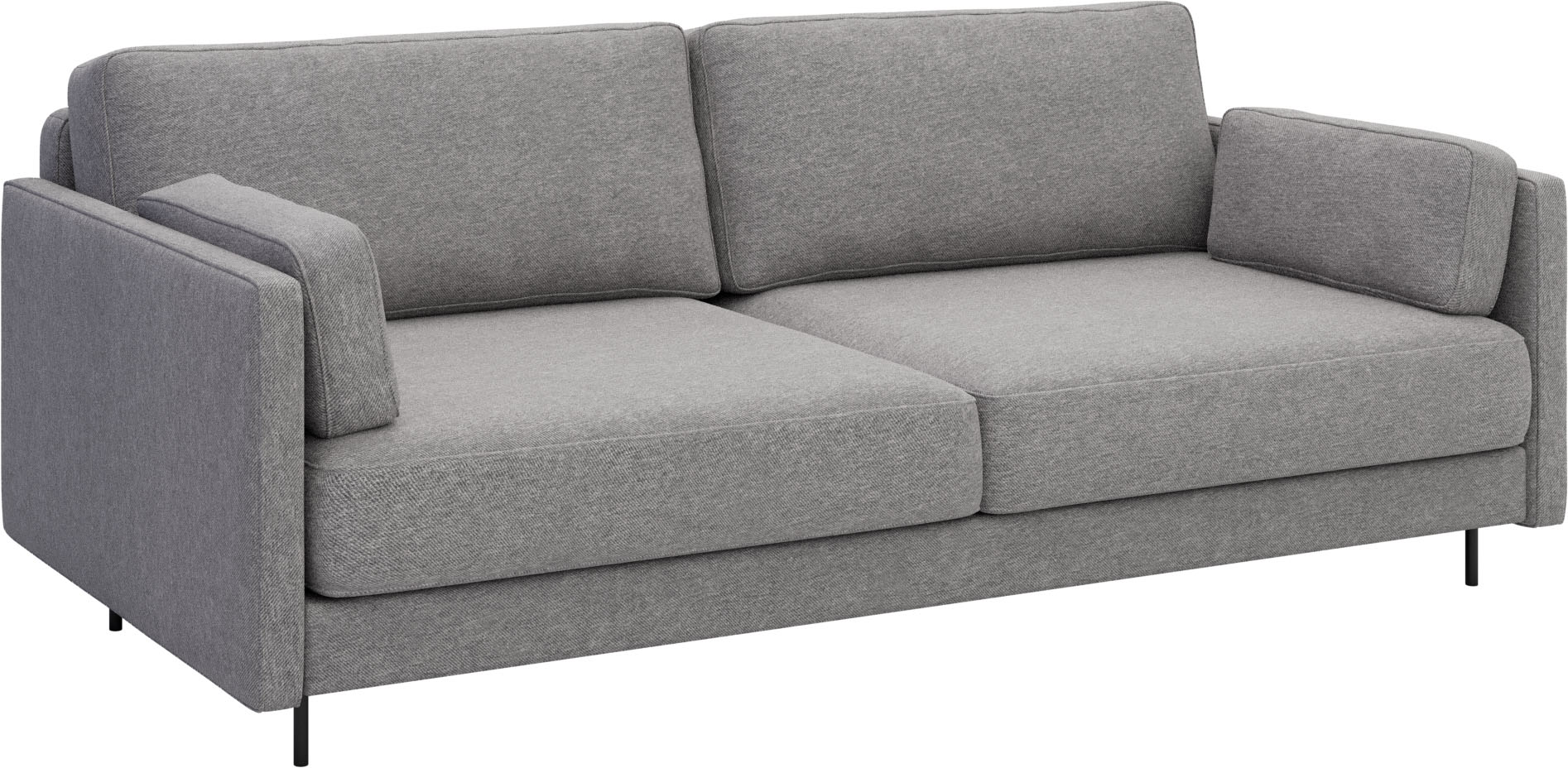 Visually light, wide sofa with elegant armrests has independent backrest cushions and 2 additional side cushions.