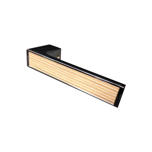 Klamka MEDA do drzwi wewnętrznych z kwadratowym szyldem i zaokrąglonymi narożnikami. Wypełnienie klamki to okleina przypominająca sklejkę co daje większy efekt naturalności tego produktu.