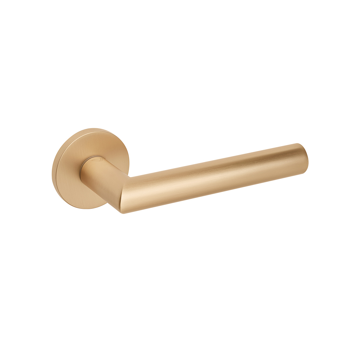Satynowa powłoka w odcieniu złota zachwyca subtelnym, ciepłym blaskiem, a jednocześnie wyróżnia się wysoką odpornością na zarysowania i ślady palców, dzięki czemu klamka zachowuje swój estetyczny wygląd na dłużej. Smukła rozeta o grubości 6 mm zapewnia solidność i stabilność podczas użytkowania, co sprawia, że model ten sprawdzi się zarówno w drzwiach wewnętrznych, jak i zewnętrznych.