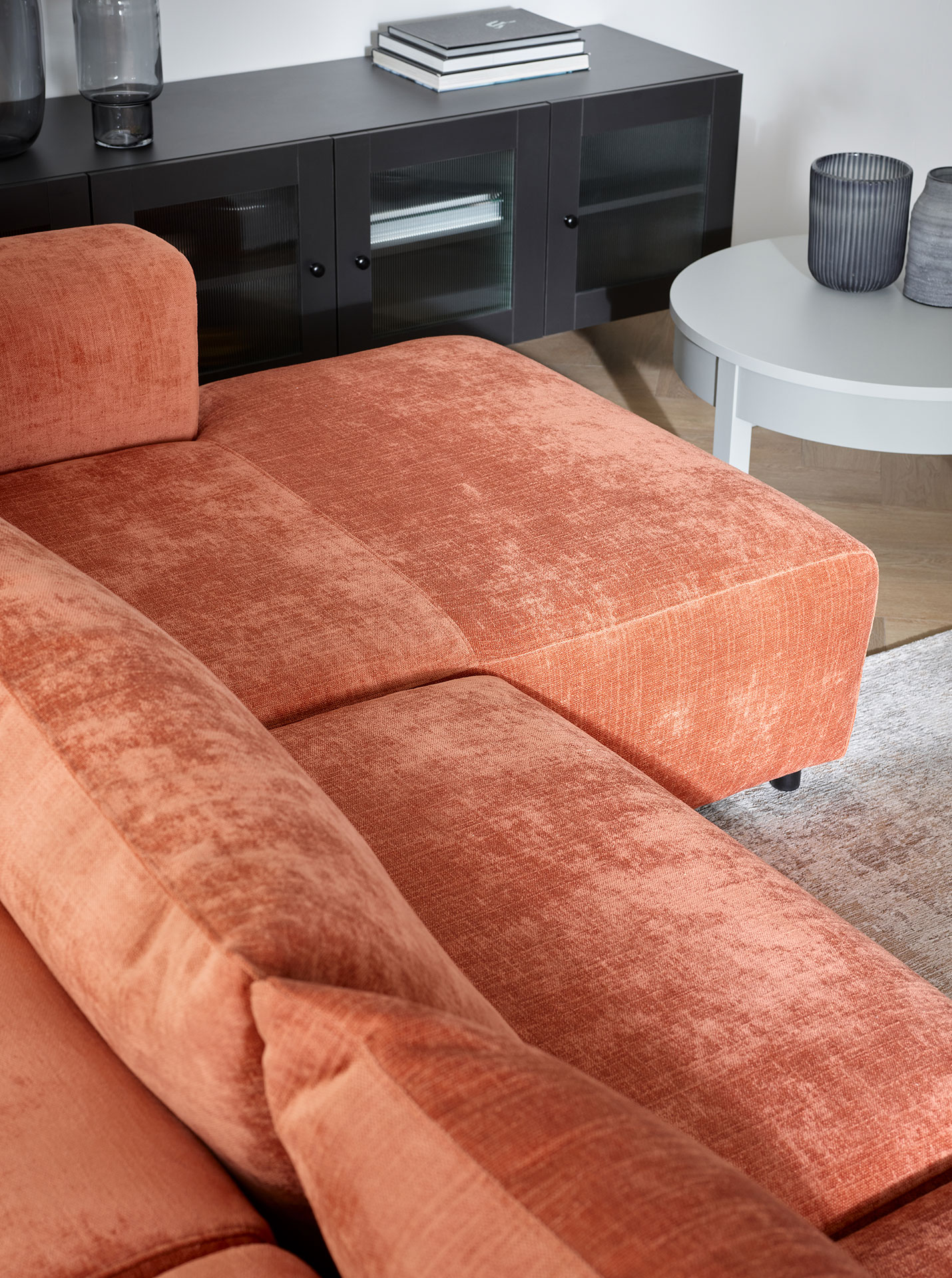 - The corner sofa has low wooden legs in black.
