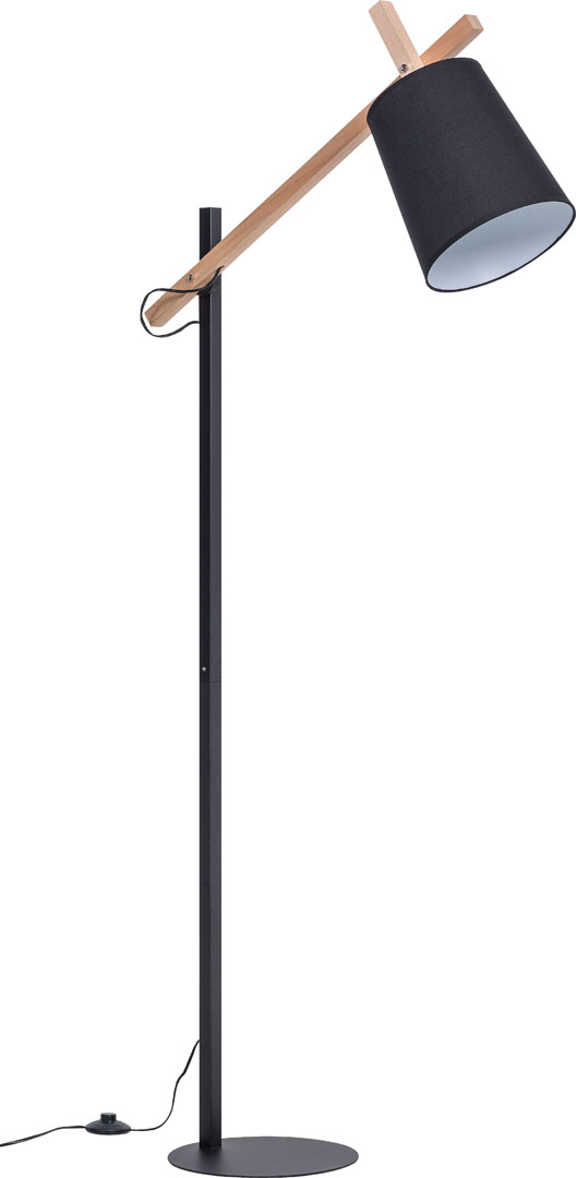 The floor lamp has a 70 cm long wooden arm and a 140 cm high metal base.