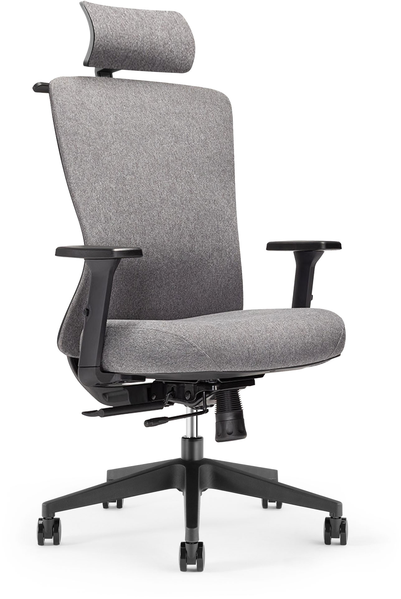 - Seat, backrest and headrest finished with durable gray melange fabric, resistant to wear and tear.