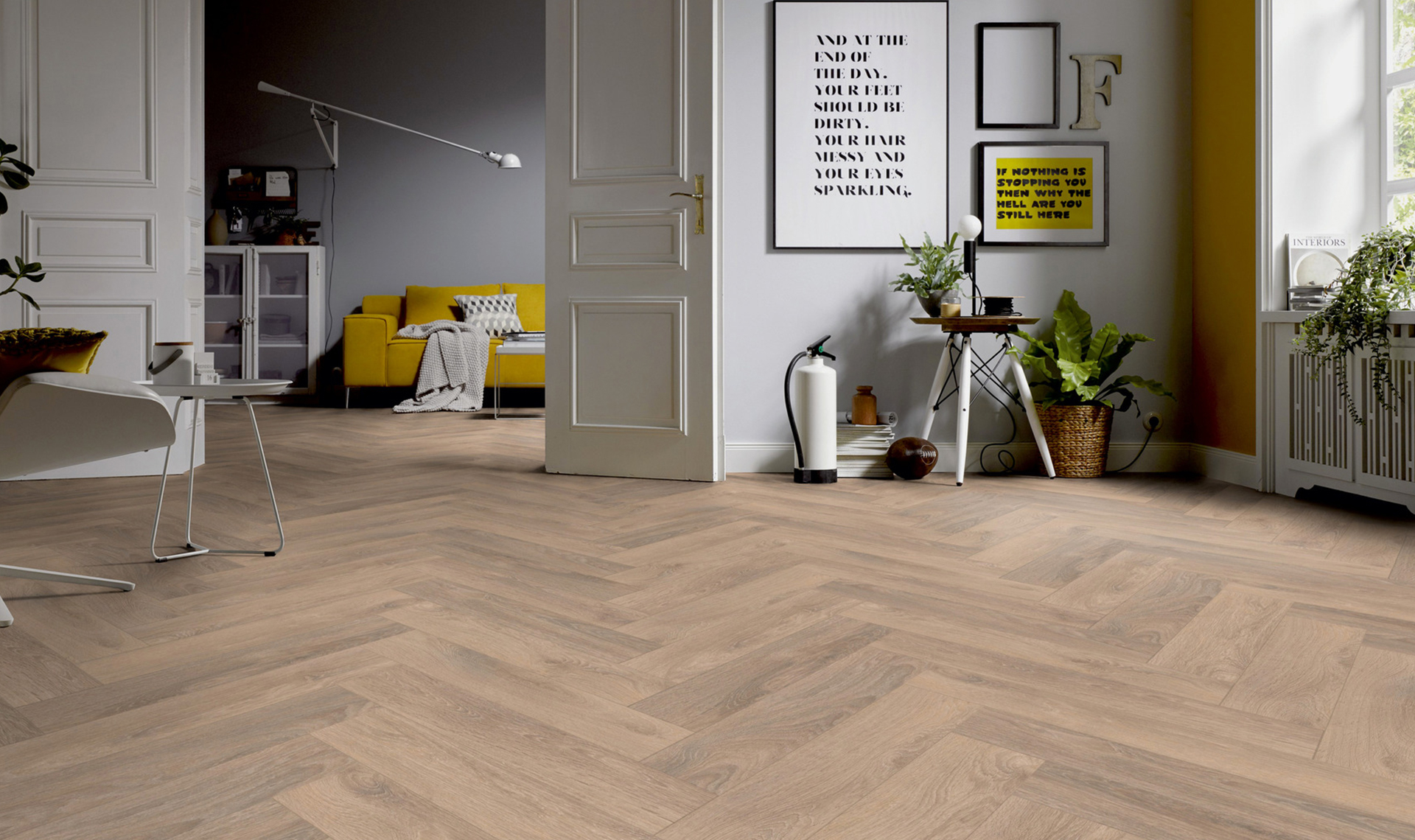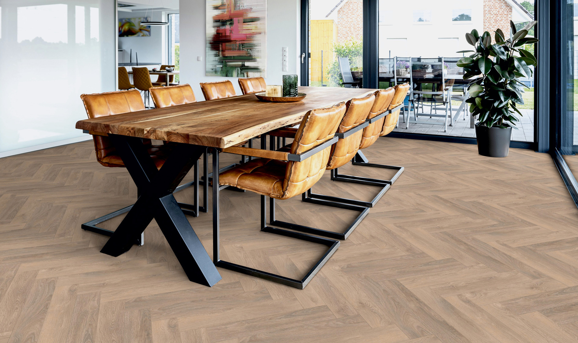 Panele podłogowe Ter Hürne Herringbone Edition Dąb Chalet to stylowe rozwiązanie w klasycznym wzorze jodełki (630 × 126 × 10 mm), które wprowadza do wnętrza elegancki i przytulny charakter. Mają matową powierzchnię z delikatną porowatością, 4‑stronną V‑fugę oraz wysoką klasę ścieralności AC5 i klasę użytkowania 23/32, co czyni je trwałym wyborem na lata. Dzięki systemowi SmartConnect HB montaż jest szybki i intuicyjny, a możliwość stosowania z ogrzewaniem podłogowym zwiększa ich funkcjonalność. To doskonała propozycja dla osób ceniących połączenie naturalnego wyglądu drewna z nowoczesną technologią użytkowania.