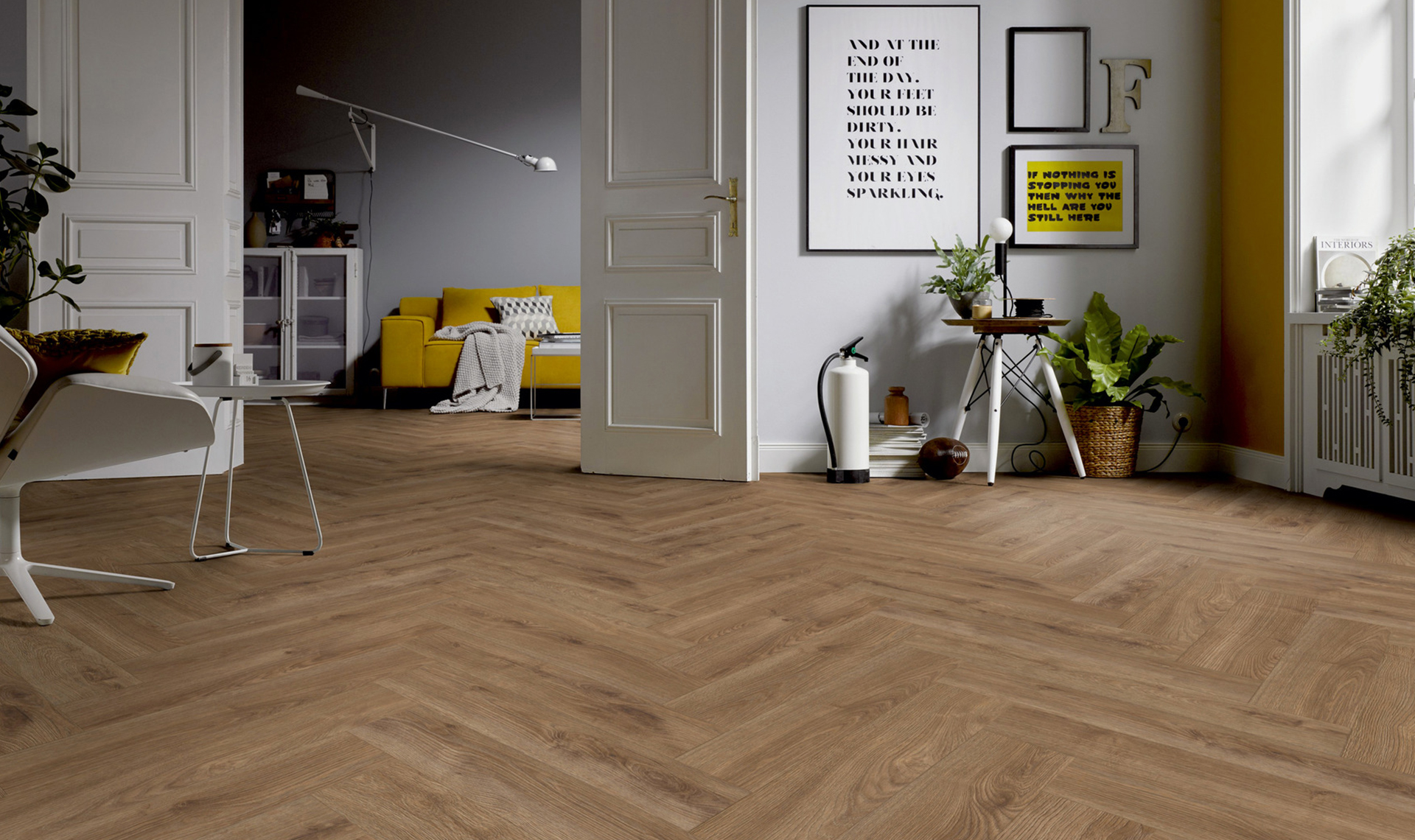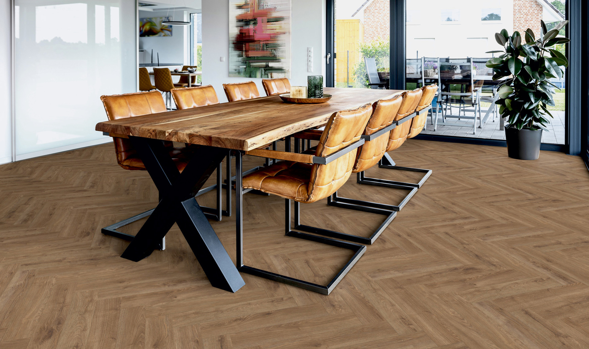 Panele podłogowe Ter Hürne Herringbone Edition Dąb Lodge to wysokiej klasy rozwiązanie w klasycznym wzorze jodełki, które wnosi do wnętrza elegancję i przytulność dzięki ciepłej, dębowej kolorystyce oraz matowej powierzchni. Oferują one format 630 × 126 × 10 mm z czterostronną V‑fugą i połączeniem SmartConnect HB, co ułatwia montaż „na pływająco”. Produkt objęty jest klasą ścieralności AC5, klasą użytkowania 23/32 oraz gwarancją 25 lat, co świadczy o jego trwałości i odporności na intensywne użytkowanie. Dodatkowo panele nadają się do stosowania z ogrzewaniem podłogowym oraz mają właściwości antybakteryjne, co czyni je praktycznym wyborem dla wymagających wnętrz.