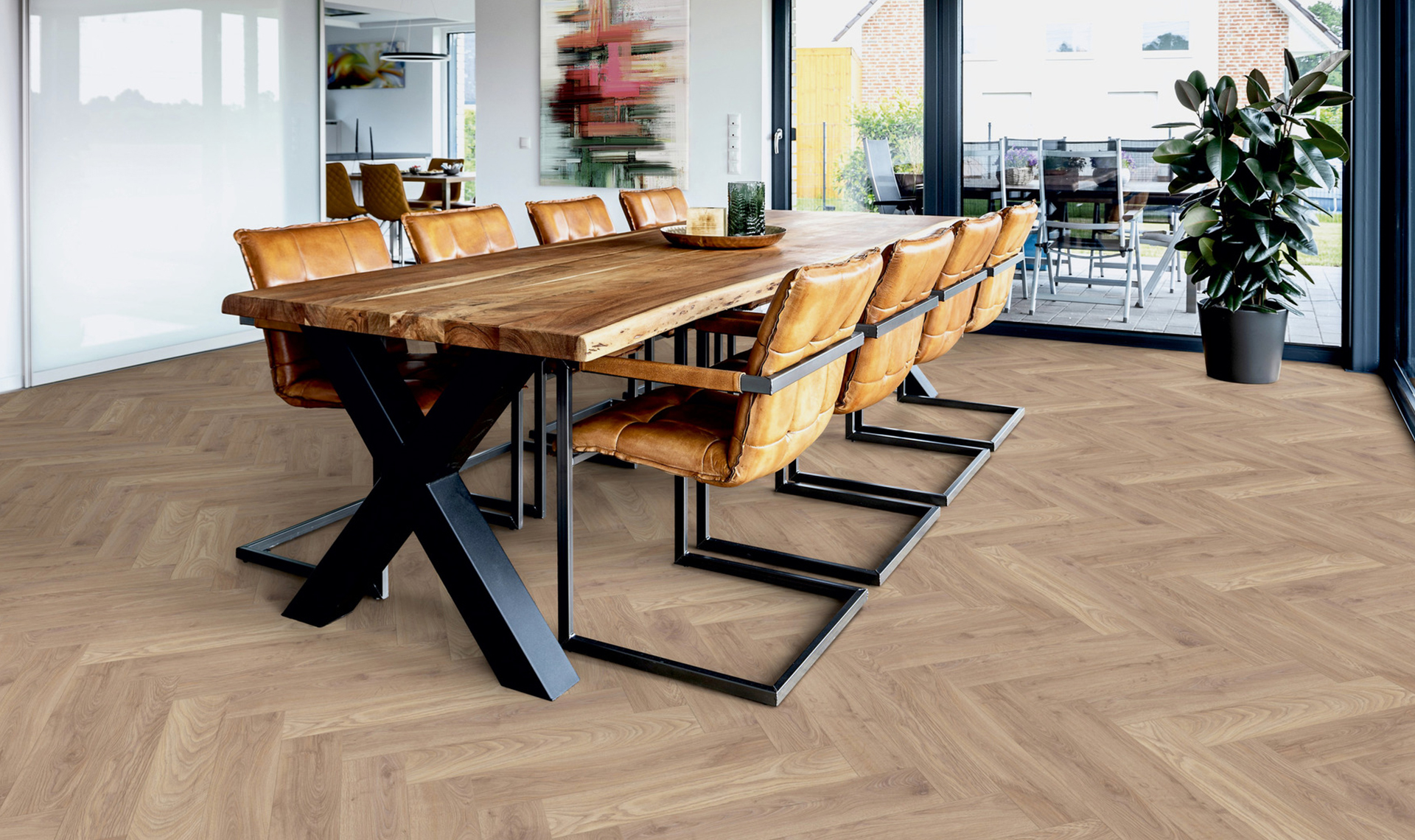Panele podłogowe Ter Hürne Herringbone Edition Dąb Maisonette to elegancka podłoga w klasycznym wzorze jodełki, łącząca ponadczasowy design z wysoką funkcjonalnością. Naturalny odcień dębu wprowadza do wnętrza ciepło i przytulną atmosferę, podkreślając styl zarówno nowoczesnych, jak i tradycyjnych aranżacji. Wysoka klasa ścieralności i solidna konstrukcja gwarantują trwałość, stabilność oraz odporność na intensywne użytkowanie. Dzięki łatwemu montażowi i możliwości zastosowania z ogrzewaniem podłogowym, panele stanowią praktyczne i estetyczne rozwiązanie dla każdego wnętrza.