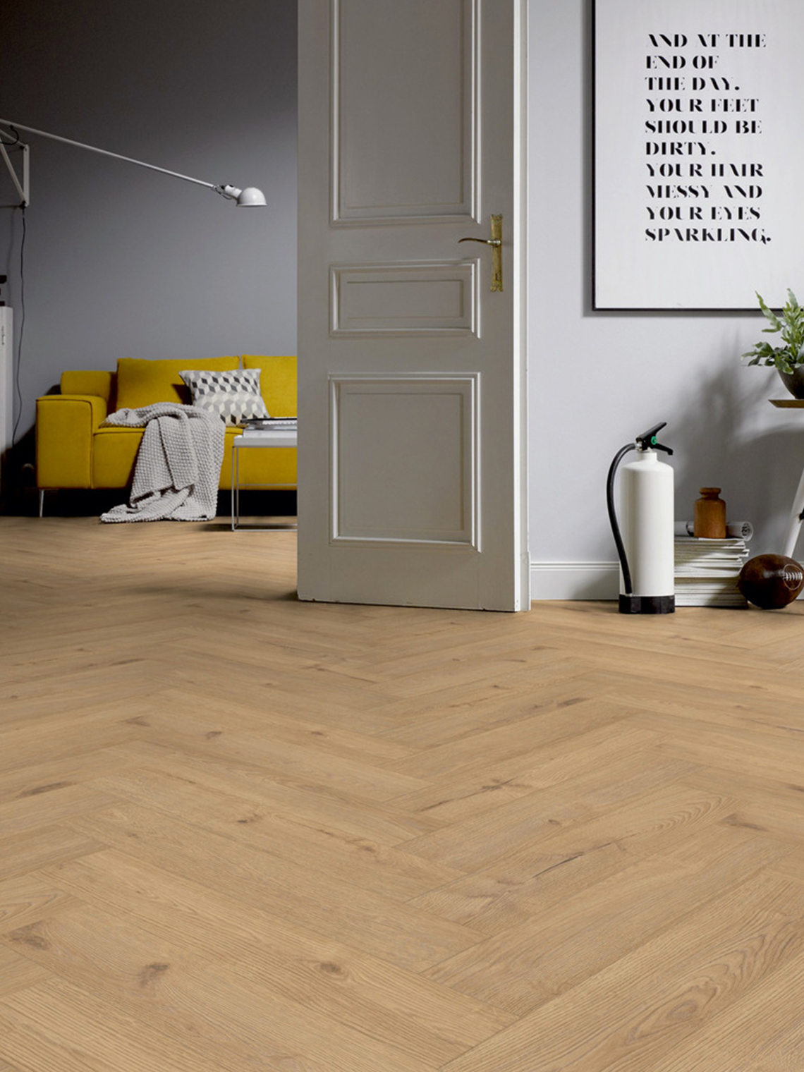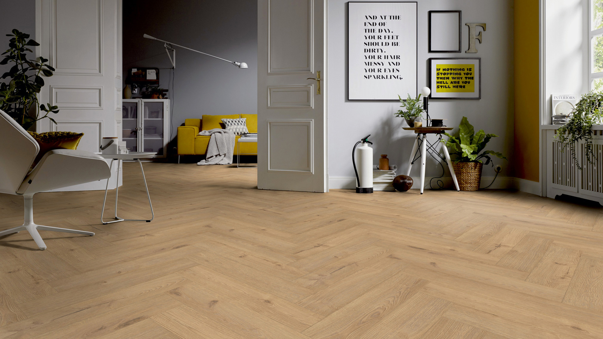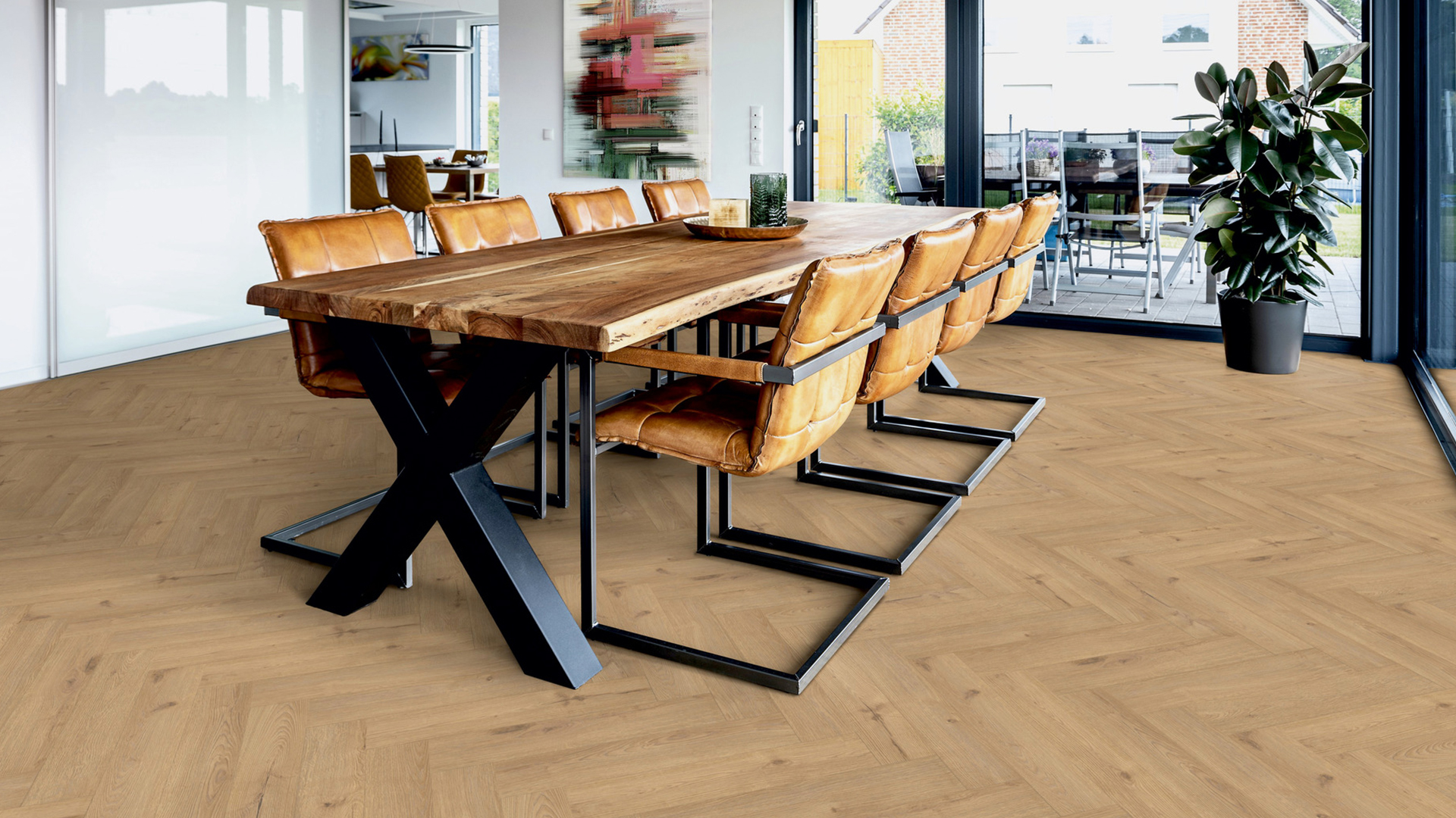 Panele podłogowe Ter Hürne Herringbone Edition Dąb Patio wyróżniają się eleganckim wzorem jodełki oraz ciepłym odcieniem dębu, który nadaje wnętrzu przytulny, a jednocześnie stylowy wygląd. Mają grubość 10 mm i format 630 × 126 mm, wyposażone są w czterostronną V‑fugę oraz połączenie SmartConnect HB – co ułatwia montaż „na pływająco”. Produkt charakteryzuje się klasą ścieralności AC5 oraz klasą użytkowania 23/32, dzięki czemu świetnie sprawdzi się zarówno w przestrzeni mieszkalnej, jak i użytkowej. Ponadto panele nadają się do instalacji z ogrzewaniem podłogowym, są odporne na wilgoć i wyposażone w powierzchnię antybakteryjną – co czyni je funkcjonalnym i nowoczesnym wyborem.